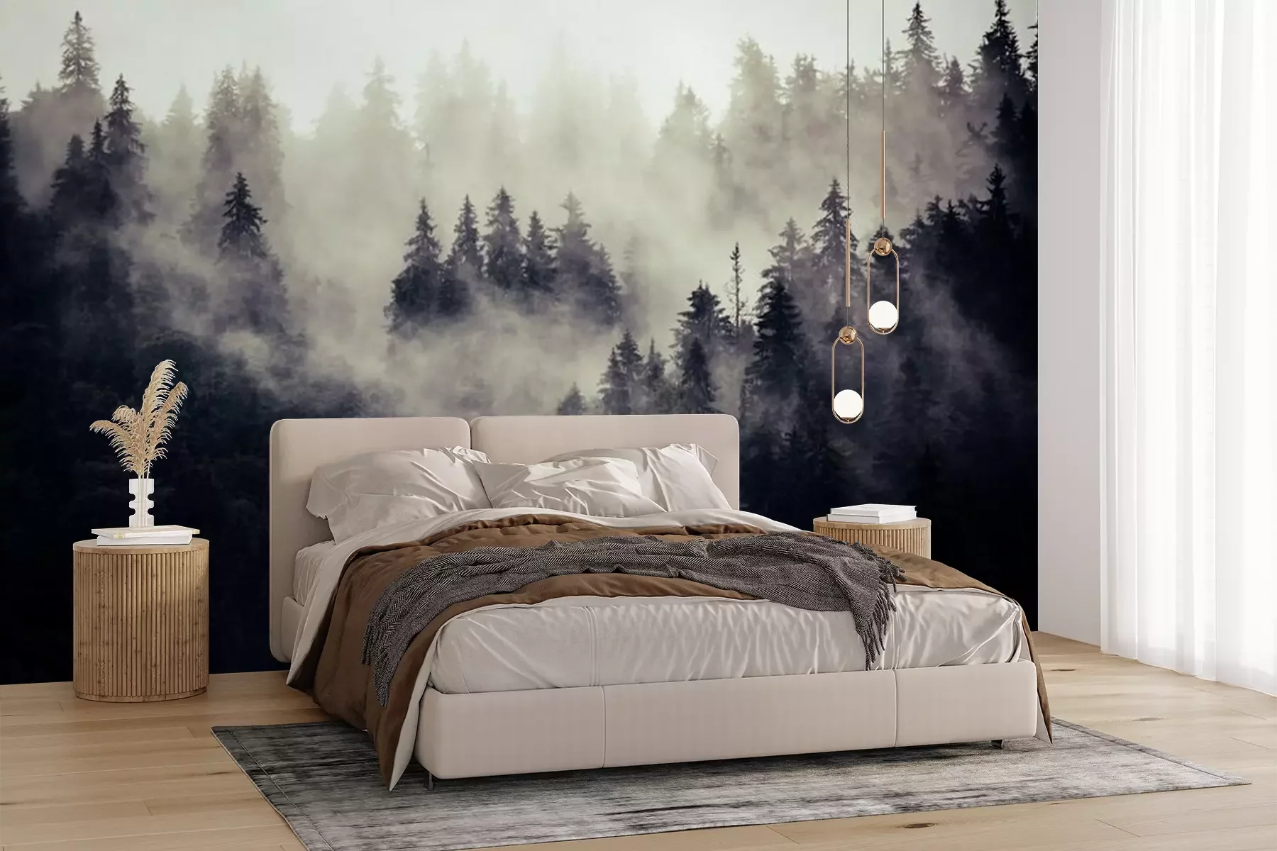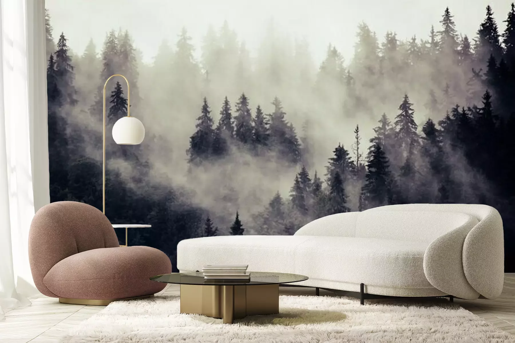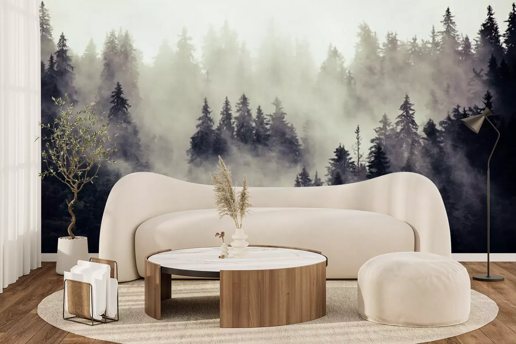 Rosa nebel über dem waldFototapete