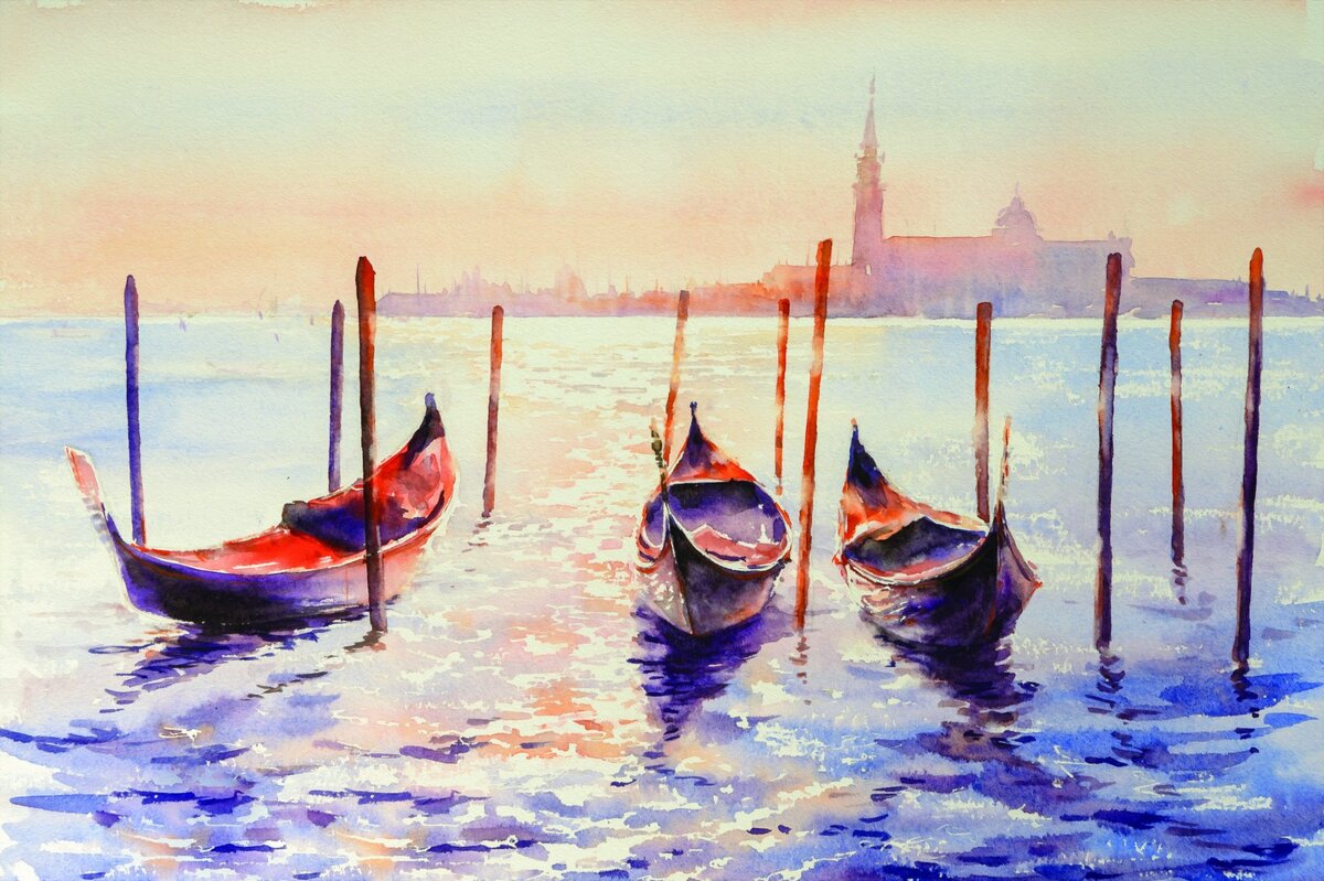 Gemalte gondeln auf dem wasser mit sonnenuntergang