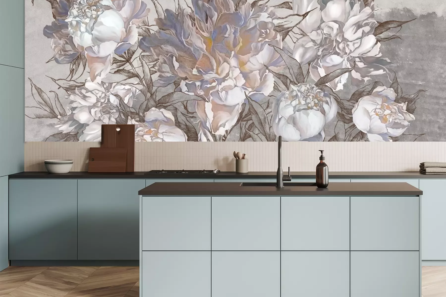 Das Material Premium+ besteht aus einer strukturierten Vinyl-Oberschicht und einem Trägermaterial (Vlies) mit einer Grammatur von 255 g/m², das kleine Unebenheiten der Wand zuverlässig kaschiert. Die feine Sandstruktur verleiht der Oberfläche eine luxuriöse Haptik, während das halbmatte Finish die Tiefe der Farben betont. Das Material ist dampfdurchlässig – so kann diese Fototapete auch in Küchen und Badezimmern eingesetzt werden. Die maximale Breite einer Tapetenbahn beträgt 100 cm. Bei größeren Abmessungen besteht die Fototapete aus mehreren gleich großen Bahnen. Der Kleber wird direkt auf die Wand aufgetragen, und die Fototapete wird auf Stoß angebracht, was für einen ästhetischen Effekt ohne sichtbare Fugen sorgt. Die Oberfläche ist pflegeleicht und kann bei Bedarf sanft mit einem feuchten Tuch abgewischt werden.