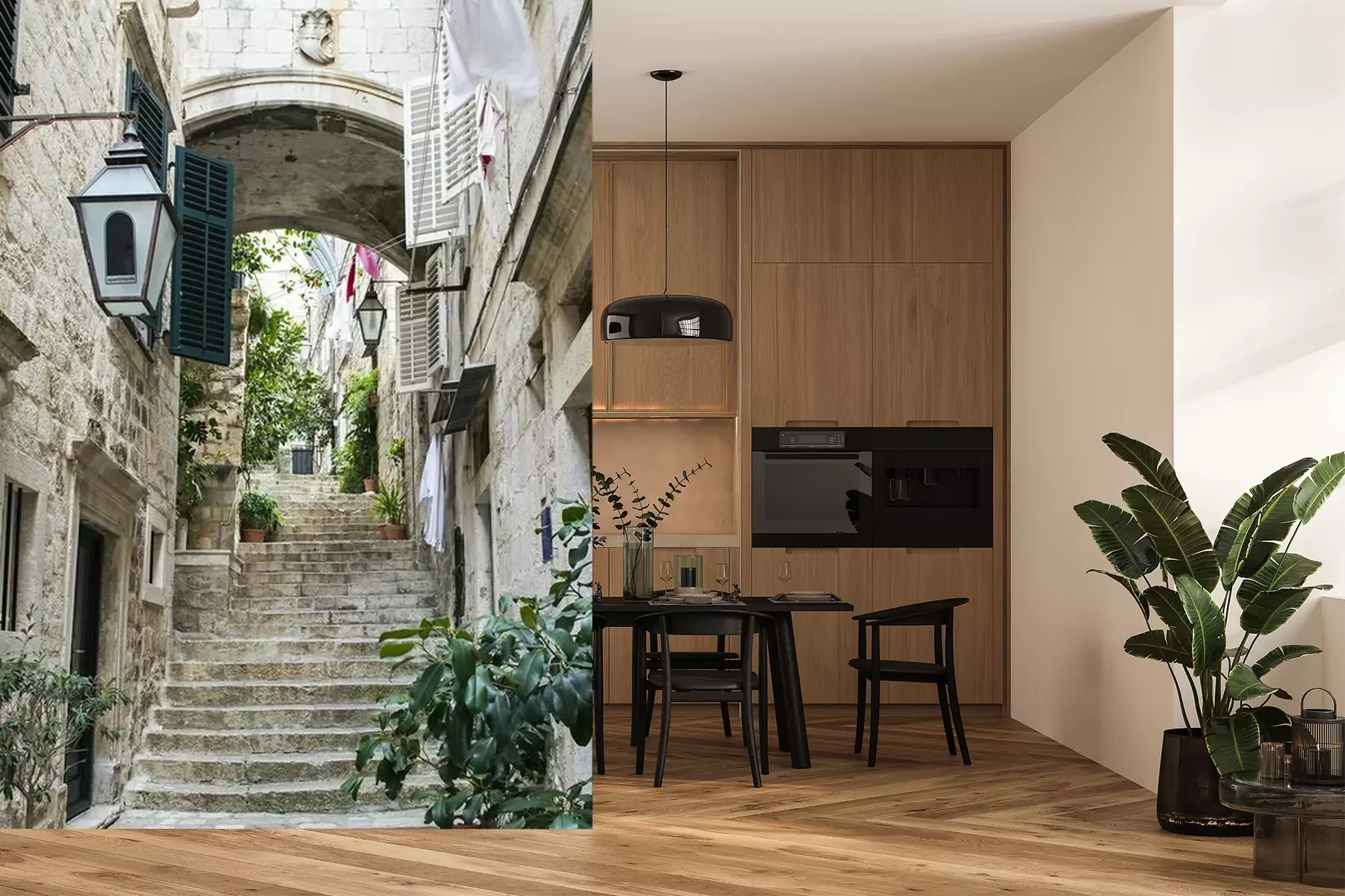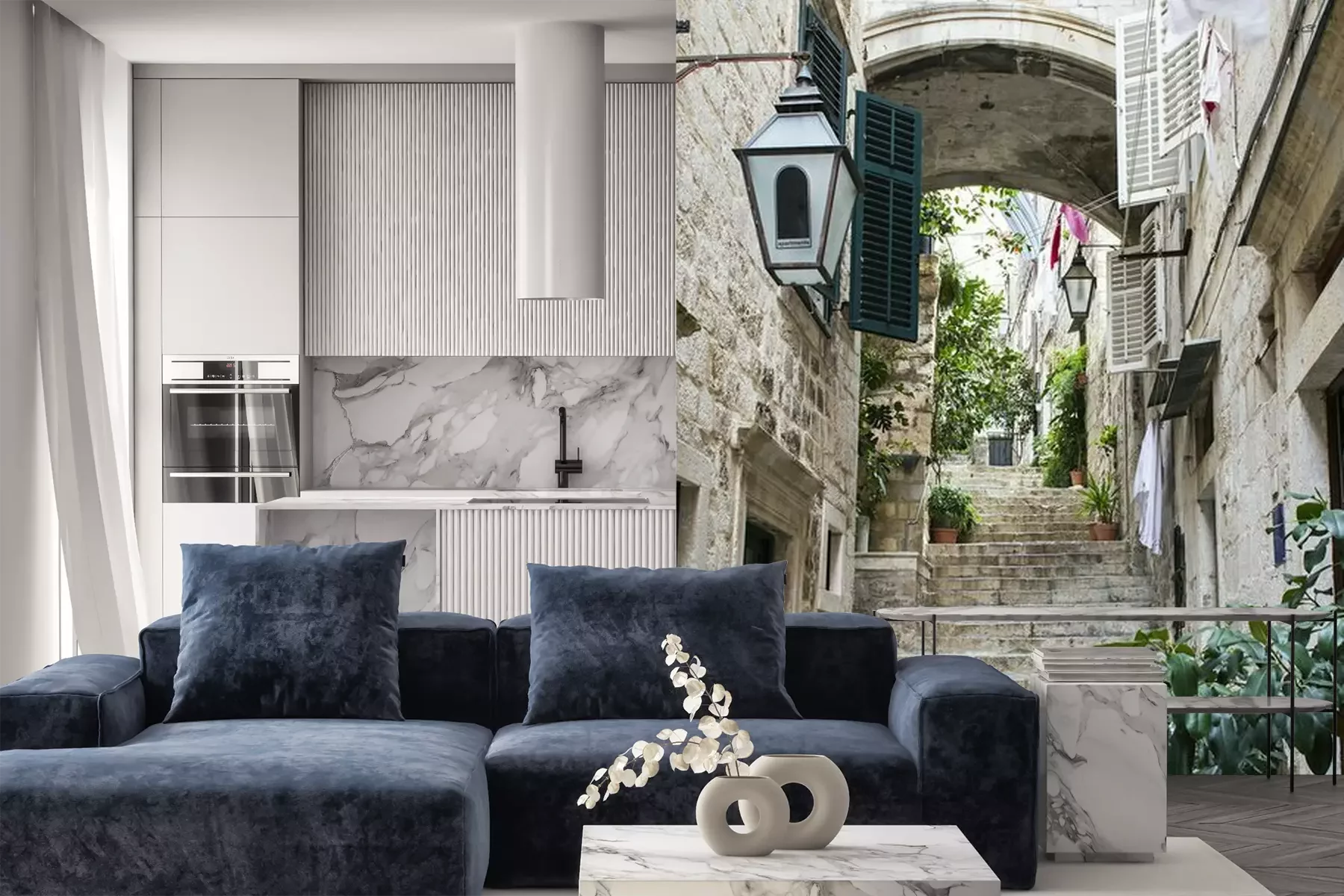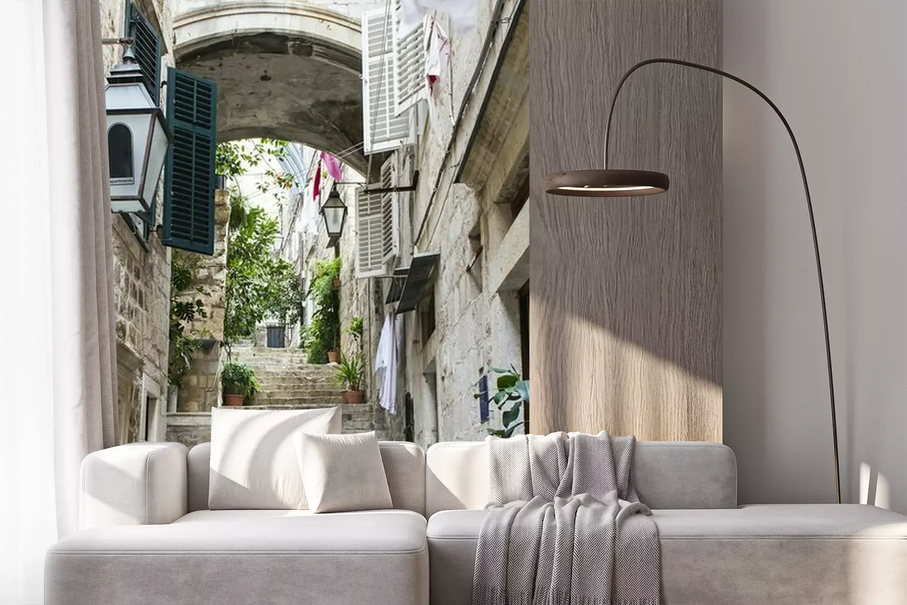 Fototapete Geöffnete Fensterläden über Treppe