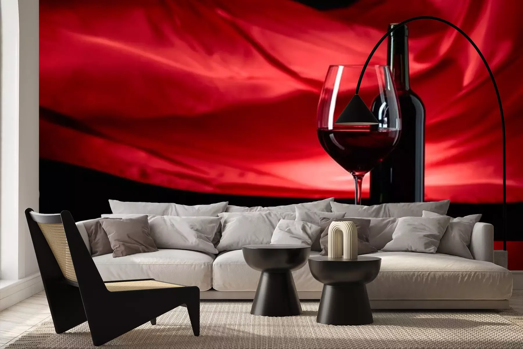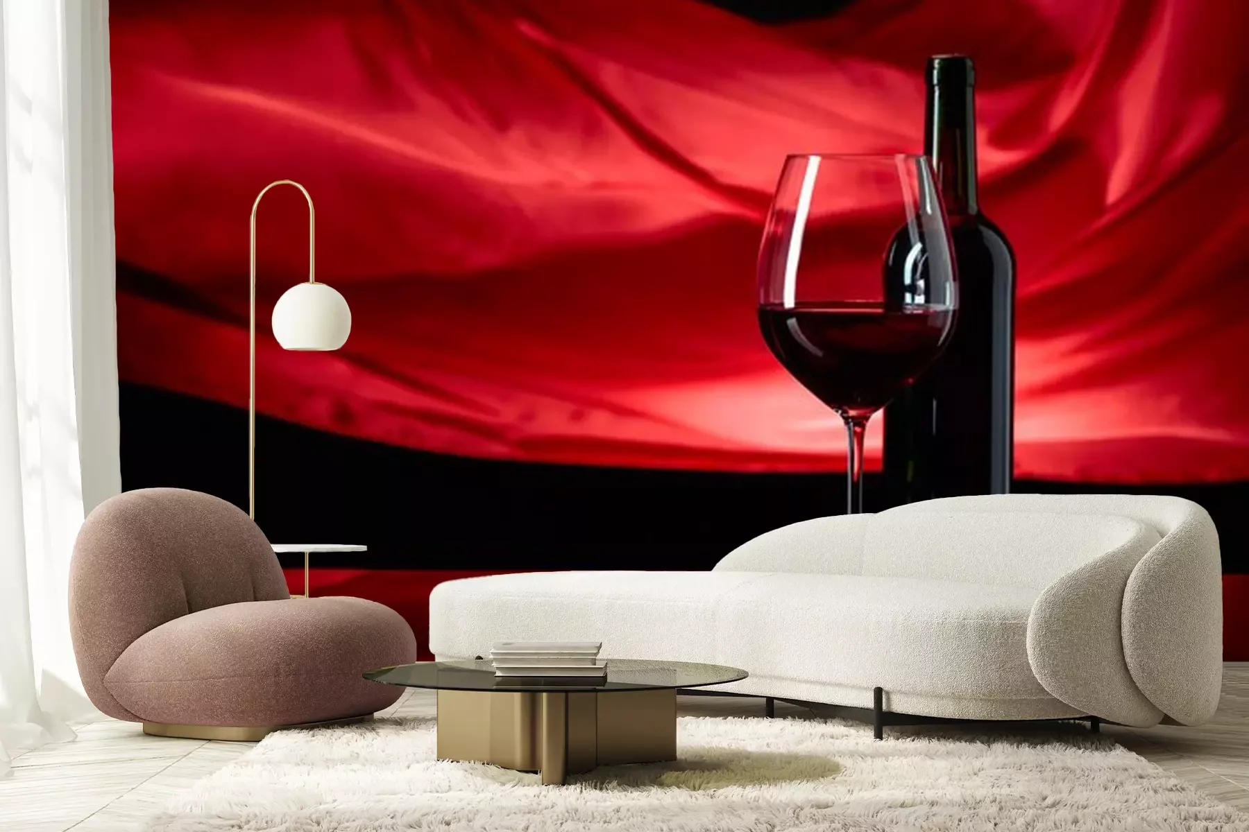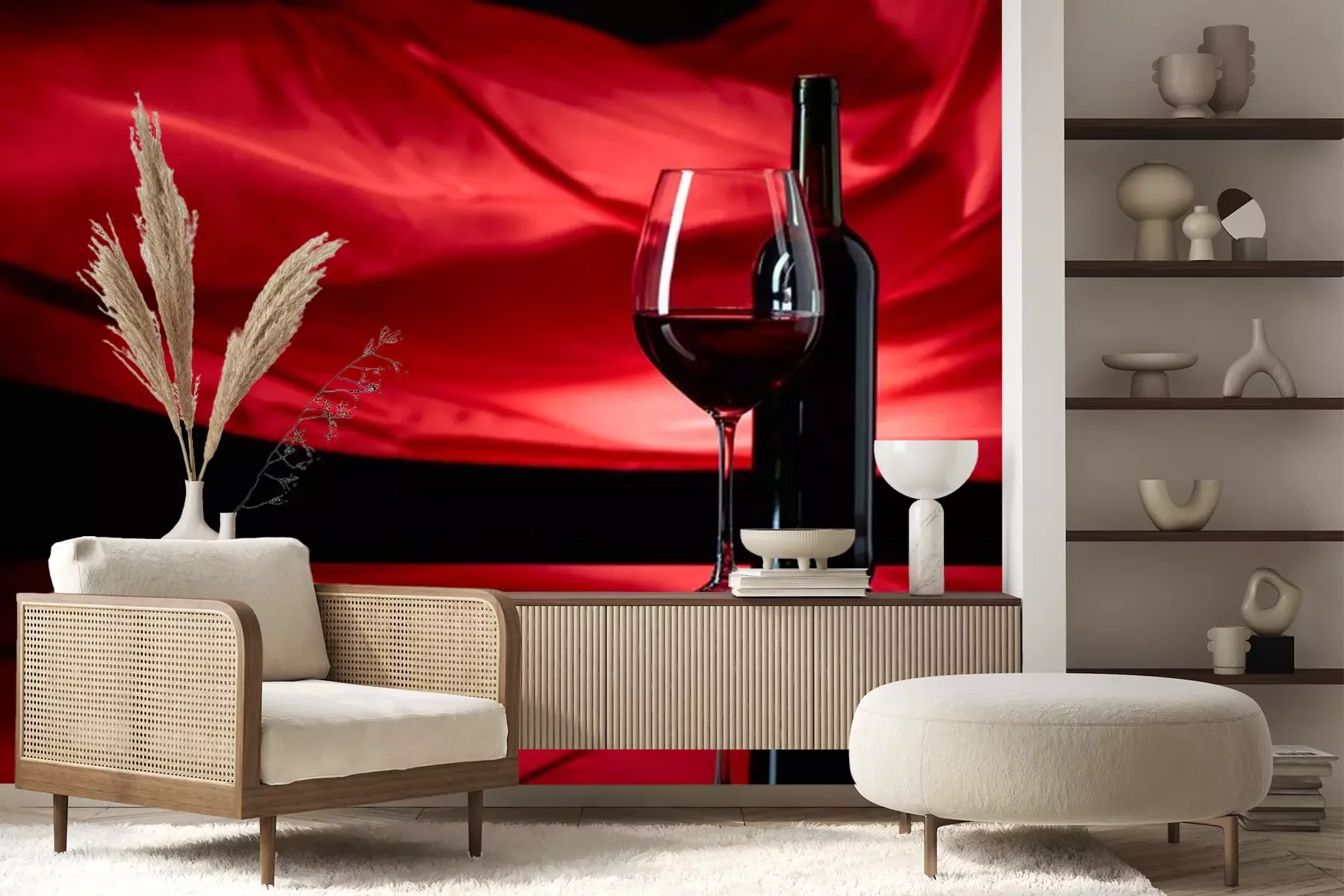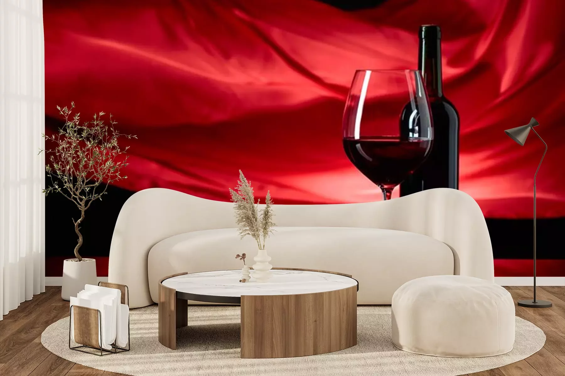 Fototapete Glas und Flasche Wein auf rotem Hintergrund