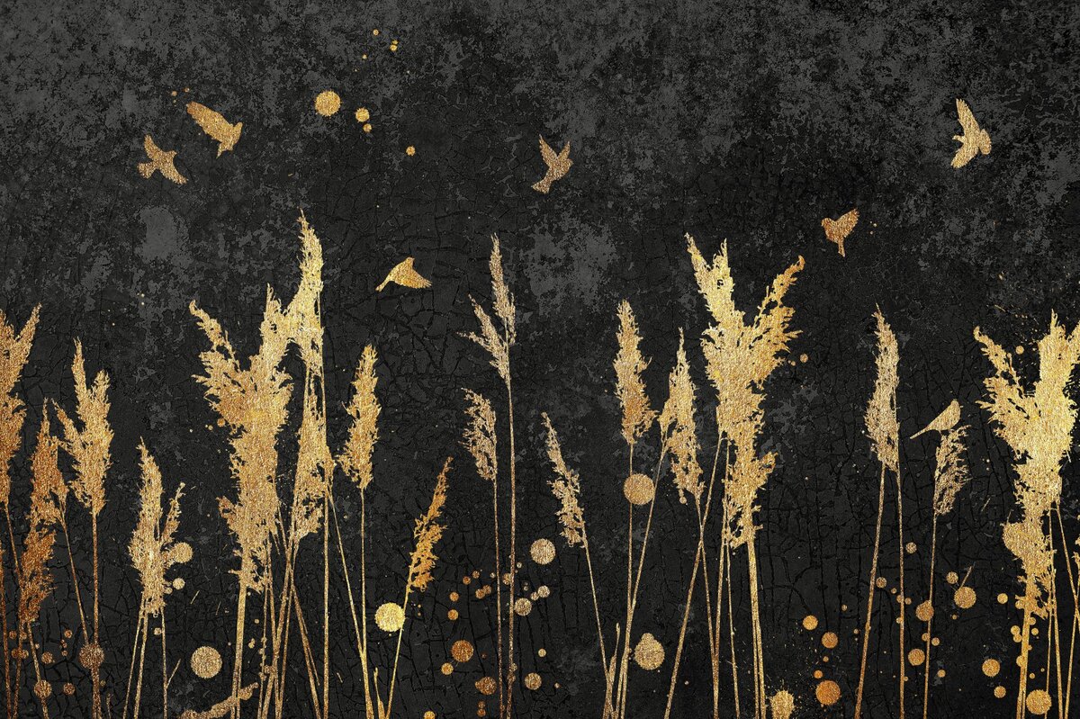 Fototapete: Gräser und Vögel auf schwarzem Betongrund