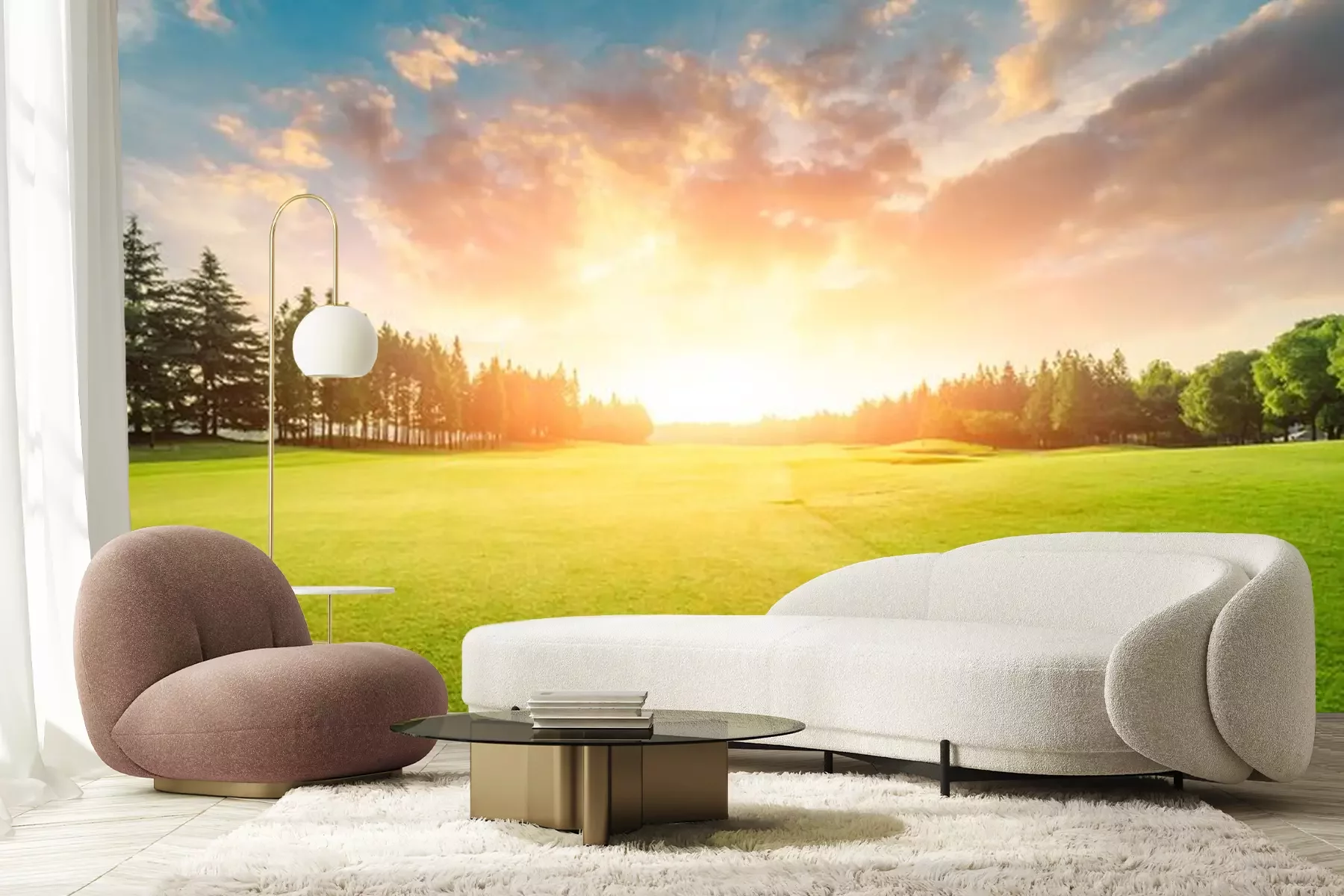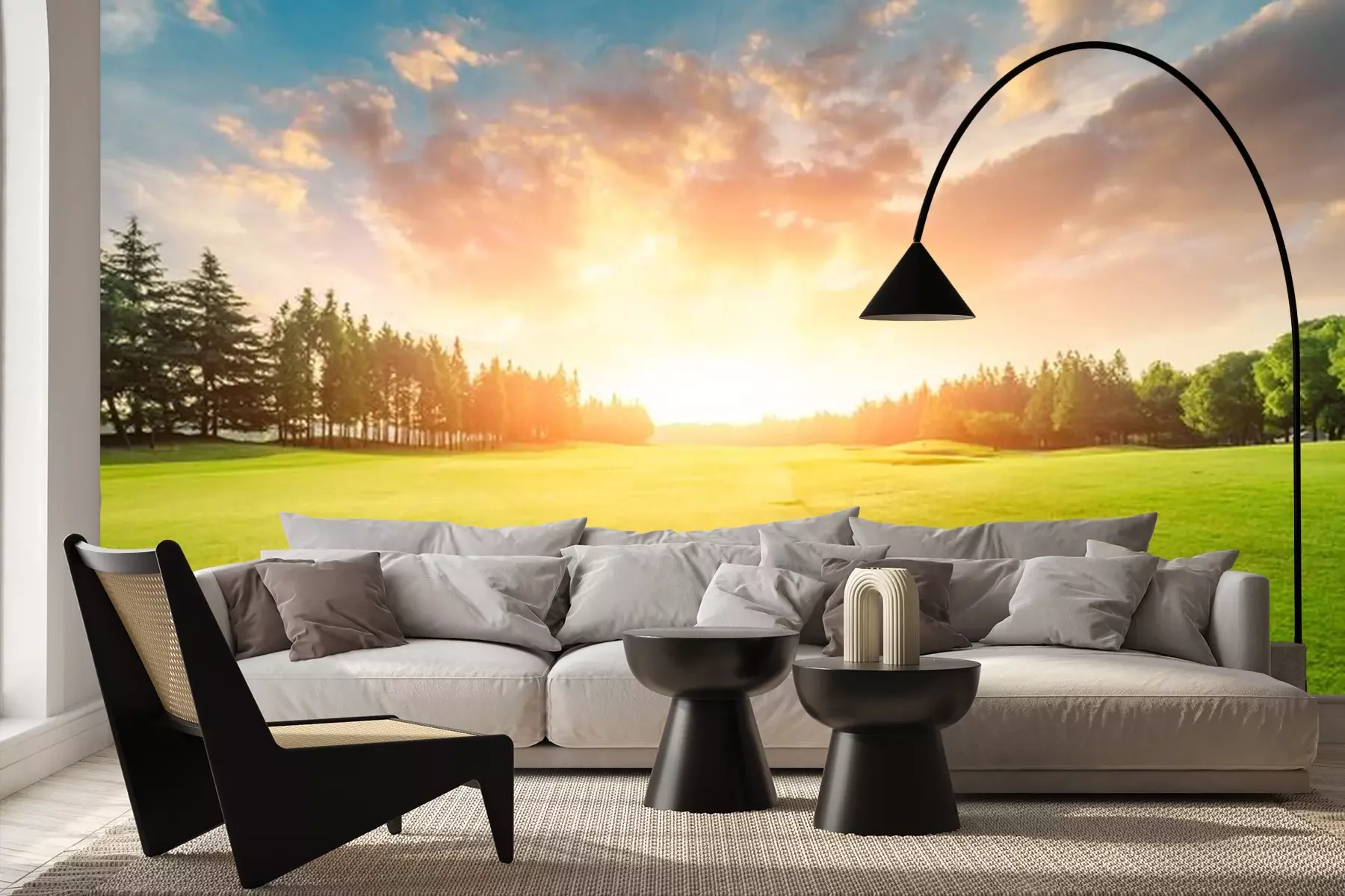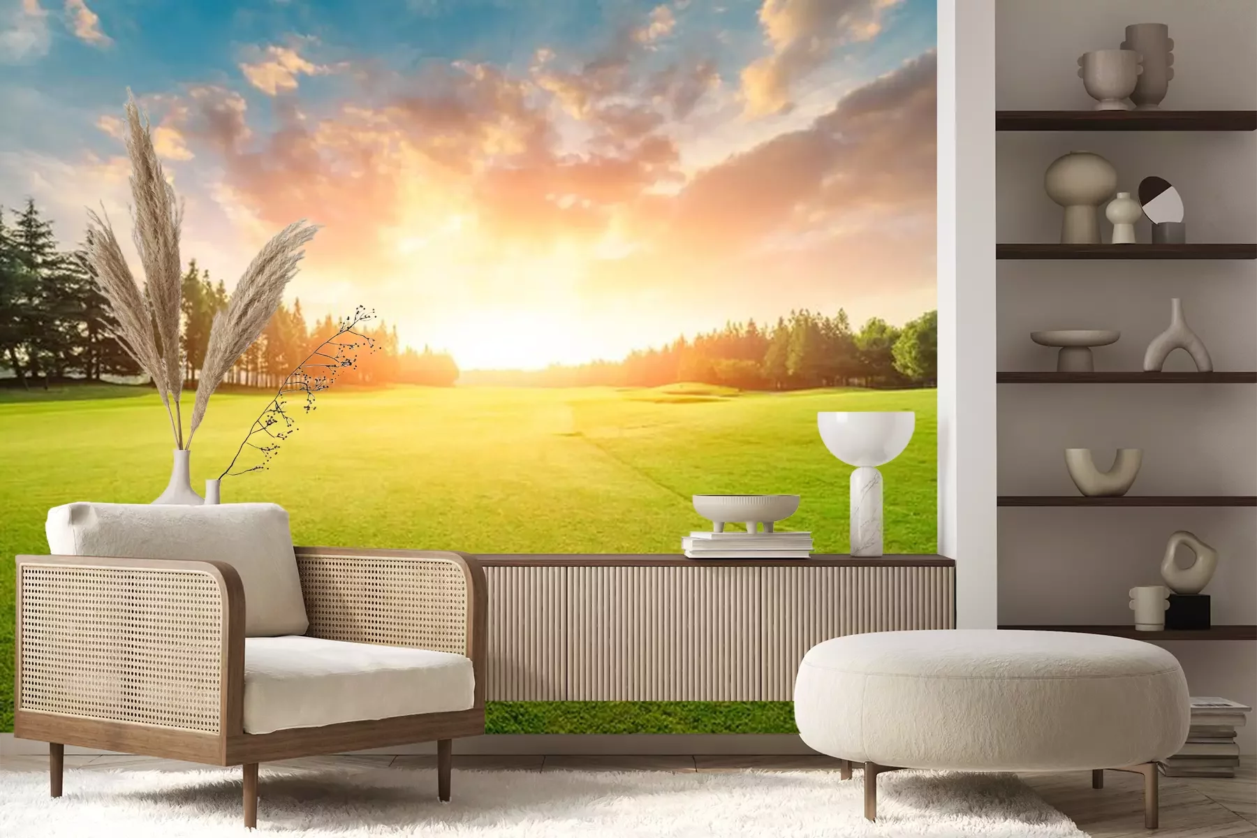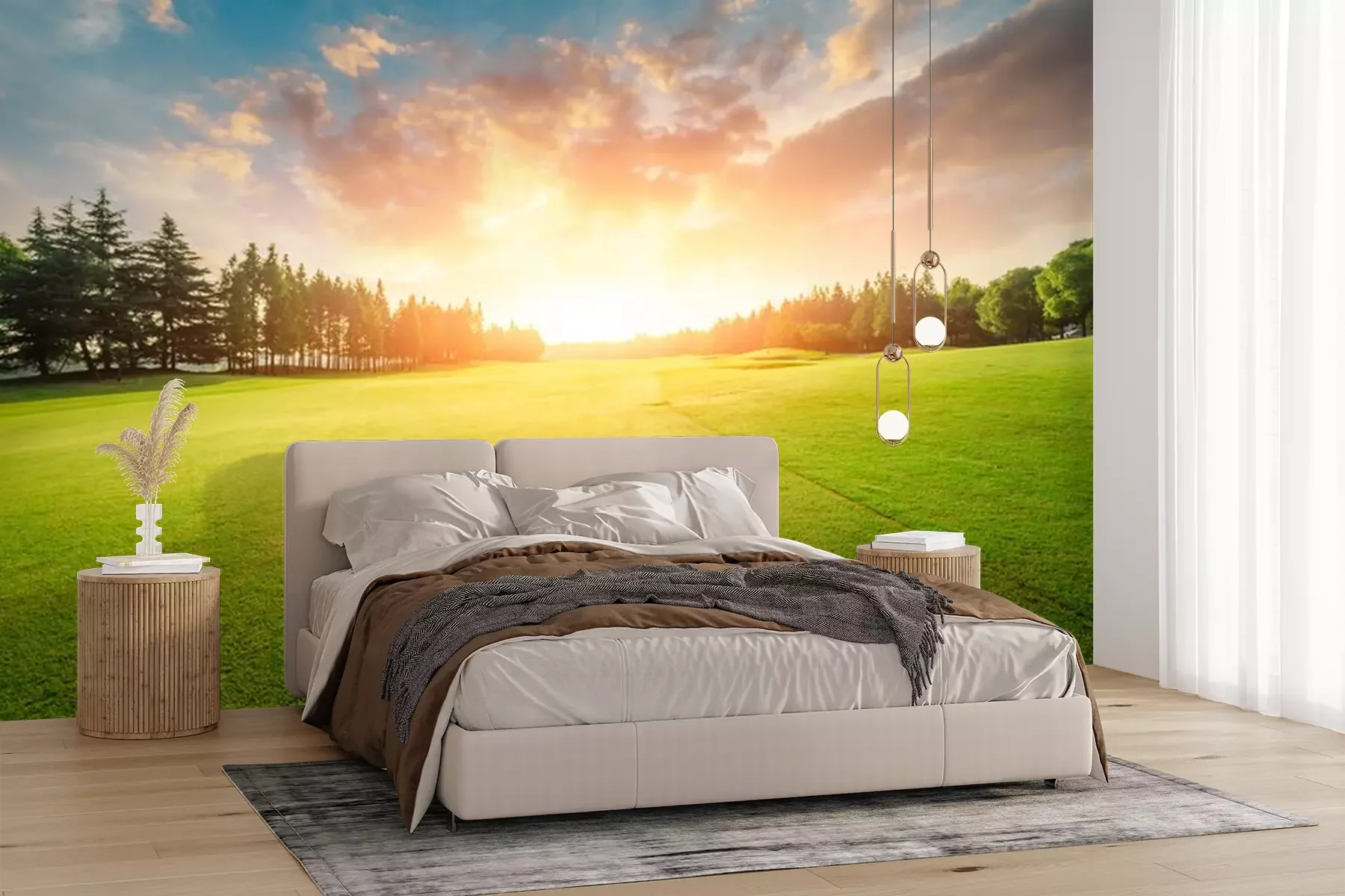 Fototapete Gras und Sonnenuntergang im Hintergrund