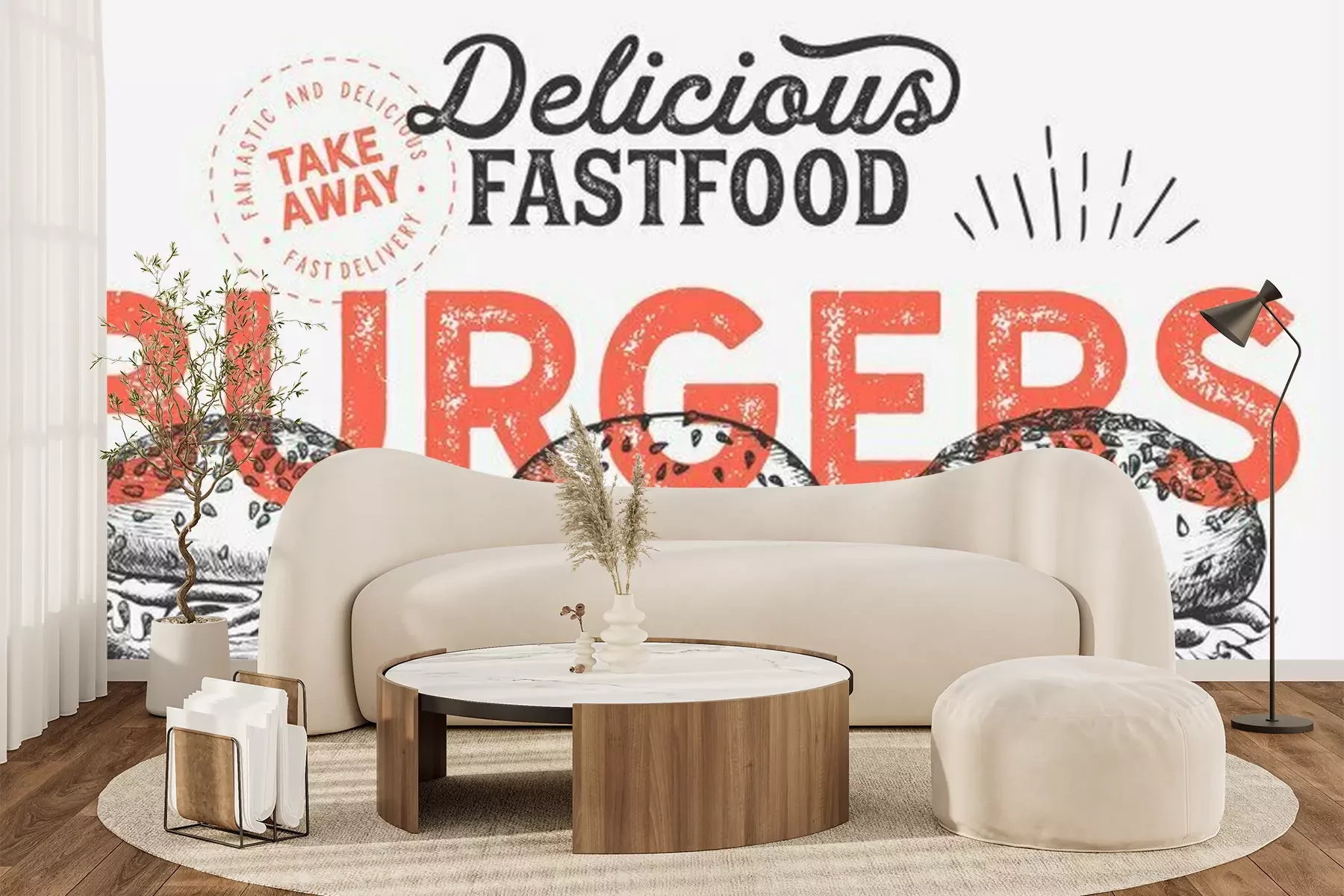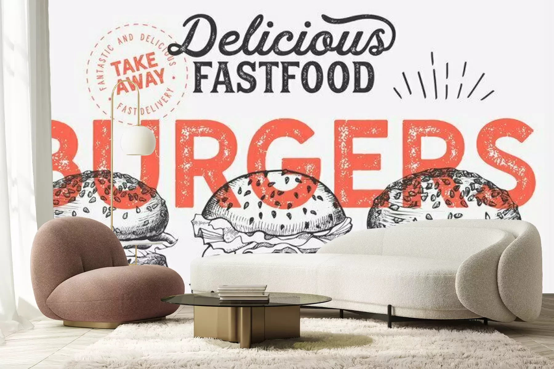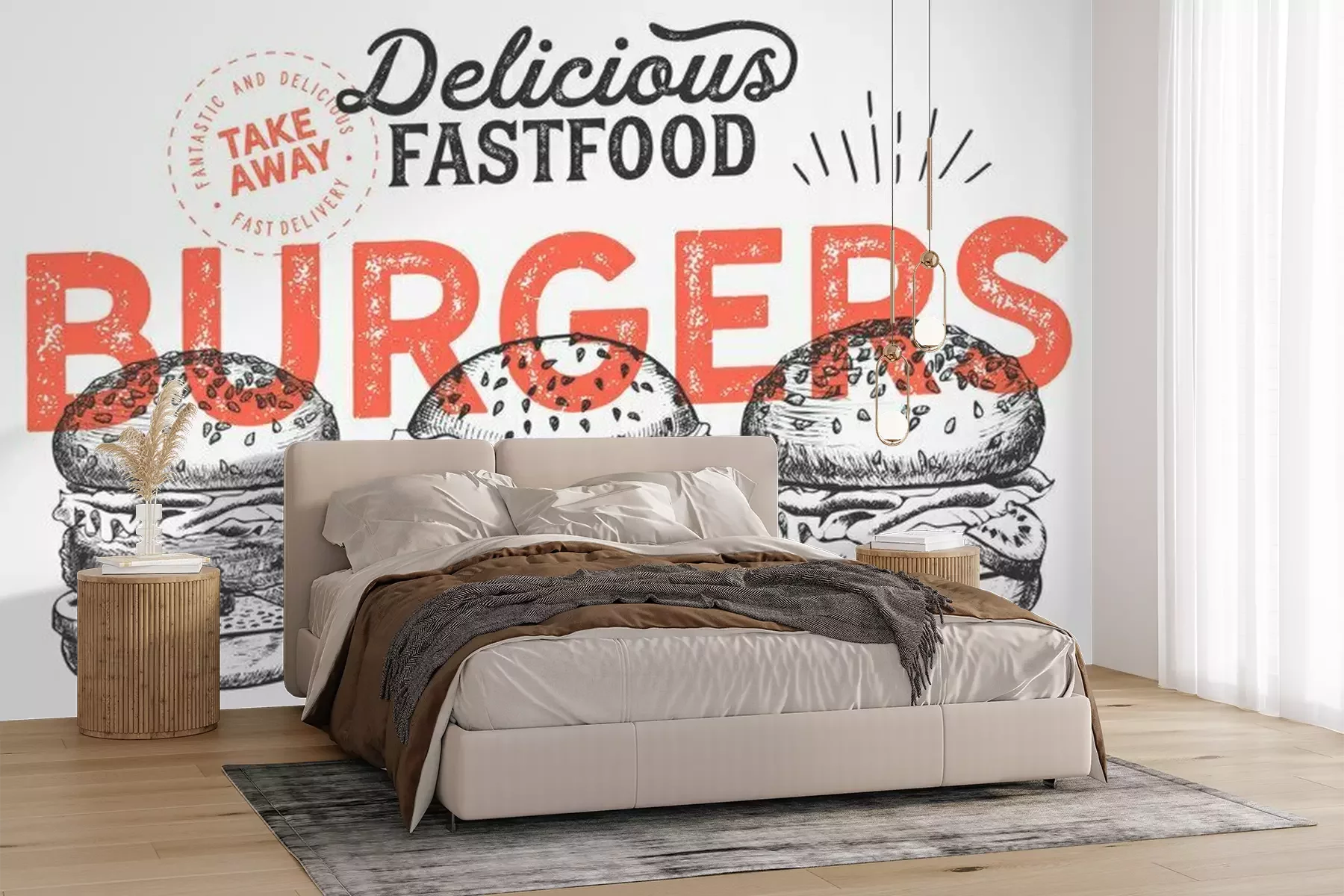 Fototapete Graue Burger und rote Inschrift