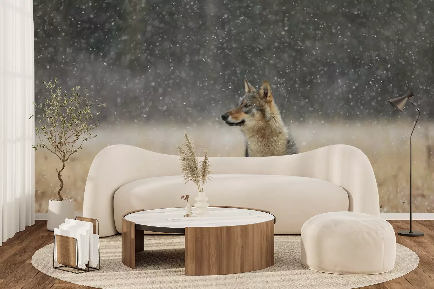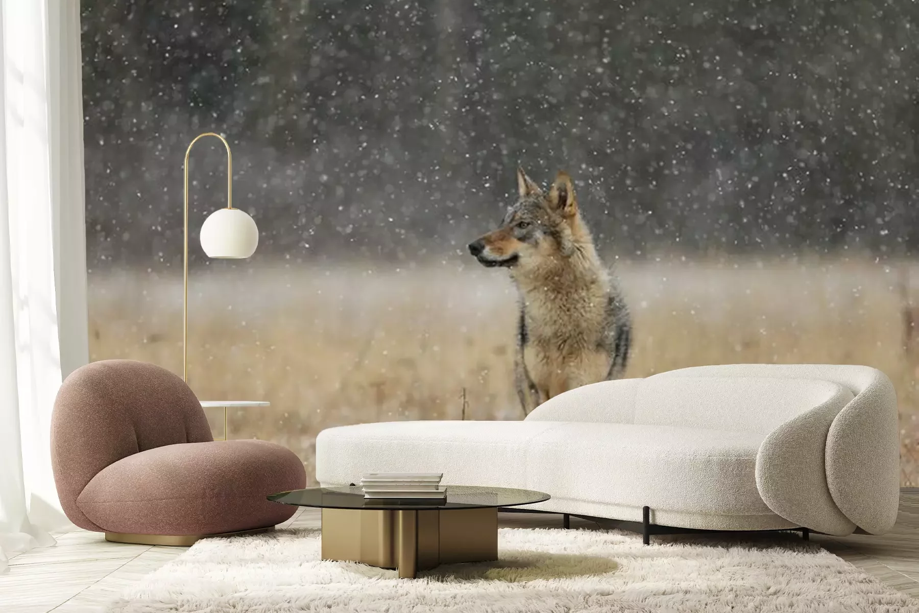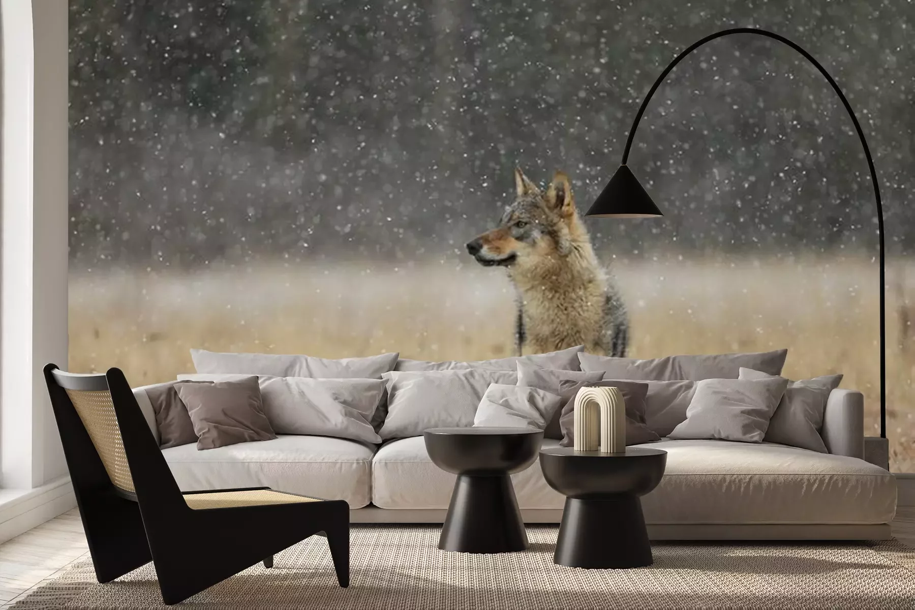 Fototapete Grauer Wolf auf einer Wiese wandernd