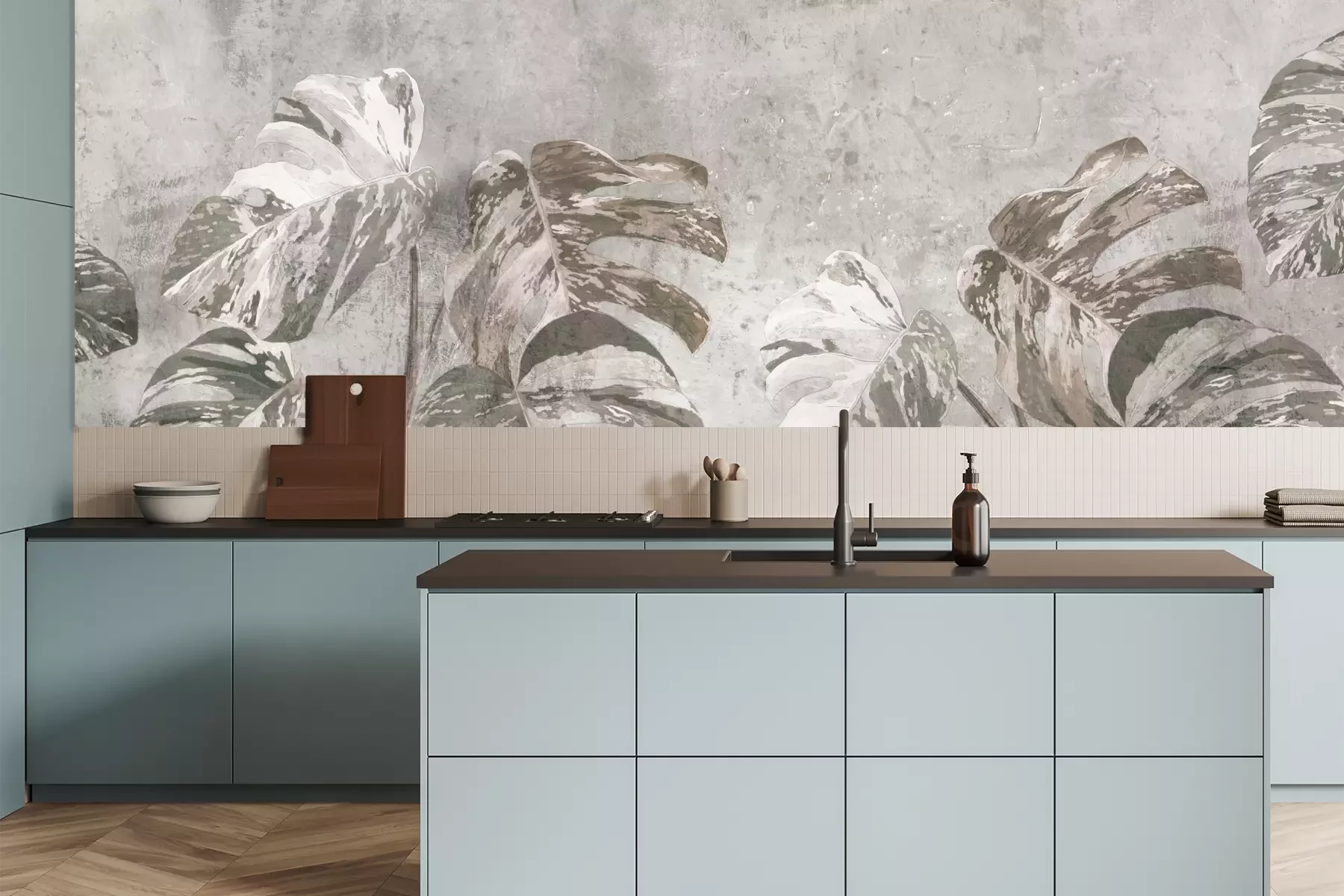 Das Material Premium+ besteht aus einer strukturierten Vinyl-Oberschicht und einem Trägermaterial (Vlies) mit einer Grammatur von 255 g/m², das kleine Unebenheiten der Wand zuverlässig kaschiert. Die feine Sandstruktur verleiht der Oberfläche eine luxuriöse Haptik, während das halbmatte Finish die Tiefe der Farben betont. Das Material ist dampfdurchlässig – so kann diese Fototapete auch in Küchen und Badezimmern eingesetzt werden. Die maximale Breite einer Tapetenbahn beträgt 100 cm. Bei größeren Abmessungen besteht die Fototapete aus mehreren gleich großen Bahnen. Der Kleber wird direkt auf die Wand aufgetragen, und die Fototapete wird auf Stoß angebracht, was für einen ästhetischen Effekt ohne sichtbare Fugen sorgt. Die Oberfläche ist pflegeleicht und kann bei Bedarf sanft mit einem feuchten Tuch abgewischt werden.