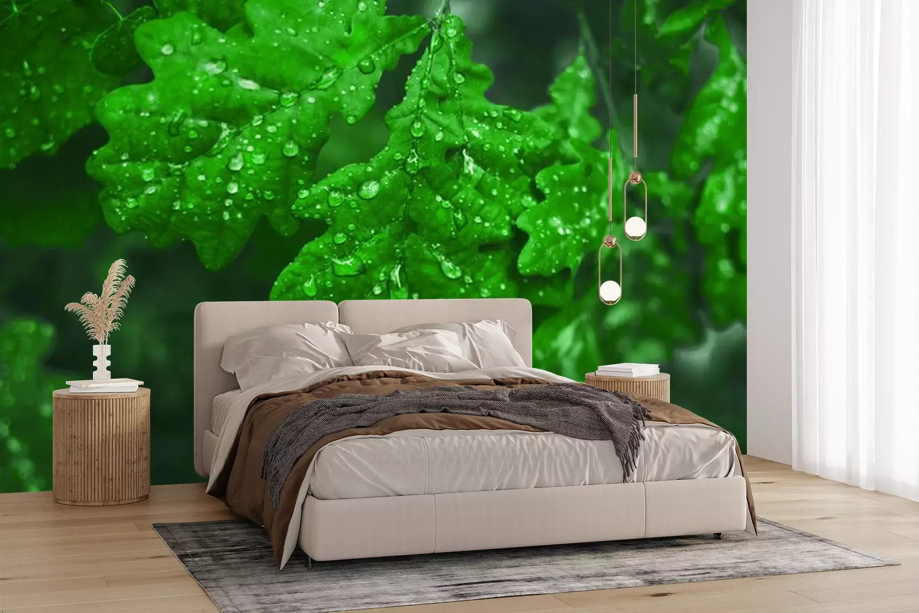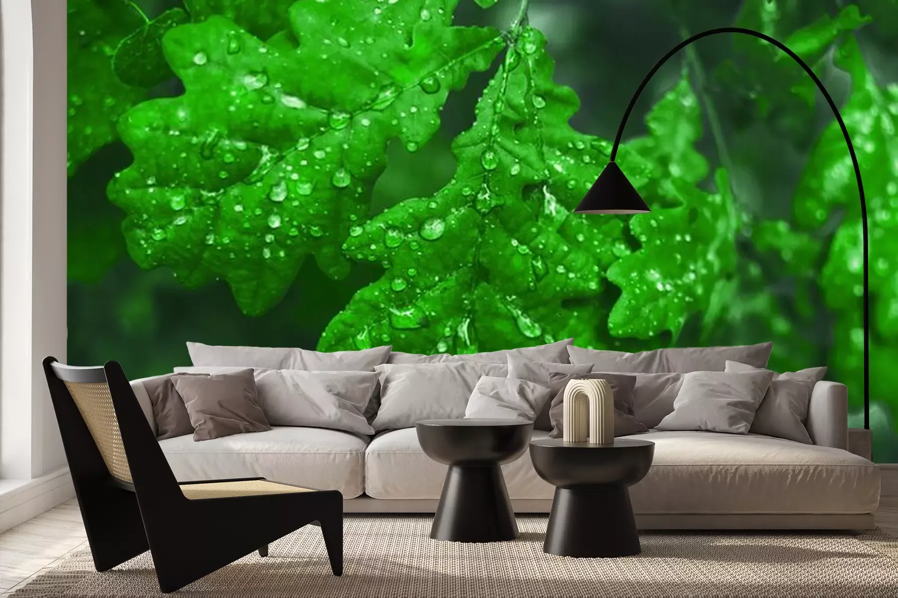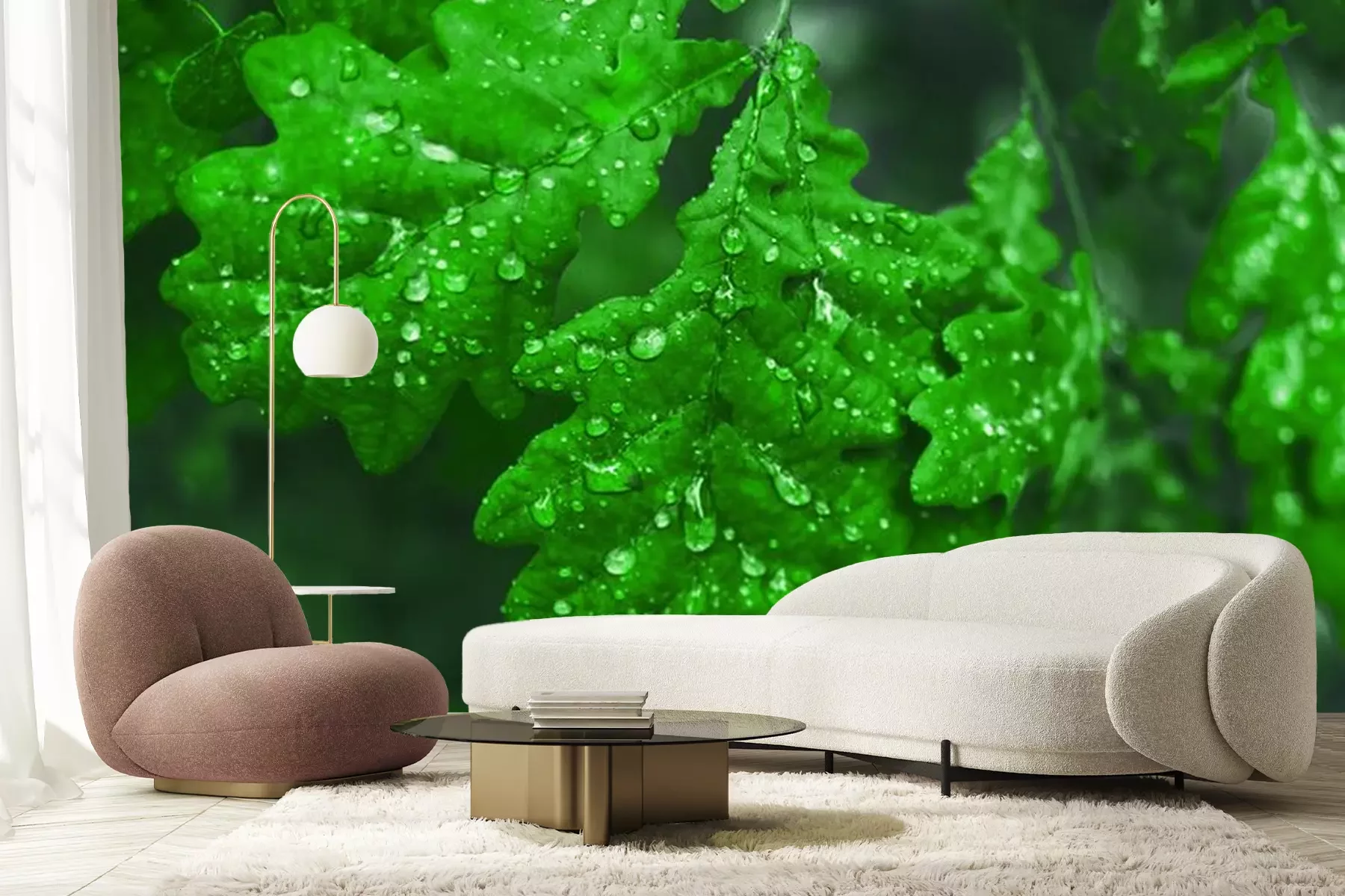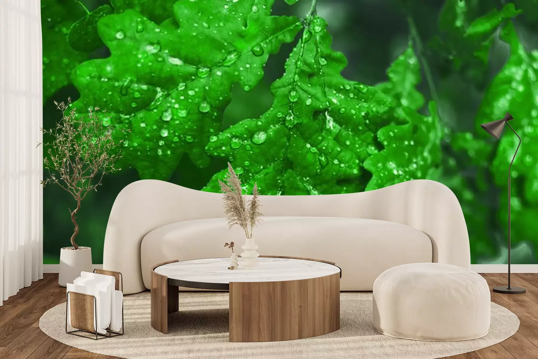 Fototapete Grüne Blätter in Wassertropfen