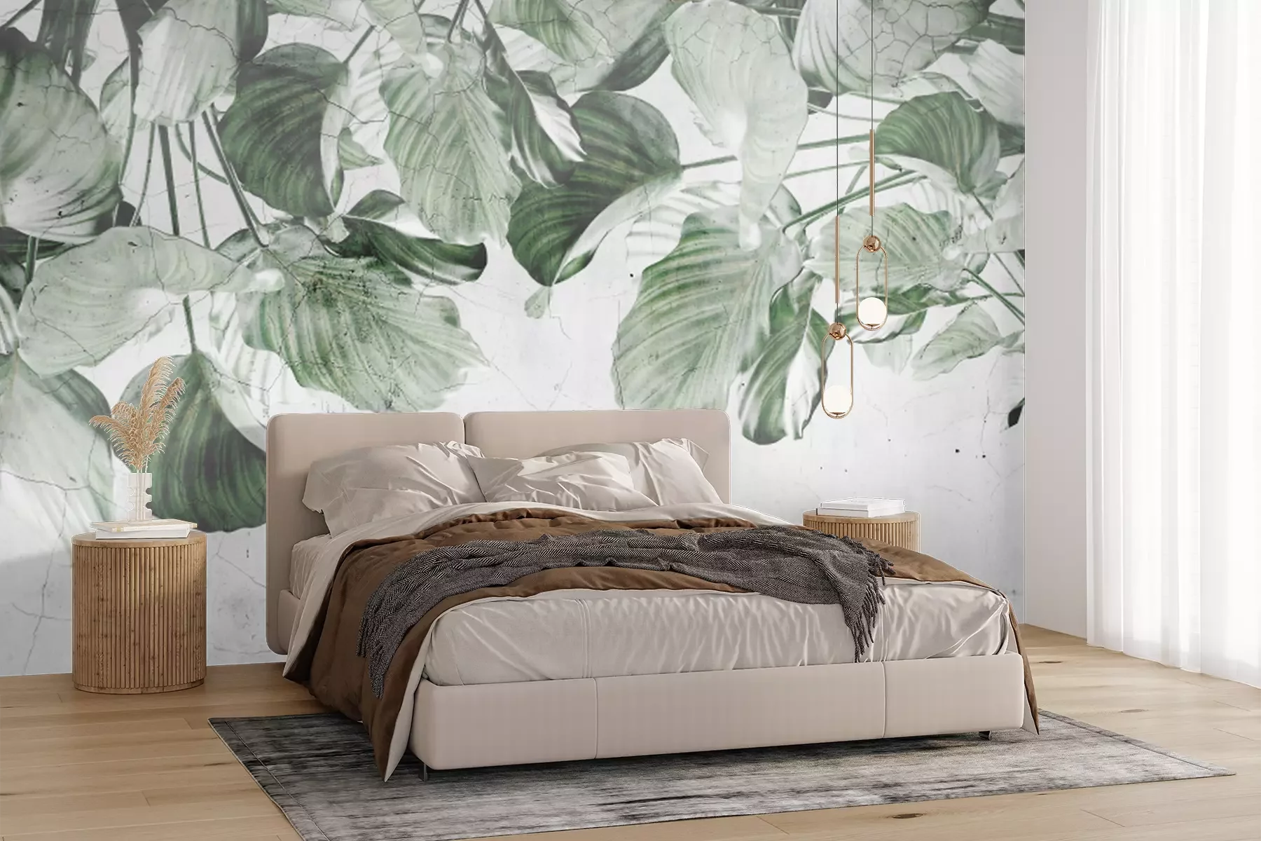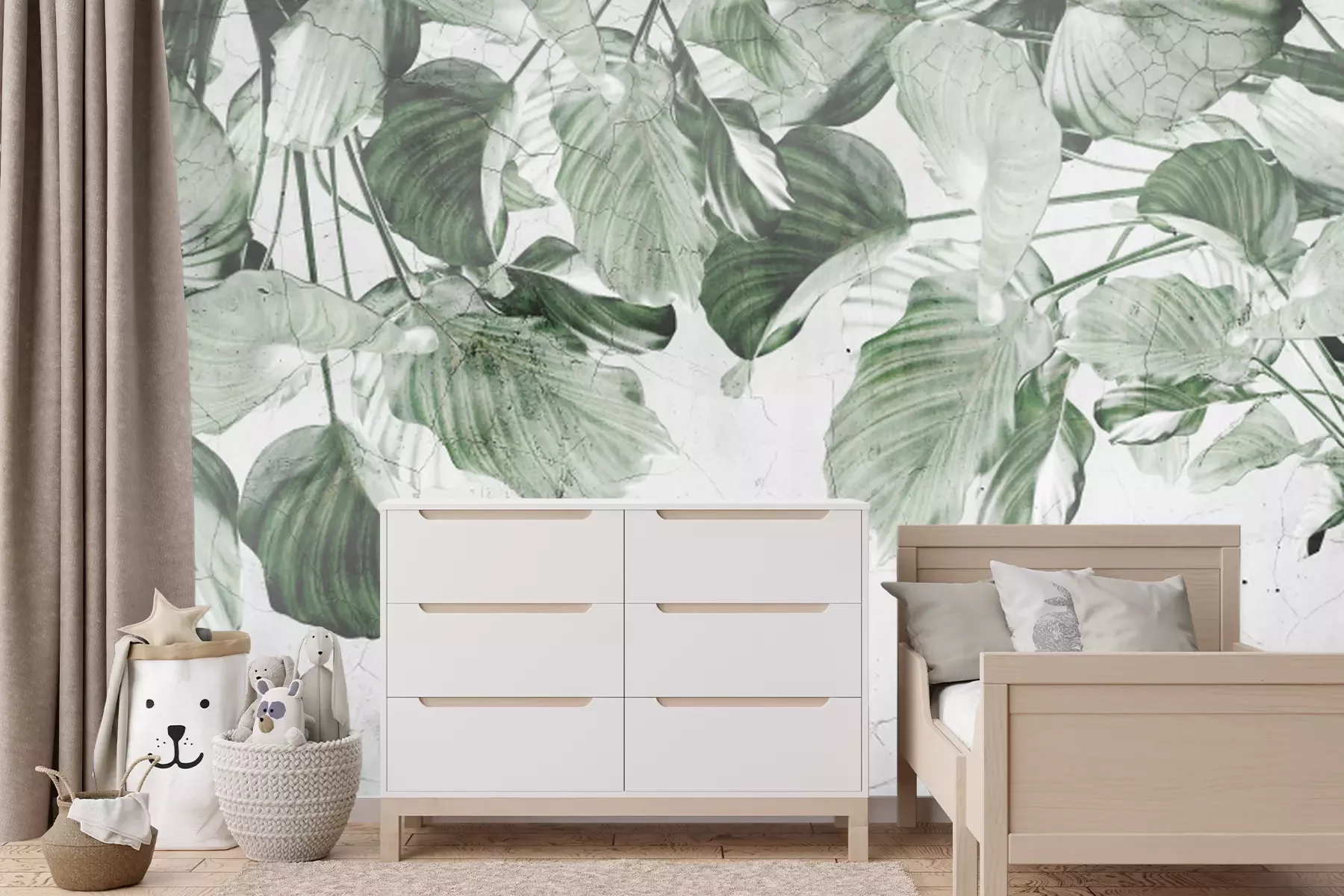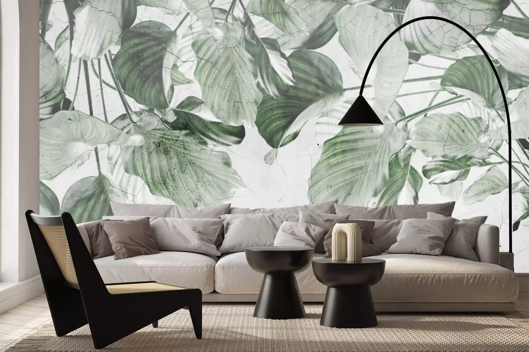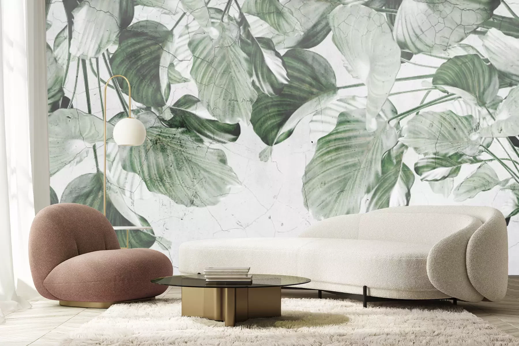 Fototapete Grüne große Blätter an einer rissigen Wand