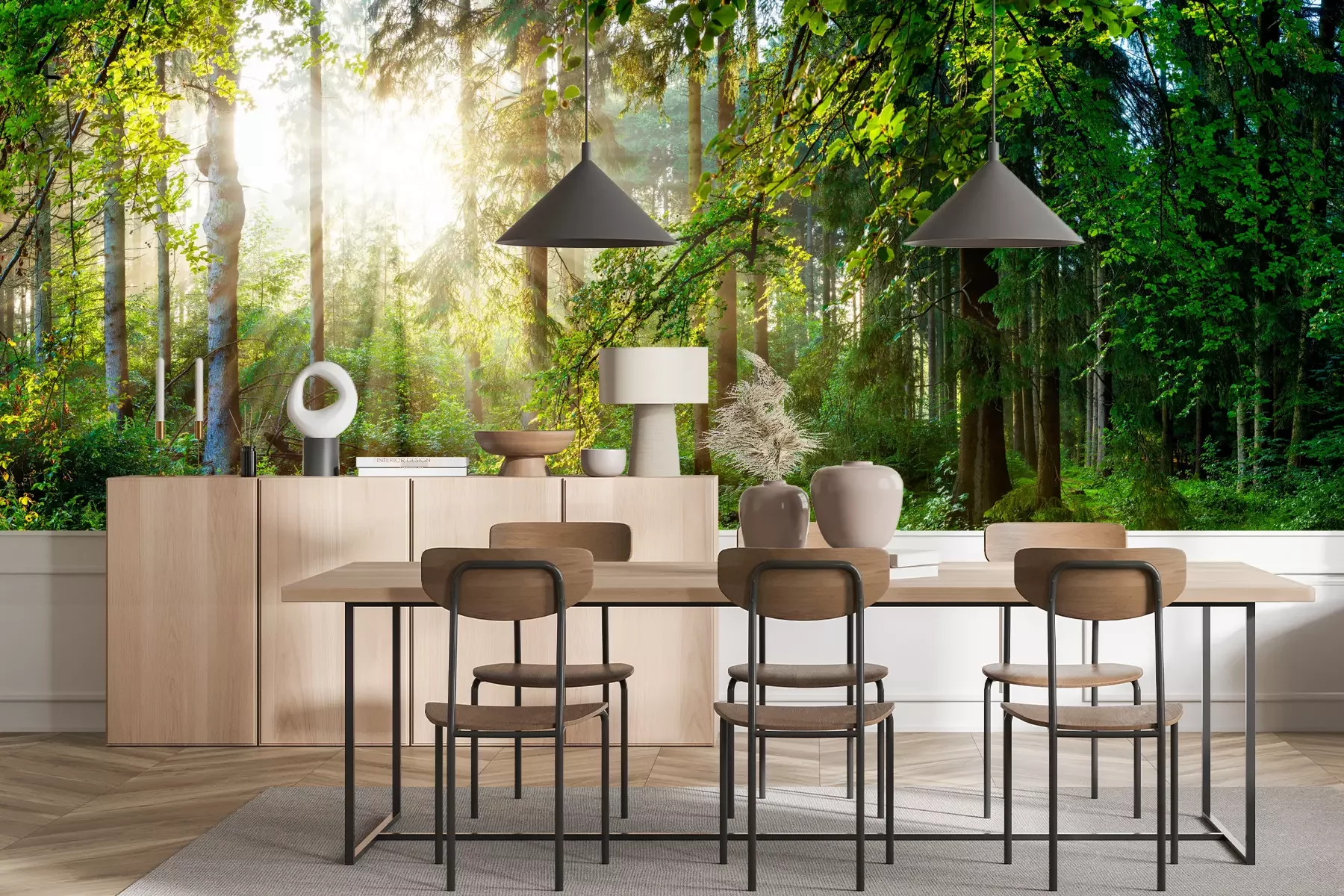 Das Material Premium+ besteht aus einer strukturierten Vinyl-Oberschicht und einem Trägermaterial (Vlies) mit einer Grammatur von 255 g/m², das kleine Unebenheiten der Wand zuverlässig kaschiert. Die feine Sandstruktur verleiht der Oberfläche eine luxuriöse Haptik, während das halbmatte Finish die Tiefe der Farben betont. Das Material ist dampfdurchlässig – so kann diese Fototapete auch in Küchen und Badezimmern eingesetzt werden. Die maximale Breite einer Tapetenbahn beträgt 100 cm. Bei größeren Abmessungen besteht die Fototapete aus mehreren gleich großen Bahnen. Der Kleber wird direkt auf die Wand aufgetragen, und die Fototapete wird auf Stoß angebracht, was für einen ästhetischen Effekt ohne sichtbare Fugen sorgt. Die Oberfläche ist pflegeleicht und kann bei Bedarf sanft mit einem feuchten Tuch abgewischt werden.