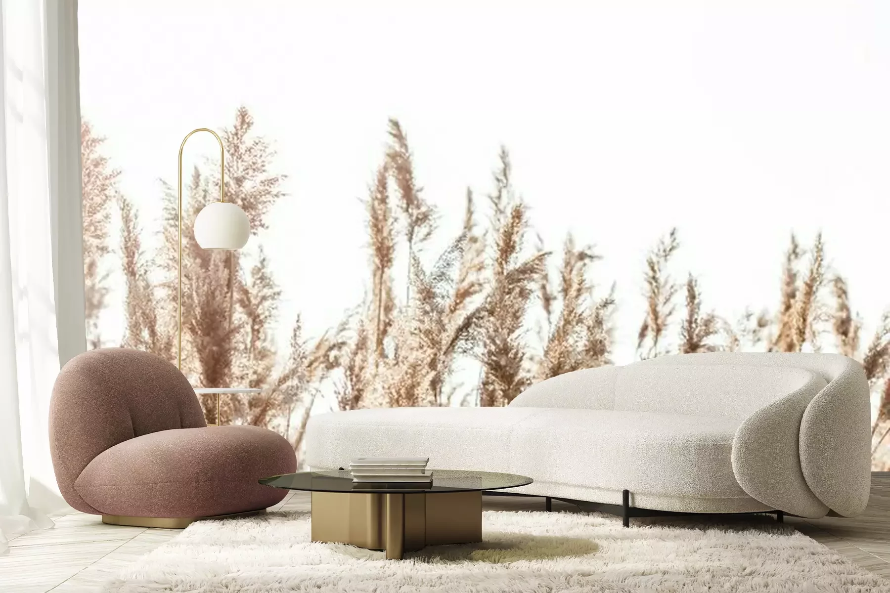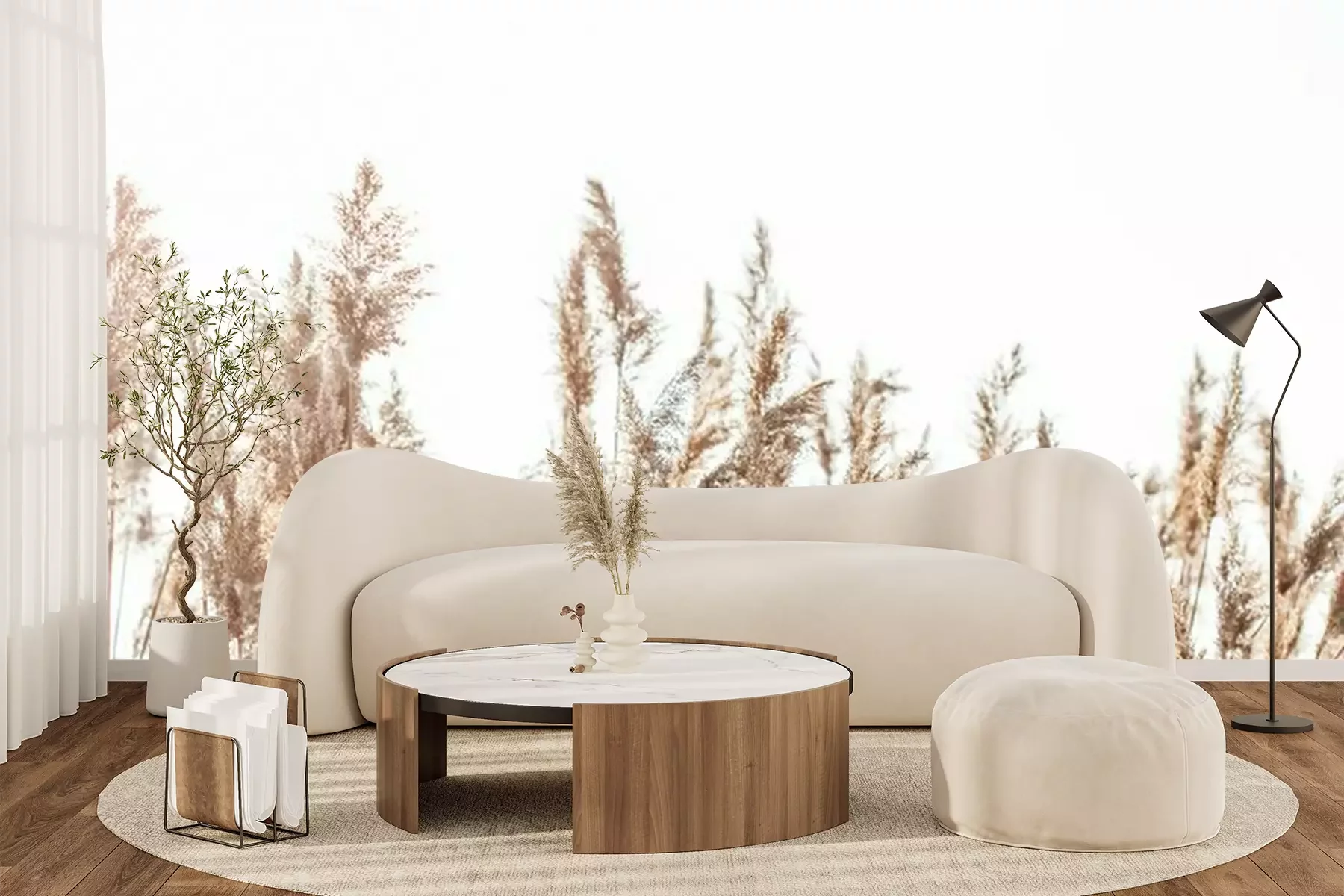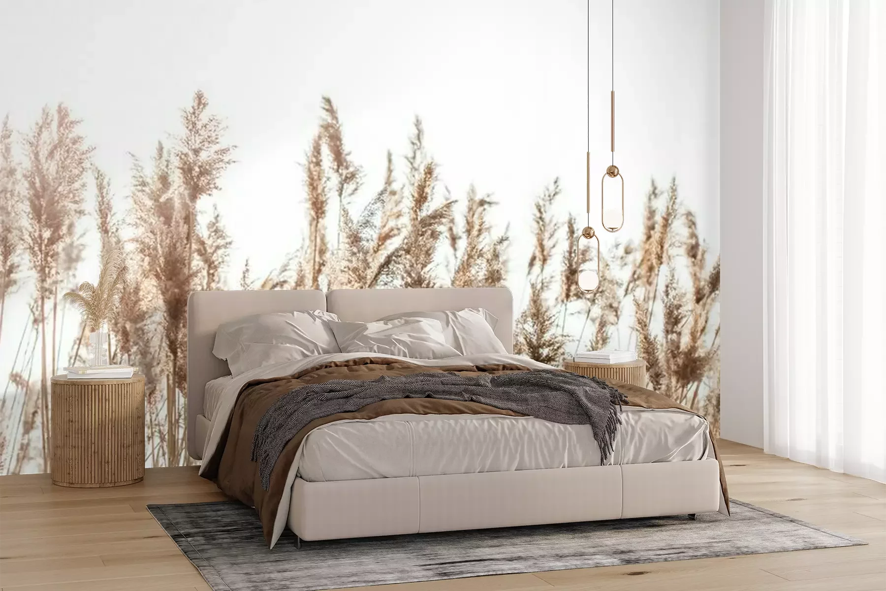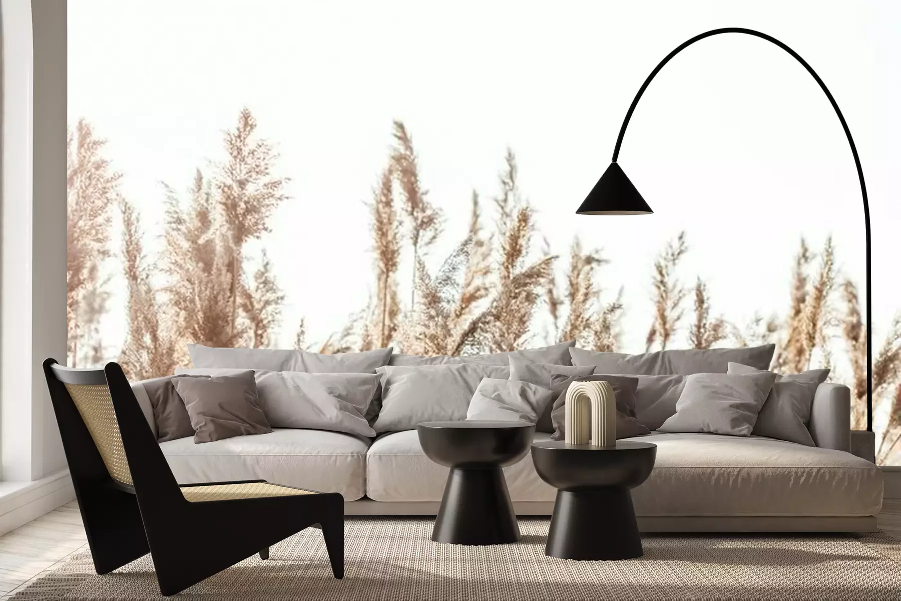Halme von hohem GrasWenn Sie von Ihrer eigenen Oase der Ruhe im Haus träumen, holen Sie sich ein wenig Natur in Ihr Interieur. Dabei hilft Ihnen eine Fototapete. Schilf, das am Wasser wächst, bringt eine gemütliche und wohnliche Atmosphäre in die Einrichtung, wodurch der Raum ein angenehmes Erscheinungsbild erhält. Was Aufmerksamkeit verdient, ist der einzigartige Charakter unserer Fototapete. Pflanzen vor dem Hintergrund eines klaren Himmels ermöglichen einerseits eine spürbare Veränderung des Raumes, andererseits wird das Arrangement nicht erdrückt, da das Foto sehr zart ist. Beige Halme mit gefiederten Spitzen passen zu vielen verschiedenen Wohnstilen, so dass Sie die Dekoration problemlos an Ihre Wohnung anpassen können. Zum Boho-Stil passt ideal eine solche Fototapete. Schilf ergänzt die Einrichtung mit Korb- oder Rattanmöbeln und ethnischen Textilien in Naturfarben. Großartige Effekte erzielt man auch, wenn man das Grasmotiv in eine rustikale Küche integriert. Was ändert sich durch eine solche Fototapete? Pflanzen werden nicht nur zu einem schönen Hintergrund für die Zubereitung von Mahlzeiten, sondern auch für das gemeinsame Essen mit der Familie. Das Muster kann die gesamte Wand bedecken, beispielsweise solche, an der der Esstisch steht, oder nur den Freiraum zwischen der Arbeitsplatte und den hängenden Schränken. Eine weitere Option ist ein modern eingerichtetes Wohnzimmer im Öko-Stil. In einer solchen Umgebung präsentiert sich hervorragend unsere Fototapete. Natur ist ein heißer Trend in der Welt des Interior Designs, daher ist das Grasmotiv ein Thema, das es wert ist, berücksichtigt zu werden. Es passt gut zu Holzmöbeln und einer Sitzgruppe mit abgerundeten Formen. Eine solche Einrichtung fördert Entspannung und Erholung. Ein wichtiger Aspekt bei der Auswahl einer Wanddekoration ist ihre Vielseitigkeit und Zeitlosigkeit. Eben diese Eigenschaften besitzt unsere Fototapete. Natur in Form einer Landschaft präsentiert sich über viele Jahre hinweg wunderschön, ohne aus der Mode zu kommen oder den Bewohnern langweilig zu werden, denn eine solche stimmungsvolle und idyllische Ansicht ermöglicht es, die Natur im Haus zu genießen. Mit welchen anderen dekorativen Elementen harmoniert die hier vorgeschlagene Fototapete? Schilf erinnert an Seen und wilde Natur. Daher sind Poster mit Wasservögeln in Form von Aquarellmalereien oder Retro-Grafiken sowie Sträuße aus getrocknetem Pampasgras in schlichten Vasen die perfekte Abrundung einer solchen Einrichtung.