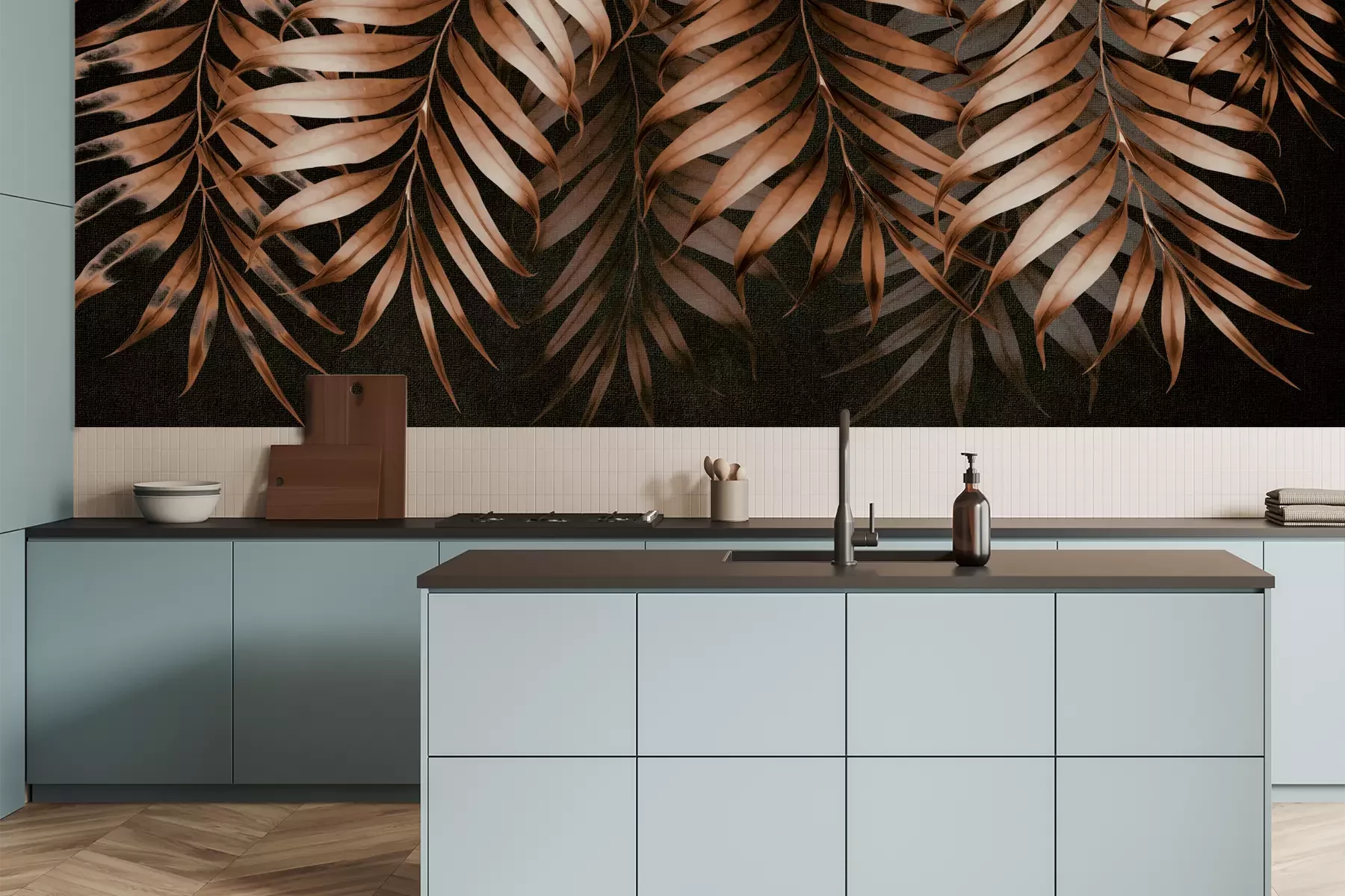 Das Material Premium+ besteht aus einer strukturierten Vinyl-Oberschicht und einem Trägermaterial (Vlies) mit einer Grammatur von 255 g/m², das kleine Unebenheiten der Wand zuverlässig kaschiert. Die feine Sandstruktur verleiht der Oberfläche eine luxuriöse Haptik, während das halbmatte Finish die Tiefe der Farben betont. Das Material ist dampfdurchlässig – so kann diese Fototapete auch in Küchen und Badezimmern eingesetzt werden. Die maximale Breite einer Tapetenbahn beträgt 100 cm. Bei größeren Abmessungen besteht die Fototapete aus mehreren gleich großen Bahnen. Der Kleber wird direkt auf die Wand aufgetragen, und die Fototapete wird auf Stoß angebracht, was für einen ästhetischen Effekt ohne sichtbare Fugen sorgt. Die Oberfläche ist pflegeleicht und kann bei Bedarf sanft mit einem feuchten Tuch abgewischt werden.
