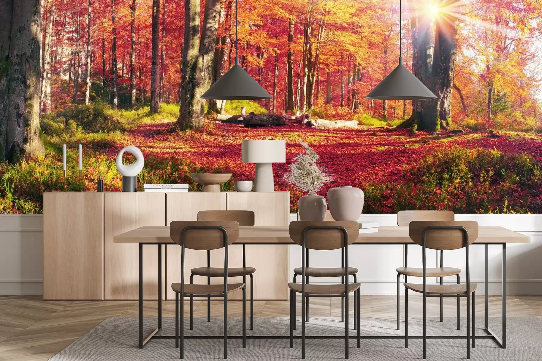 Das Material Premium+ besteht aus einer strukturierten Vinyl-Oberschicht und einem Trägermaterial (Vlies) mit einer Grammatur von 255 g/m², das kleine Unebenheiten der Wand zuverlässig kaschiert. Die feine Sandstruktur verleiht der Oberfläche eine luxuriöse Haptik, während das halbmatte Finish die Tiefe der Farben betont. Das Material ist dampfdurchlässig – so kann diese Fototapete auch in Küchen und Badezimmern eingesetzt werden. Die maximale Breite einer Tapetenbahn beträgt 100 cm. Bei größeren Abmessungen besteht die Fototapete aus mehreren gleich großen Bahnen. Der Kleber wird direkt auf die Wand aufgetragen, und die Fototapete wird auf Stoß angebracht, was für einen ästhetischen Effekt ohne sichtbare Fugen sorgt. Die Oberfläche ist pflegeleicht und kann bei Bedarf sanft mit einem feuchten Tuch abgewischt werden.