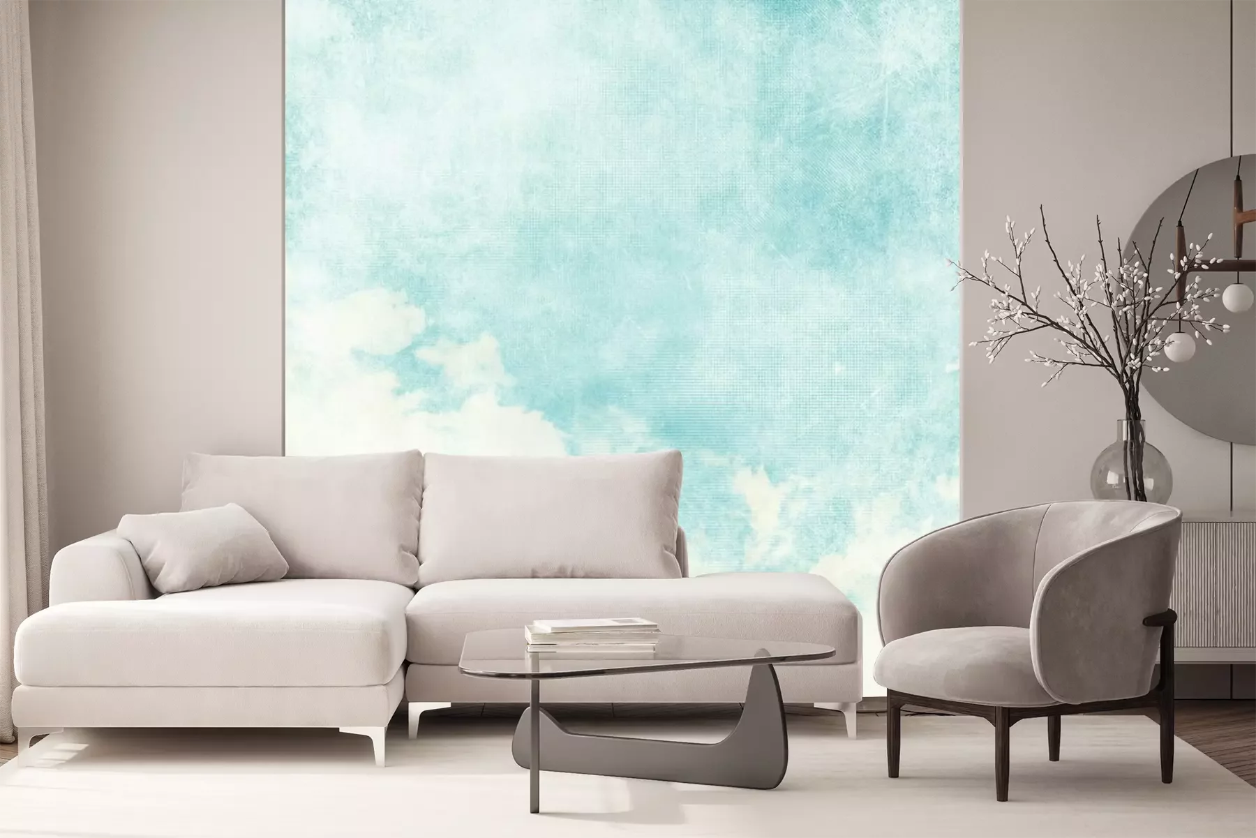 Das Material Premium+ besteht aus einer strukturierten Vinyl-Oberschicht und einem Trägermaterial (Vlies) mit einer Grammatur von 255 g/m², das kleine Unebenheiten der Wand zuverlässig kaschiert. Die feine Sandstruktur verleiht der Oberfläche eine luxuriöse Haptik, während das halbmatte Finish die Tiefe der Farben betont. Das Material ist dampfdurchlässig – so kann diese Fototapete auch in Küchen und Badezimmern eingesetzt werden. Die maximale Breite einer Tapetenbahn beträgt 100 cm. Bei größeren Abmessungen besteht die Fototapete aus mehreren gleich großen Bahnen. Der Kleber wird direkt auf die Wand aufgetragen, und die Fototapete wird auf Stoß angebracht, was für einen ästhetischen Effekt ohne sichtbare Fugen sorgt. Die Oberfläche ist pflegeleicht und kann bei Bedarf sanft mit einem feuchten Tuch abgewischt werden.
