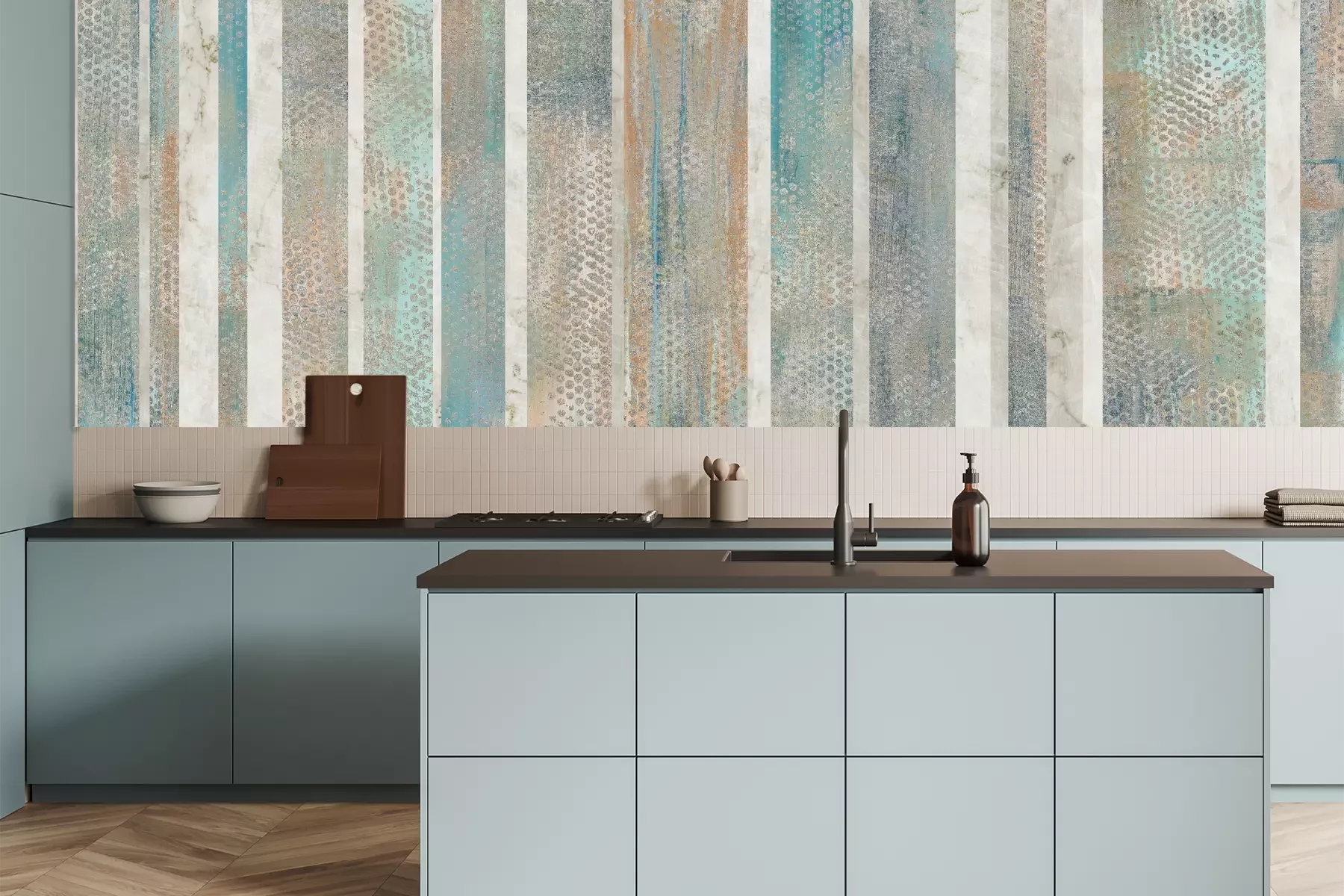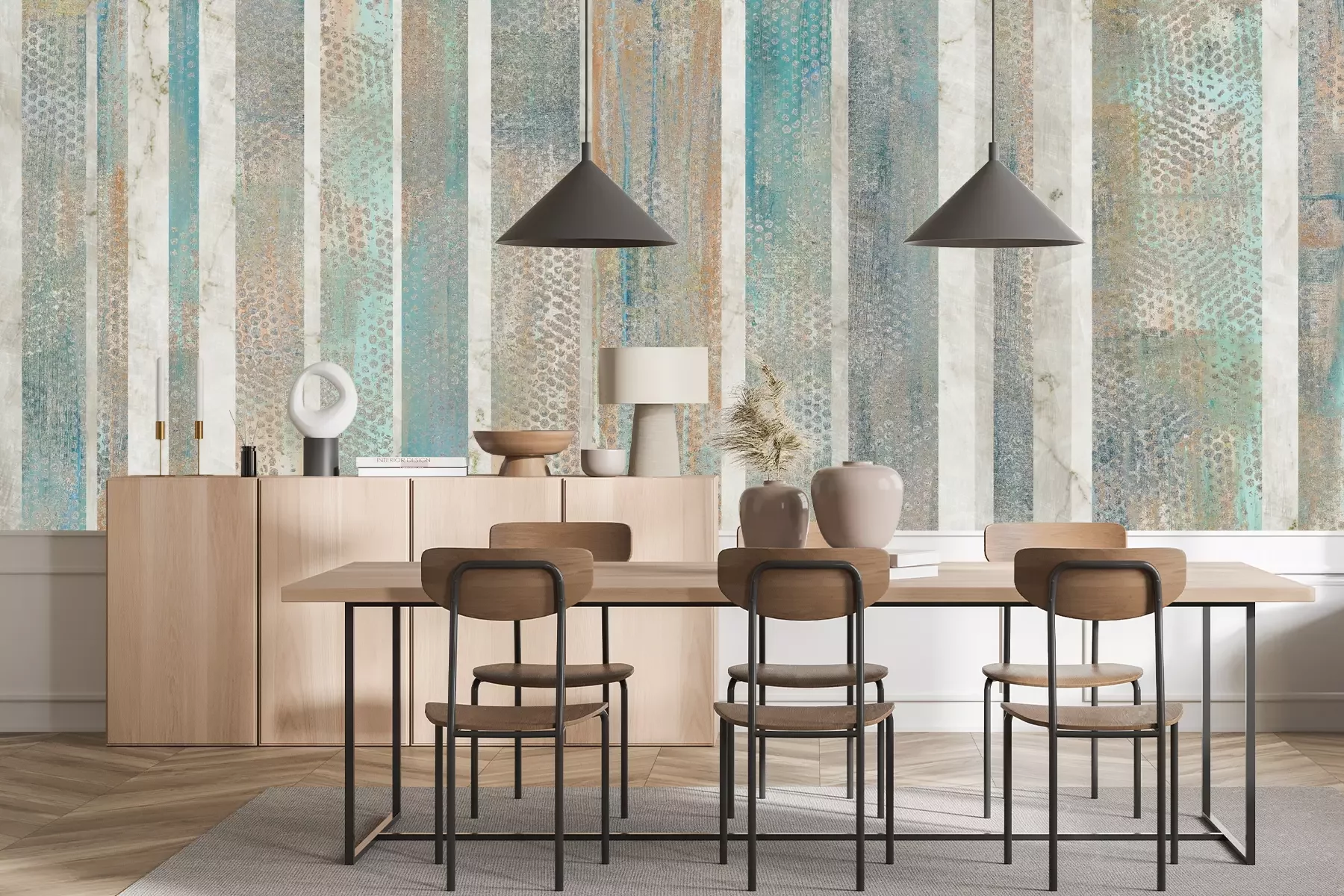 Das Material Premium+ besteht aus einer strukturierten Vinyl-Oberschicht und einem Trägermaterial (Vlies) mit einer Grammatur von 255 g/m², das kleine Unebenheiten der Wand zuverlässig kaschiert. Die feine Sandstruktur verleiht der Oberfläche eine luxuriöse Haptik, während das halbmatte Finish die Tiefe der Farben betont. Das Material ist dampfdurchlässig – so kann diese Fototapete auch in Küchen und Badezimmern eingesetzt werden. Die maximale Breite einer Tapetenbahn beträgt 100 cm. Bei größeren Abmessungen besteht die Fototapete aus mehreren gleich großen Bahnen. Der Kleber wird direkt auf die Wand aufgetragen, und die Fototapete wird auf Stoß angebracht, was für einen ästhetischen Effekt ohne sichtbare Fugen sorgt. Die Oberfläche ist pflegeleicht und kann bei Bedarf sanft mit einem feuchten Tuch abgewischt werden.