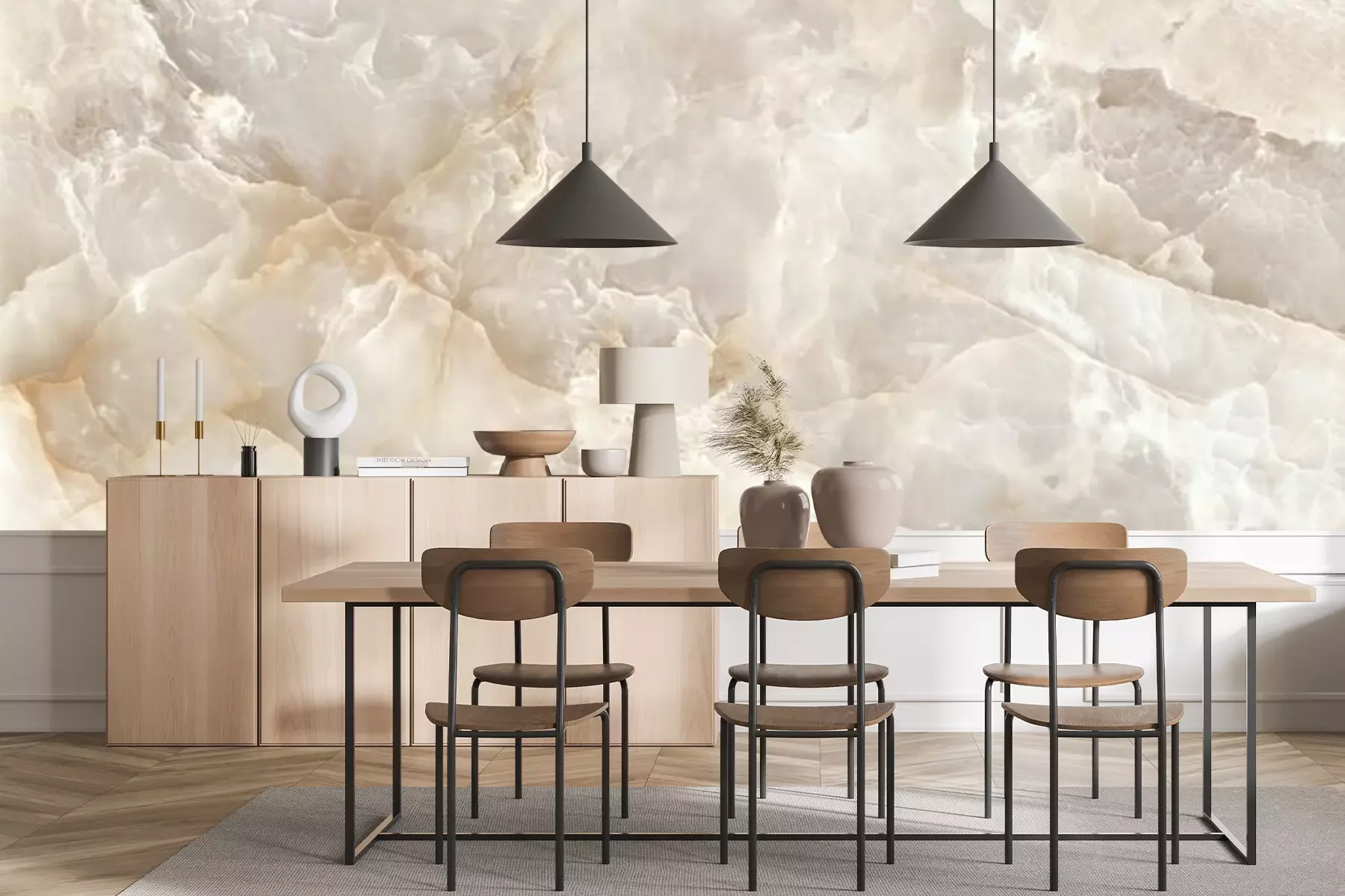 Das Material Premium+ besteht aus einer strukturierten Vinyl-Oberschicht und einem Trägermaterial (Vlies) mit einer Grammatur von 255 g/m², das kleine Unebenheiten der Wand zuverlässig kaschiert. Die feine Sandstruktur verleiht der Oberfläche eine luxuriöse Haptik, während das halbmatte Finish die Tiefe der Farben betont. Das Material ist dampfdurchlässig – so kann diese Fototapete auch in Küchen und Badezimmern eingesetzt werden. Die maximale Breite einer Tapetenbahn beträgt 100 cm. Bei größeren Abmessungen besteht die Fototapete aus mehreren gleich großen Bahnen. Der Kleber wird direkt auf die Wand aufgetragen, und die Fototapete wird auf Stoß angebracht, was für einen ästhetischen Effekt ohne sichtbare Fugen sorgt. Die Oberfläche ist pflegeleicht und kann bei Bedarf sanft mit einem feuchten Tuch abgewischt werden.