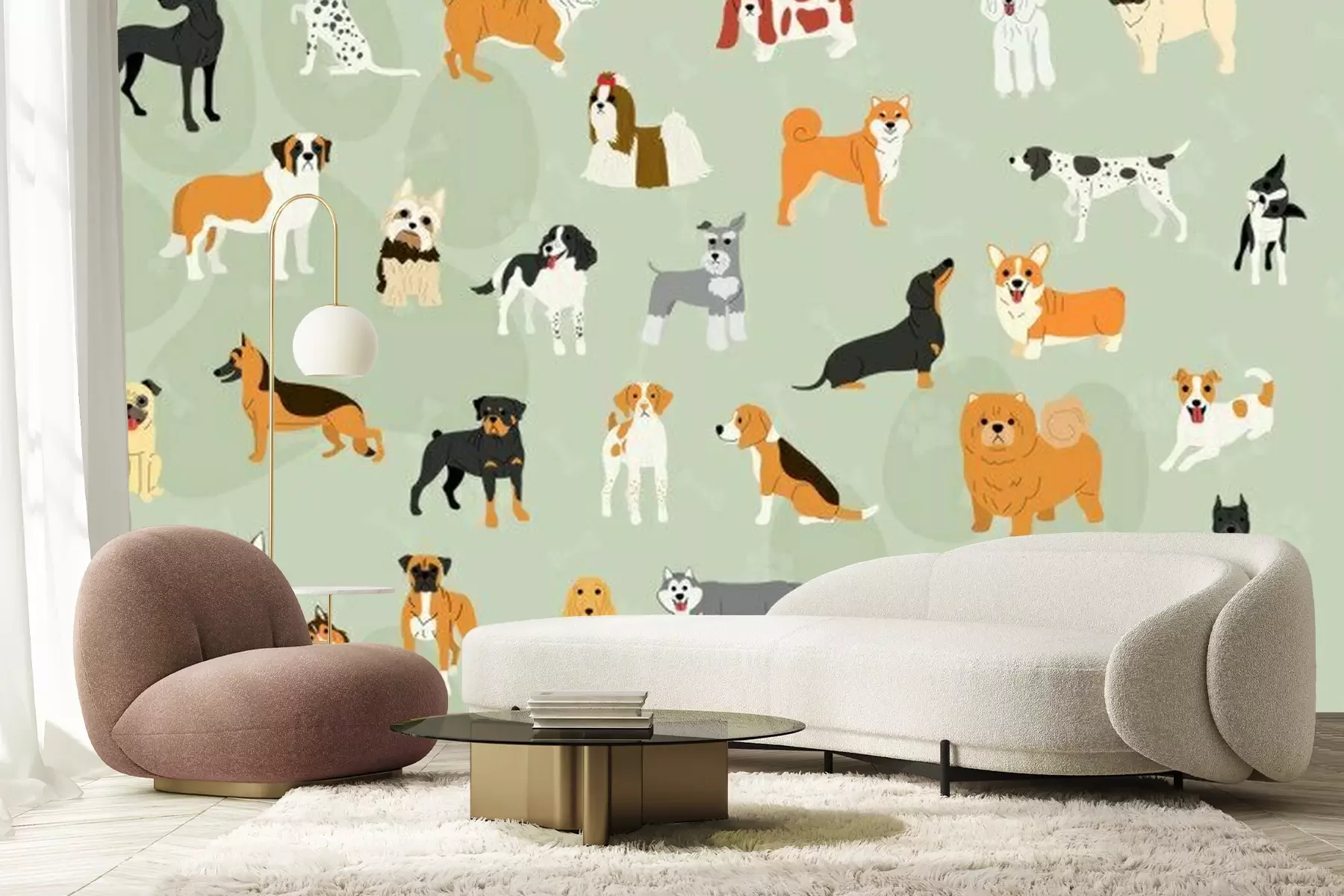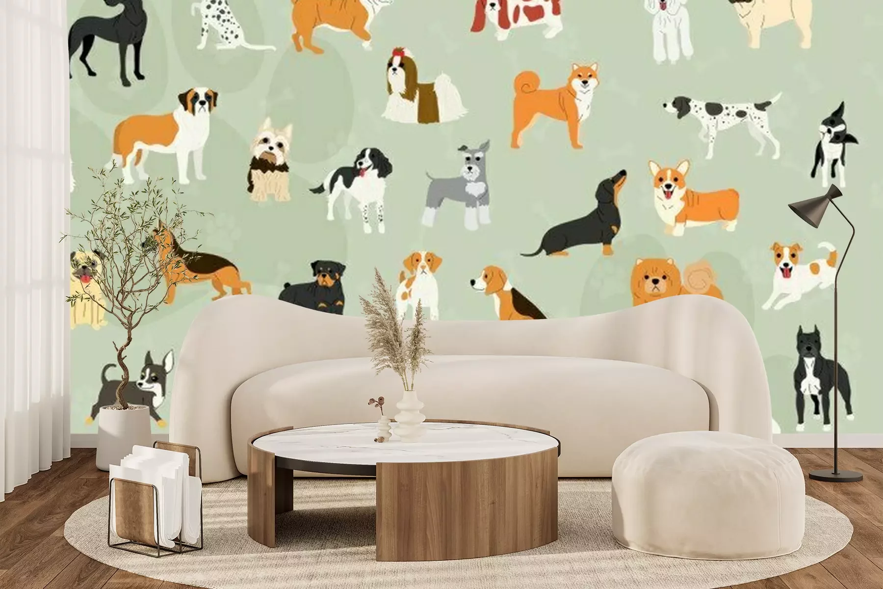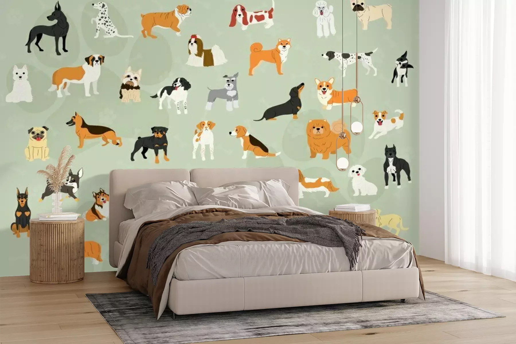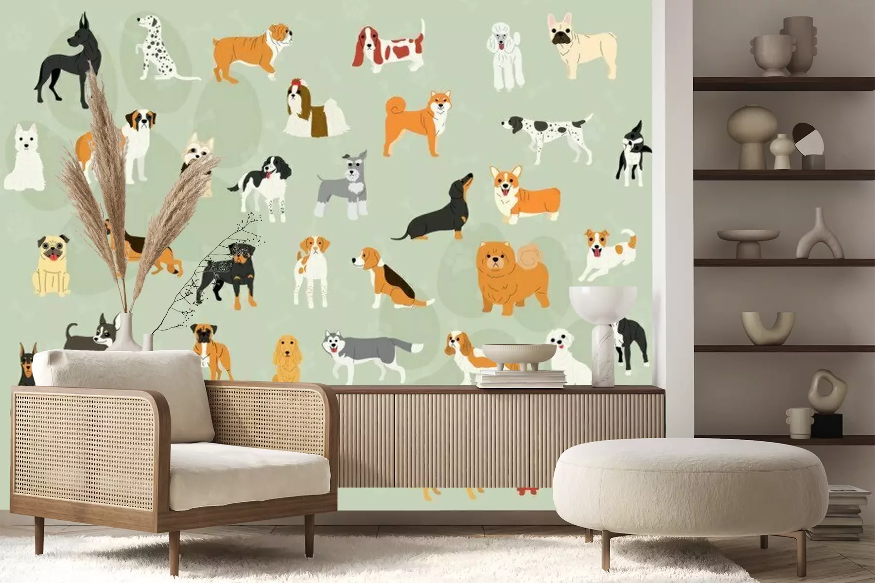 Fototapete Hündchen verschiedener Rassen auf grünem Hintergrund