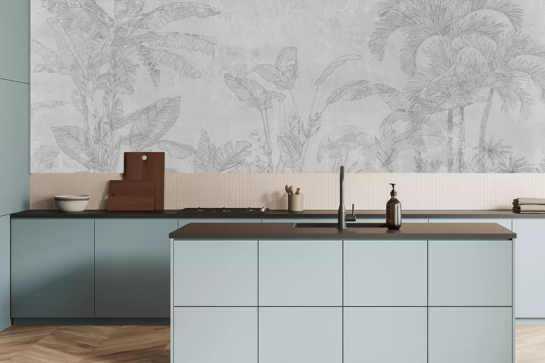 Das Material Premium+ besteht aus einer strukturierten Vinyl-Oberschicht und einem Trägermaterial (Vlies) mit einer Grammatur von 255 g/m², das kleine Unebenheiten der Wand zuverlässig kaschiert. Die feine Sandstruktur verleiht der Oberfläche eine luxuriöse Haptik, während das halbmatte Finish die Tiefe der Farben betont. Das Material ist dampfdurchlässig – so kann diese Fototapete auch in Küchen und Badezimmern eingesetzt werden. Die maximale Breite einer Tapetenbahn beträgt 100 cm. Bei größeren Abmessungen besteht die Fototapete aus mehreren gleich großen Bahnen. Der Kleber wird direkt auf die Wand aufgetragen, und die Fototapete wird auf Stoß angebracht, was für einen ästhetischen Effekt ohne sichtbare Fugen sorgt. Die Oberfläche ist pflegeleicht und kann bei Bedarf sanft mit einem feuchten Tuch abgewischt werden.