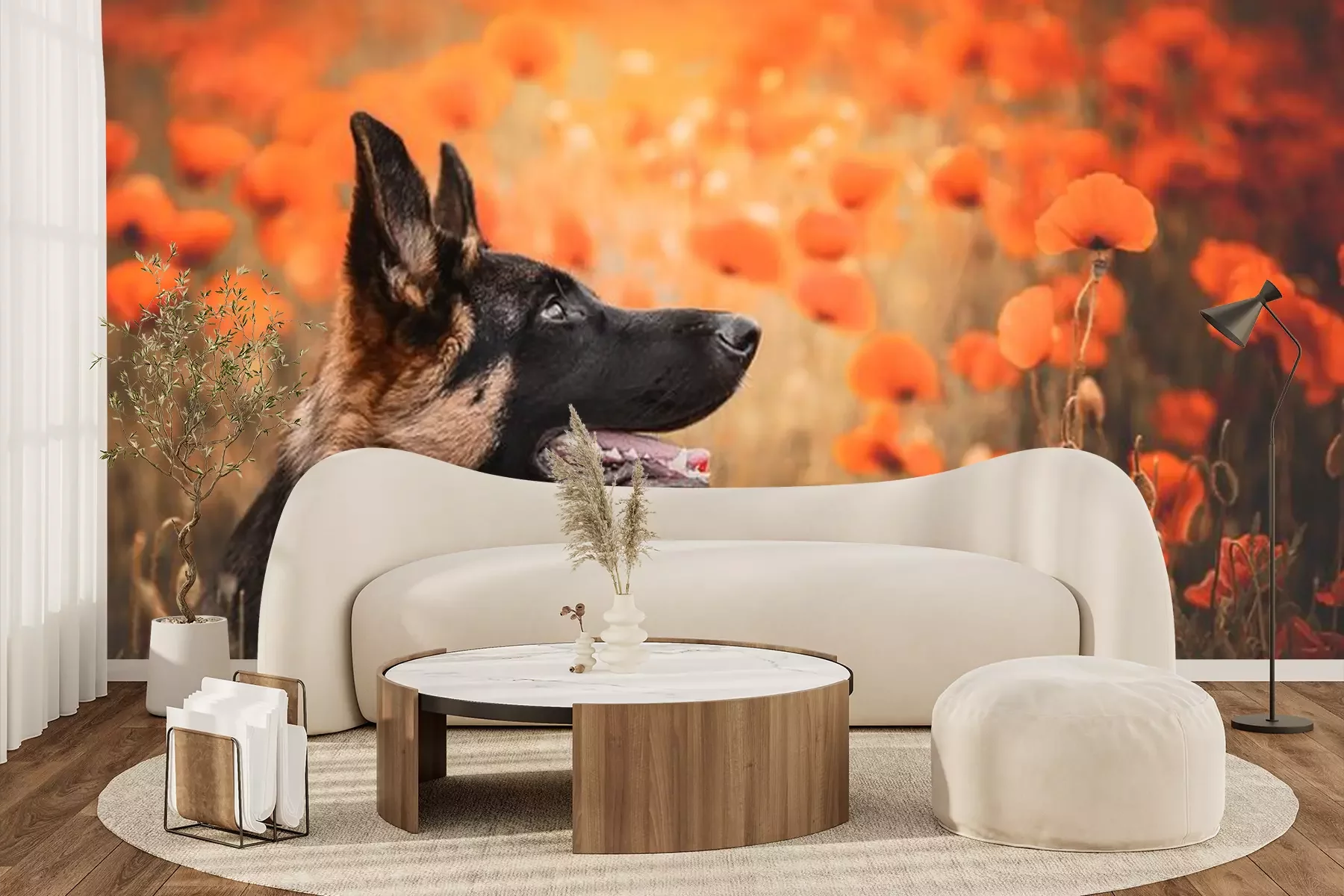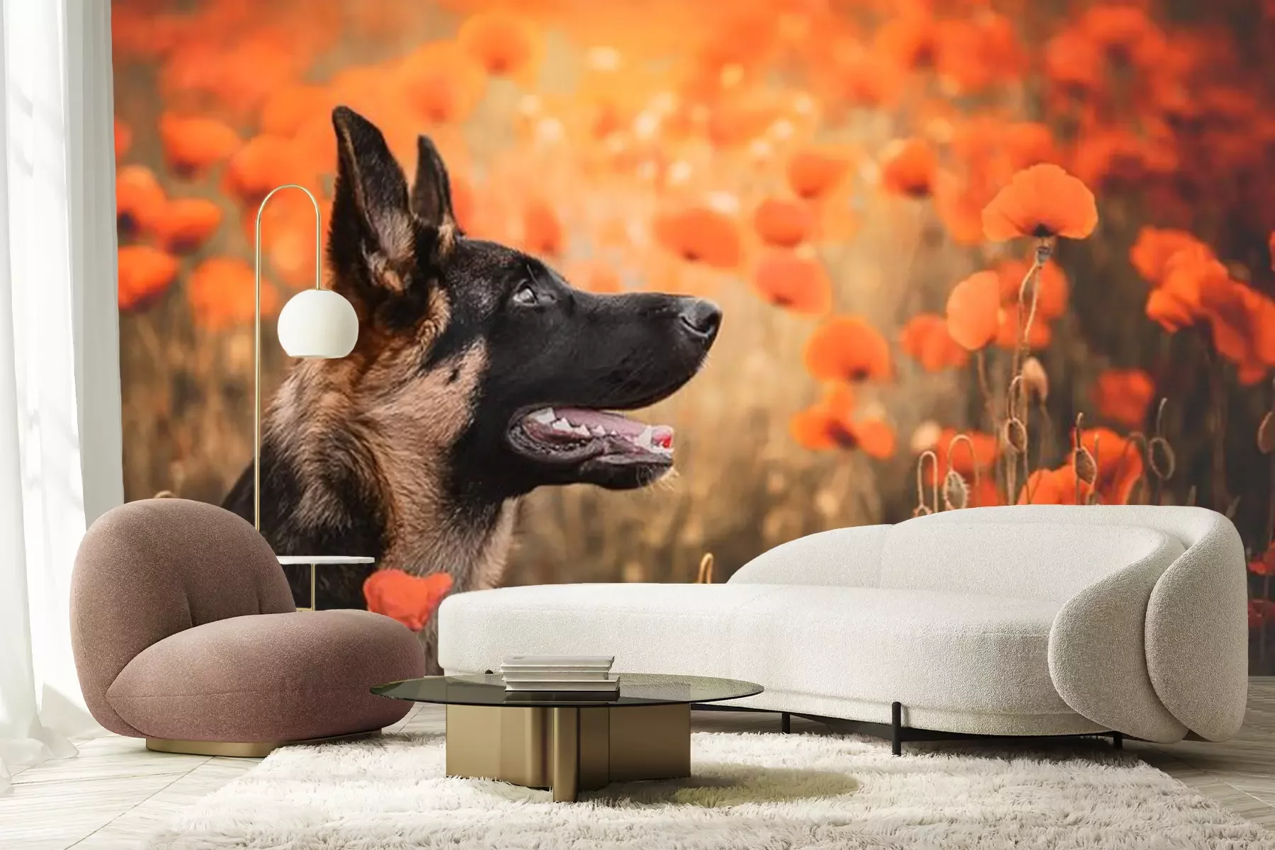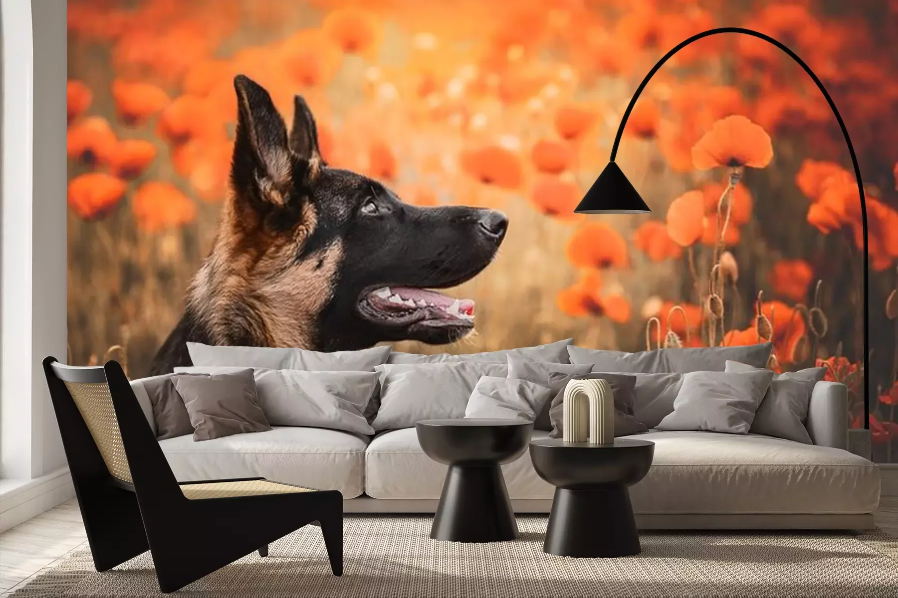 Fototapete Junger Deutscher Schäferhund im Mohnblumenfeld