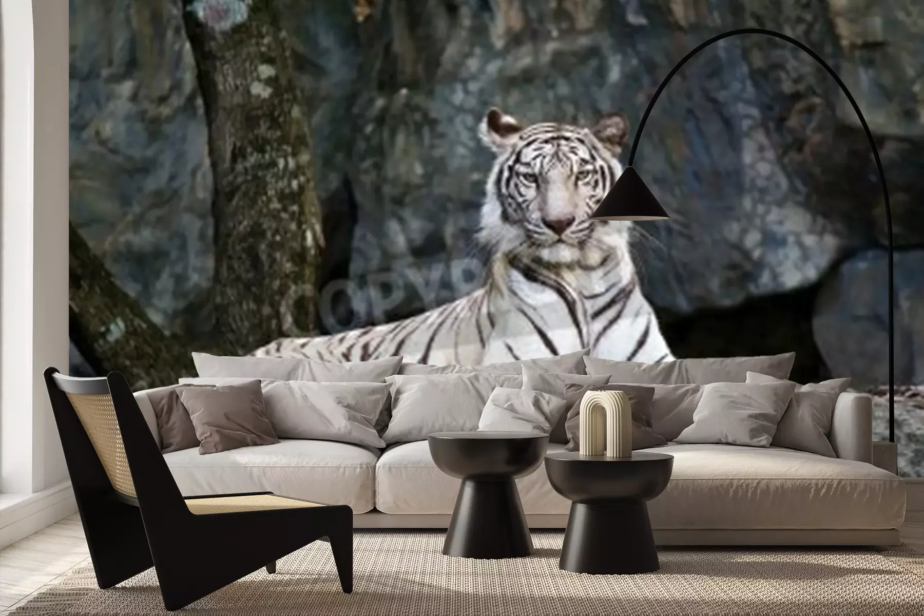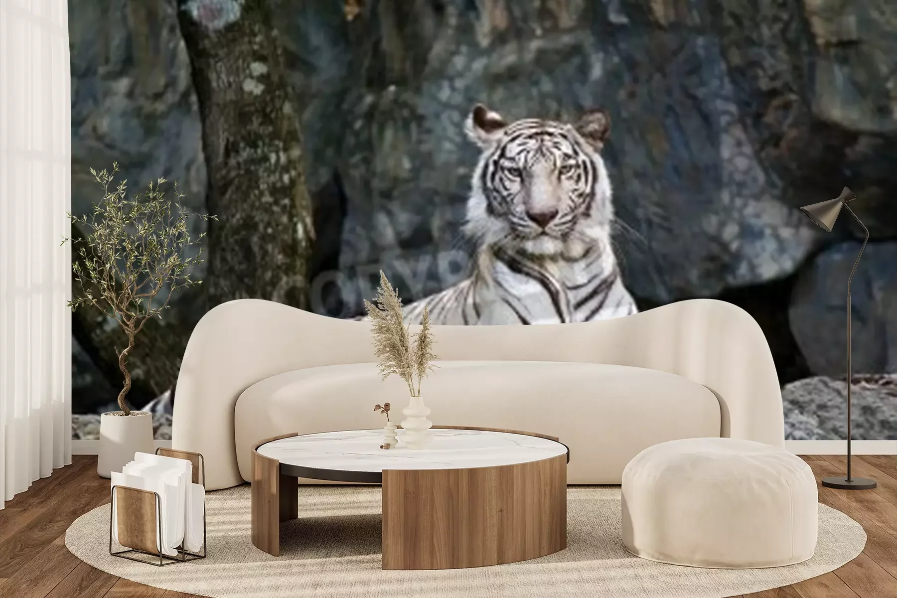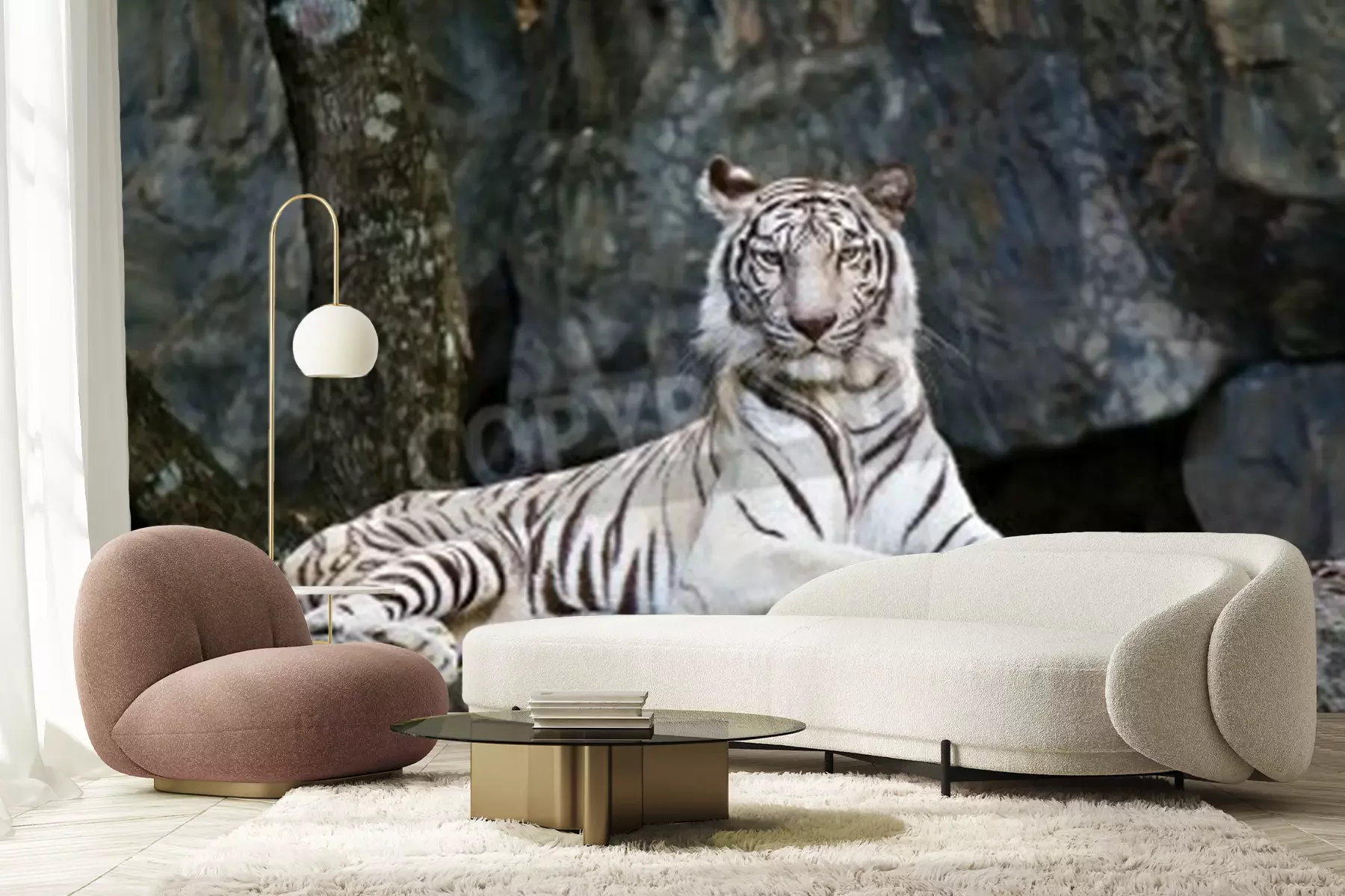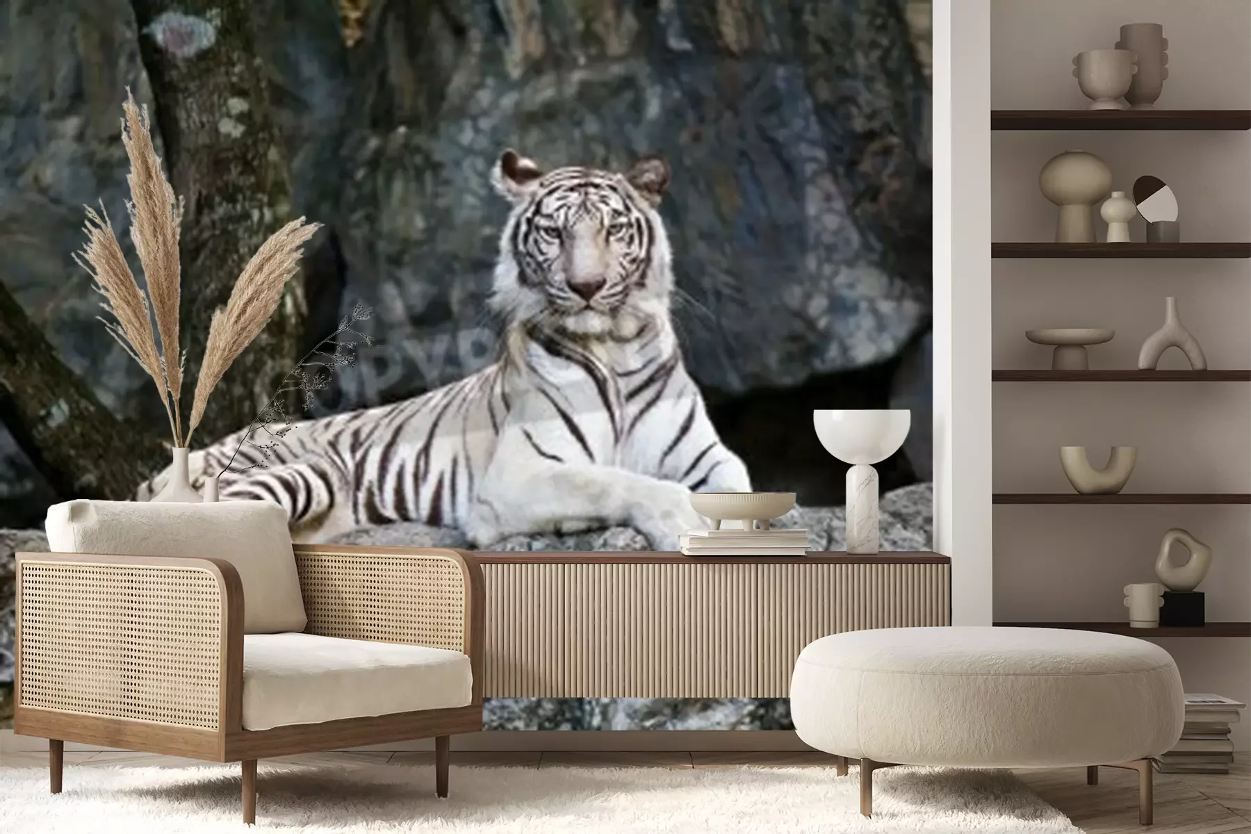 Fototapete Junger tiger, der sich auf einem felsen ausruht