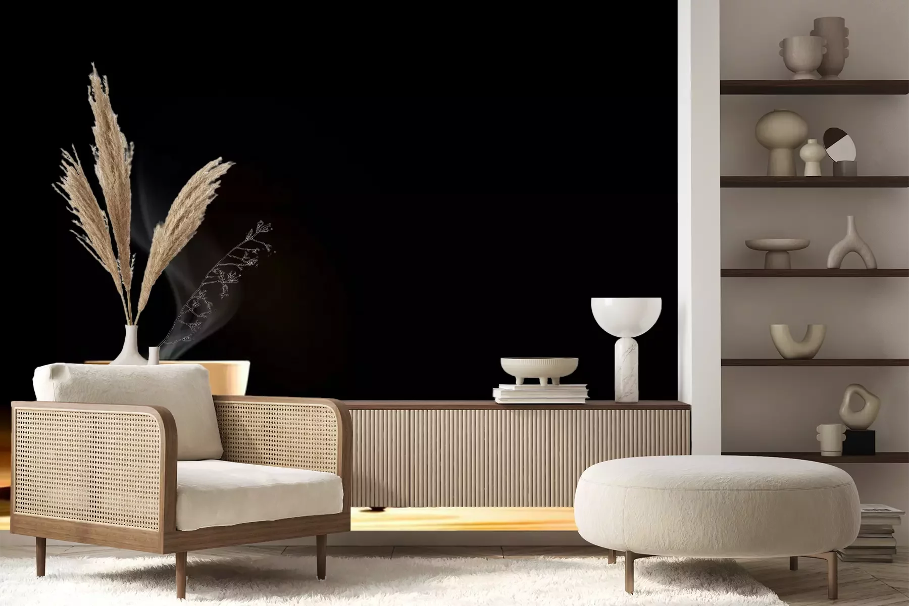 Das Material Premium+ besteht aus einer strukturierten Vinyl-Oberschicht und einem Trägermaterial (Vlies) mit einer Grammatur von 255 g/m², das kleine Unebenheiten der Wand zuverlässig kaschiert. Die feine Sandstruktur verleiht der Oberfläche eine luxuriöse Haptik, während das halbmatte Finish die Tiefe der Farben betont. Das Material ist dampfdurchlässig – so kann diese Fototapete auch in Küchen und Badezimmern eingesetzt werden. Die maximale Breite einer Tapetenbahn beträgt 100 cm. Bei größeren Abmessungen besteht die Fototapete aus mehreren gleich großen Bahnen. Der Kleber wird direkt auf die Wand aufgetragen, und die Fototapete wird auf Stoß angebracht, was für einen ästhetischen Effekt ohne sichtbare Fugen sorgt. Die Oberfläche ist pflegeleicht und kann bei Bedarf sanft mit einem feuchten Tuch abgewischt werden.