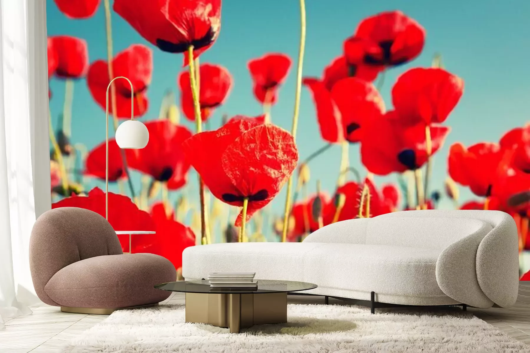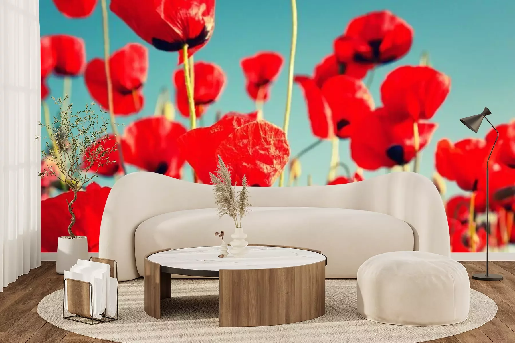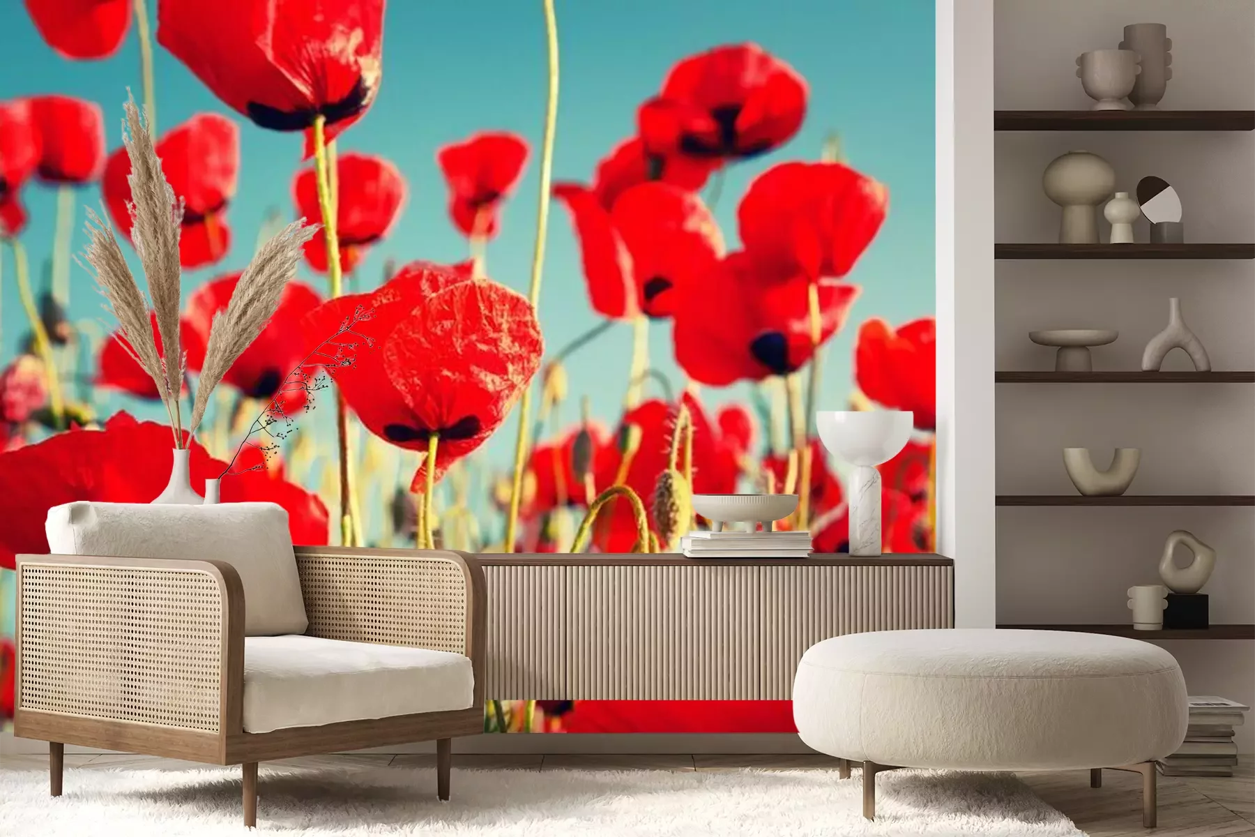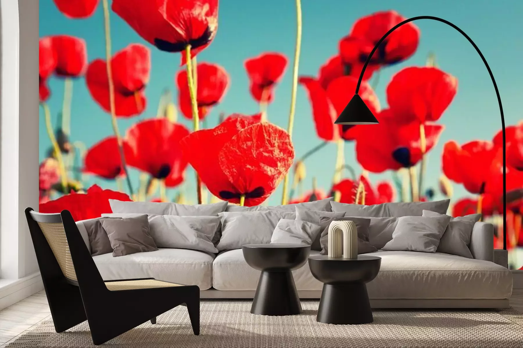 Fototapete Karmesinrote Mohnblumen vor dem Hintergrund des Himmels