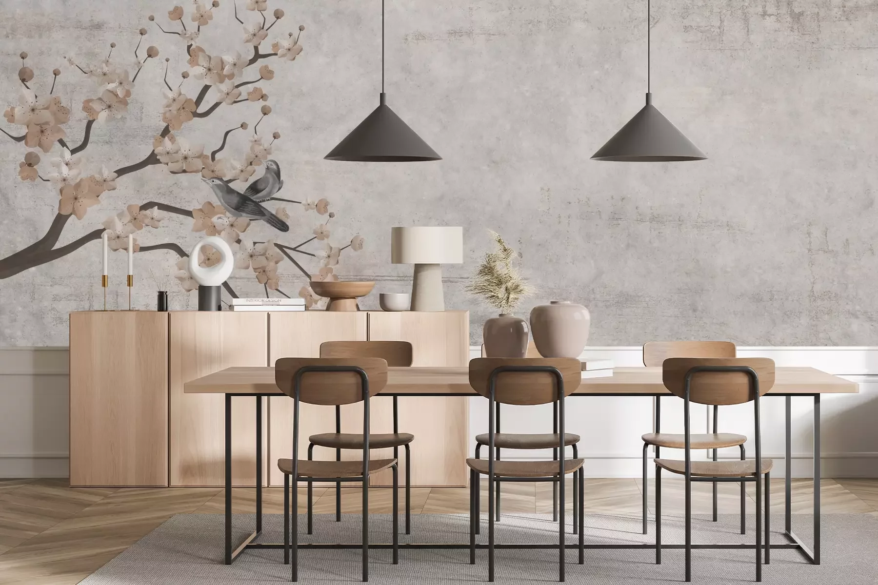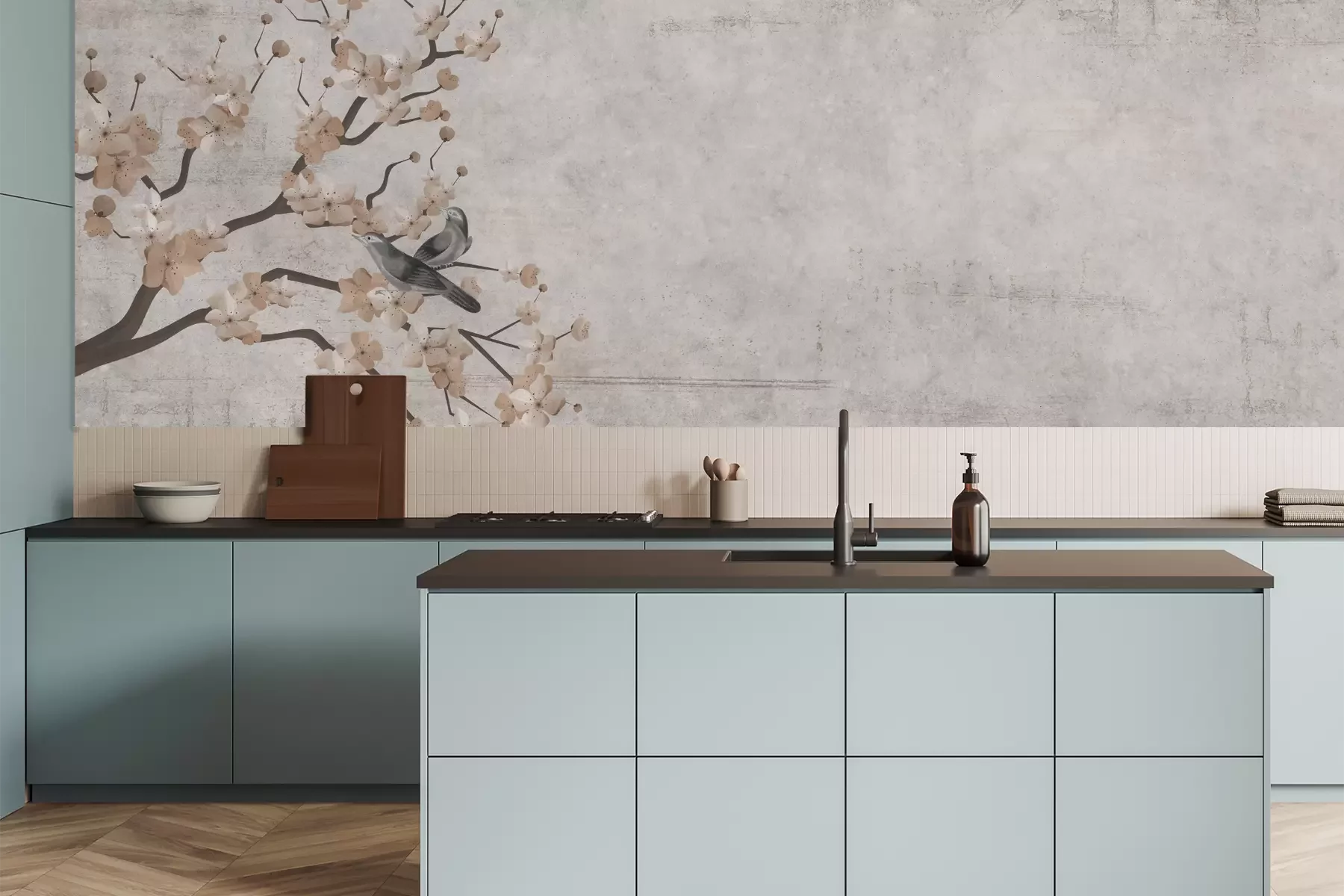 Das Material Premium+ besteht aus einer strukturierten Vinyl-Oberschicht und einem Trägermaterial (Vlies) mit einer Grammatur von 255 g/m², das kleine Unebenheiten der Wand zuverlässig kaschiert. Die feine Sandstruktur verleiht der Oberfläche eine luxuriöse Haptik, während das halbmatte Finish die Tiefe der Farben betont. Das Material ist dampfdurchlässig – so kann diese Fototapete auch in Küchen und Badezimmern eingesetzt werden. Die maximale Breite einer Tapetenbahn beträgt 100 cm. Bei größeren Abmessungen besteht die Fototapete aus mehreren gleich großen Bahnen. Der Kleber wird direkt auf die Wand aufgetragen, und die Fototapete wird auf Stoß angebracht, was für einen ästhetischen Effekt ohne sichtbare Fugen sorgt. Die Oberfläche ist pflegeleicht und kann bei Bedarf sanft mit einem feuchten Tuch abgewischt werden.
