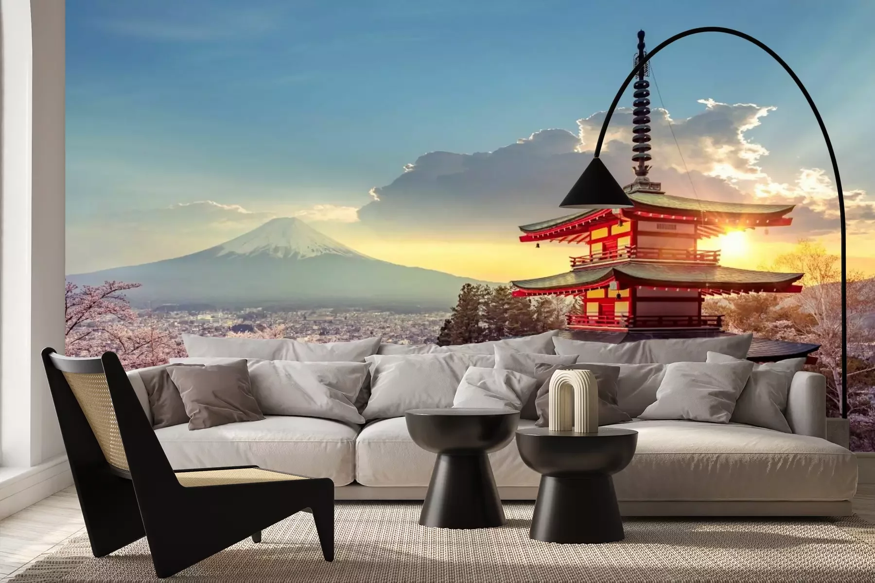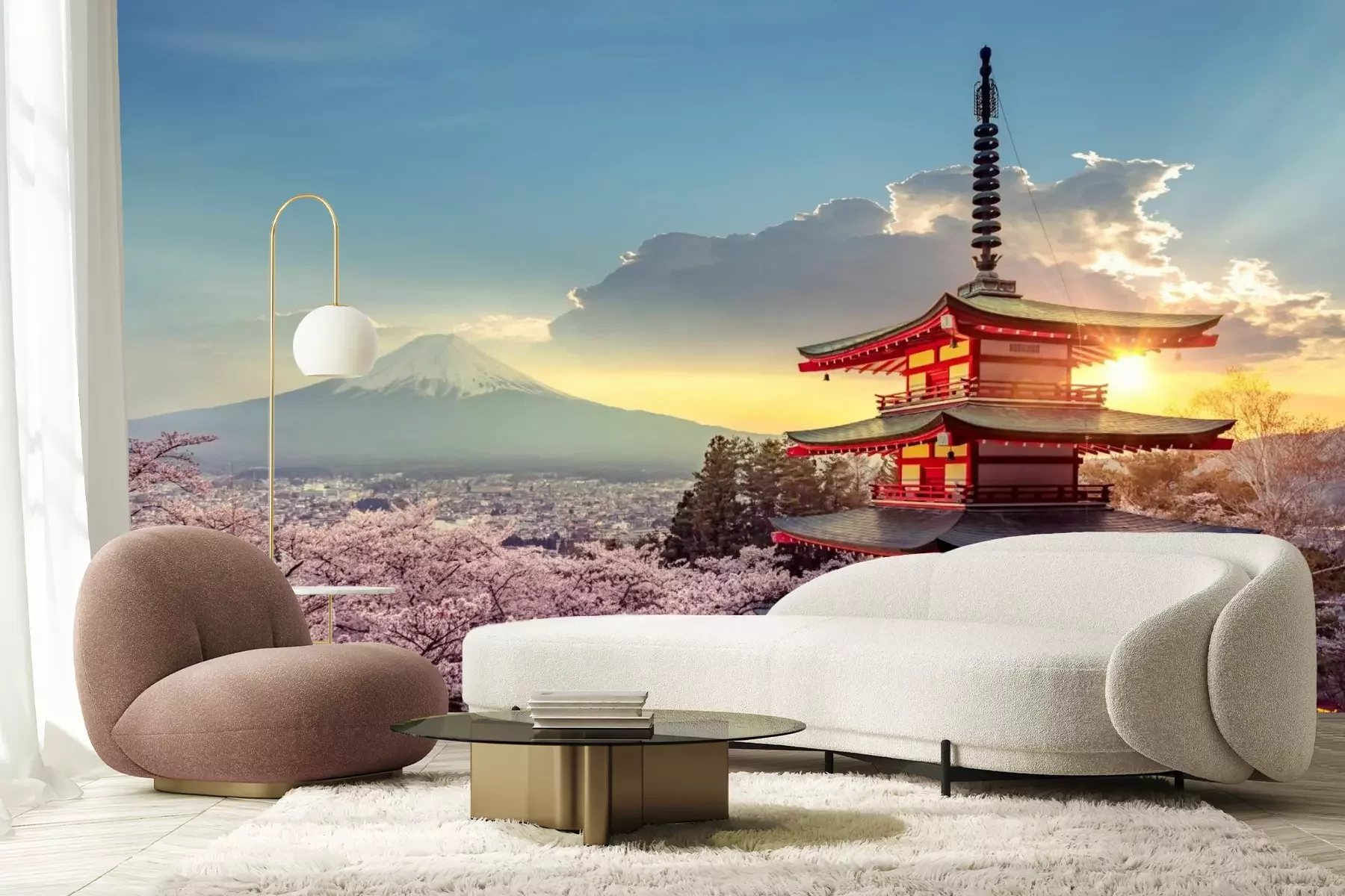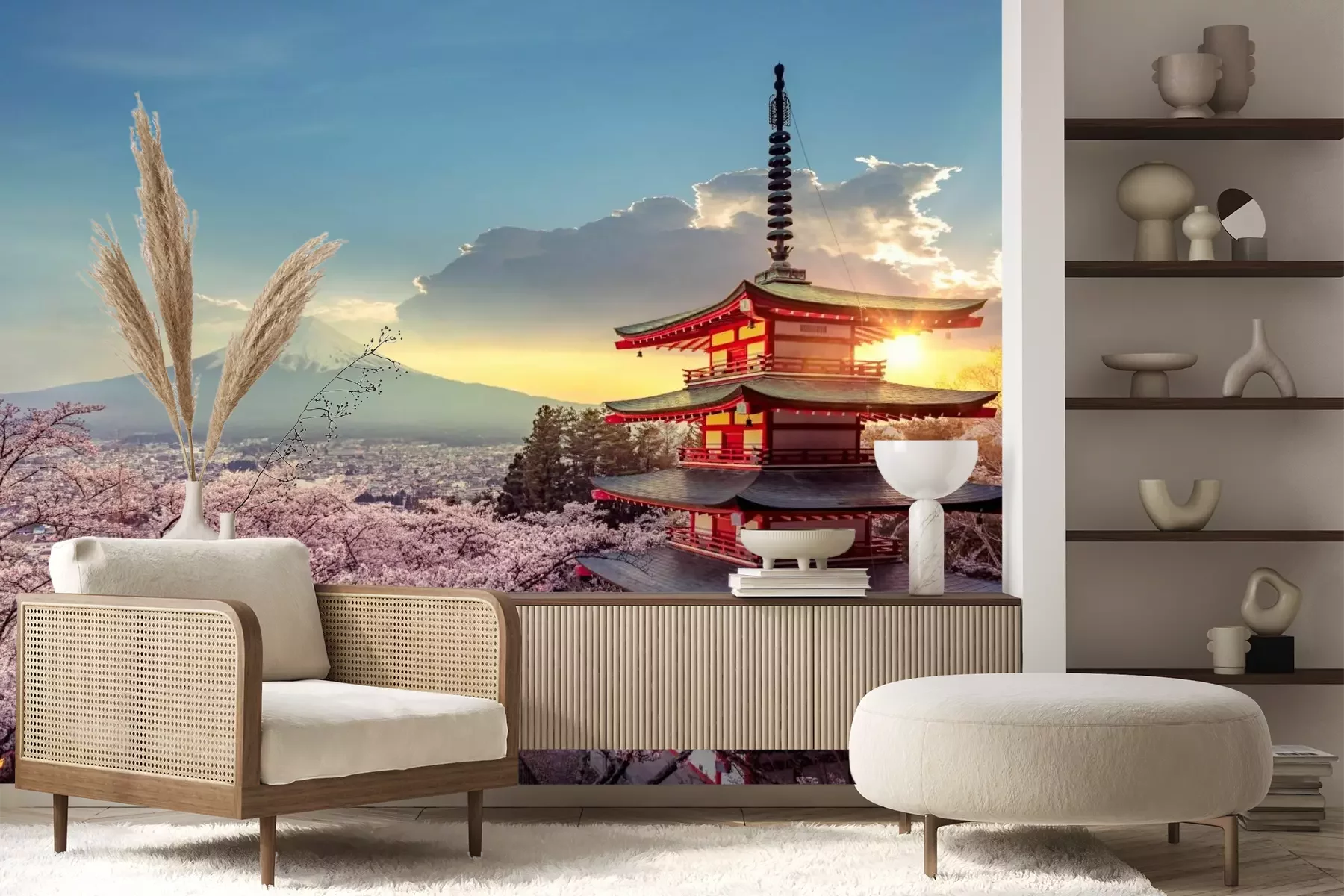 Sonnenuntergang vor Bergen und KirschblütenProblemlose Lieferung durch vertrauenswürdige Spediteure