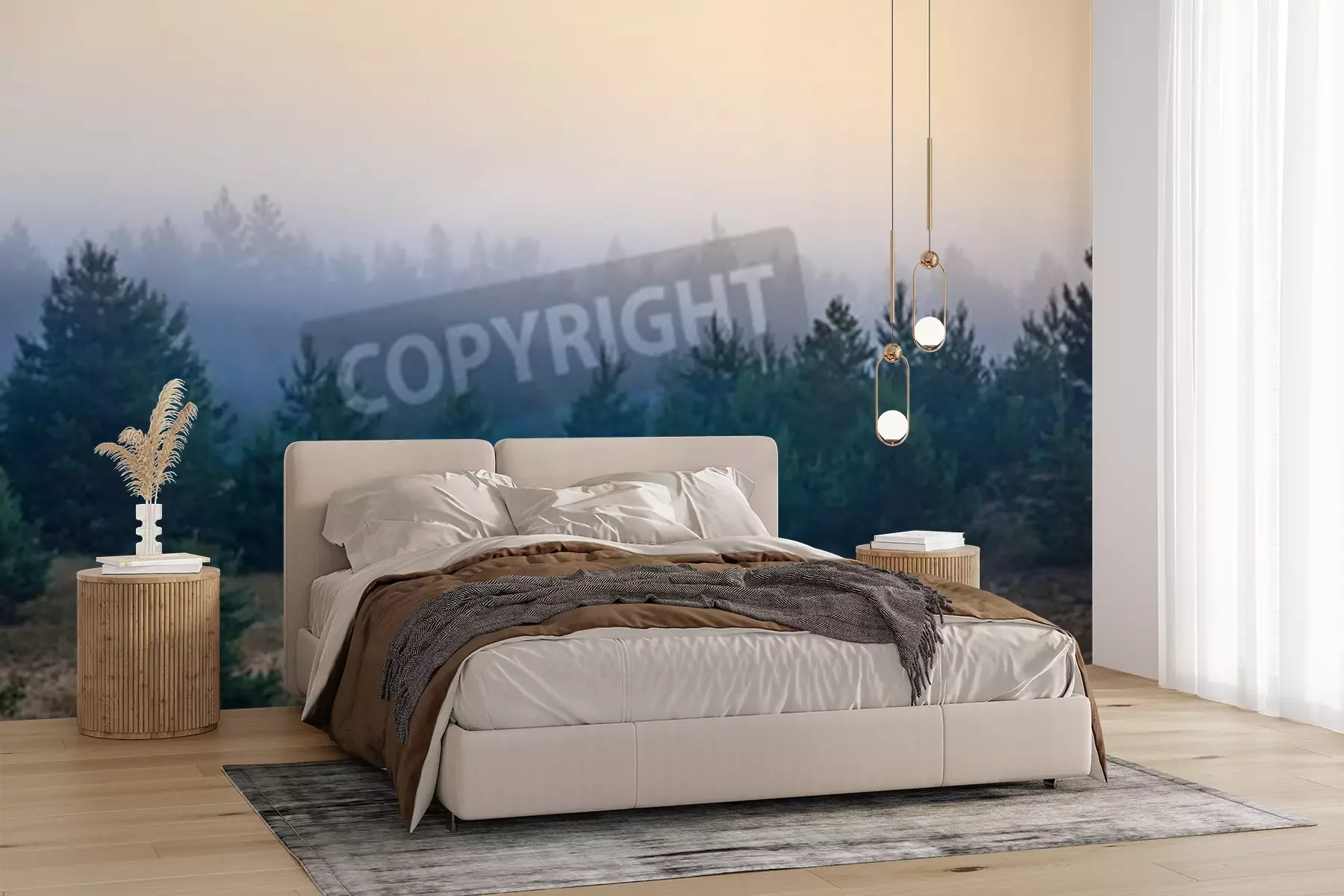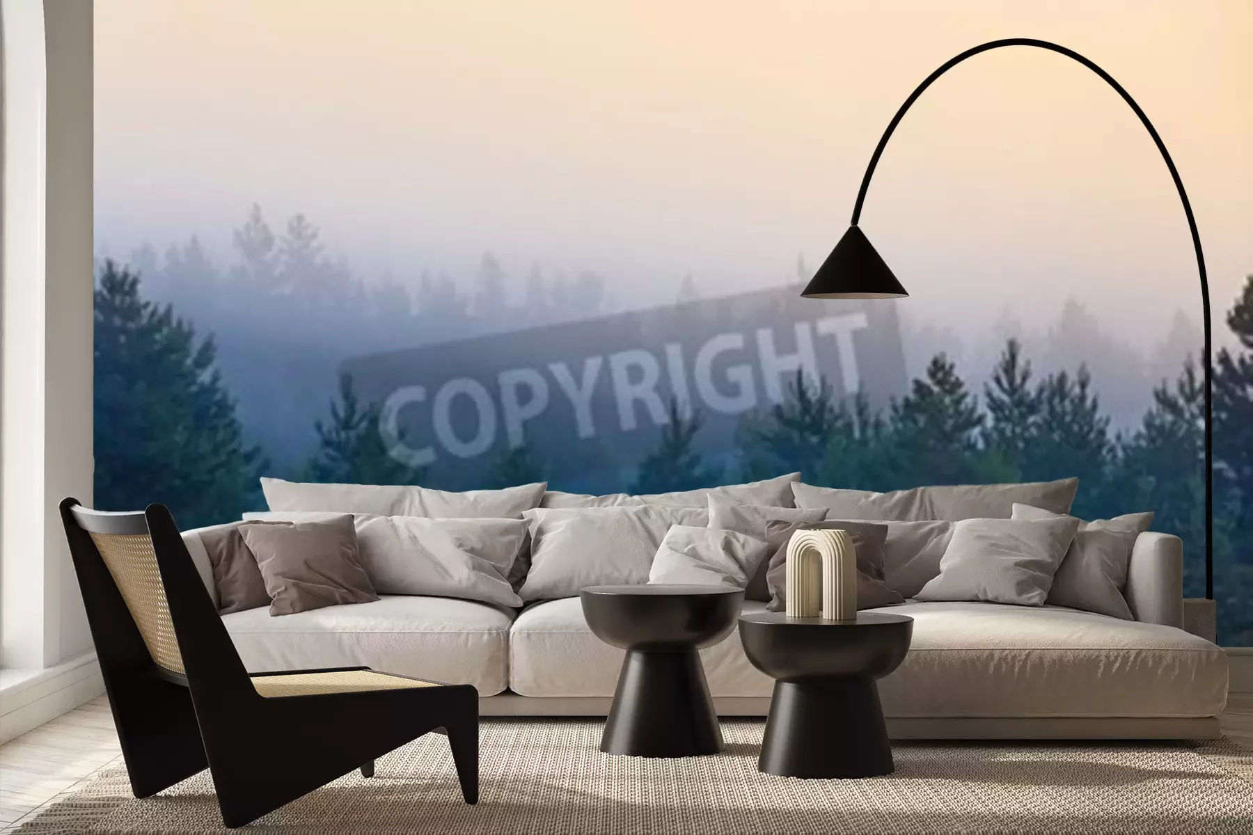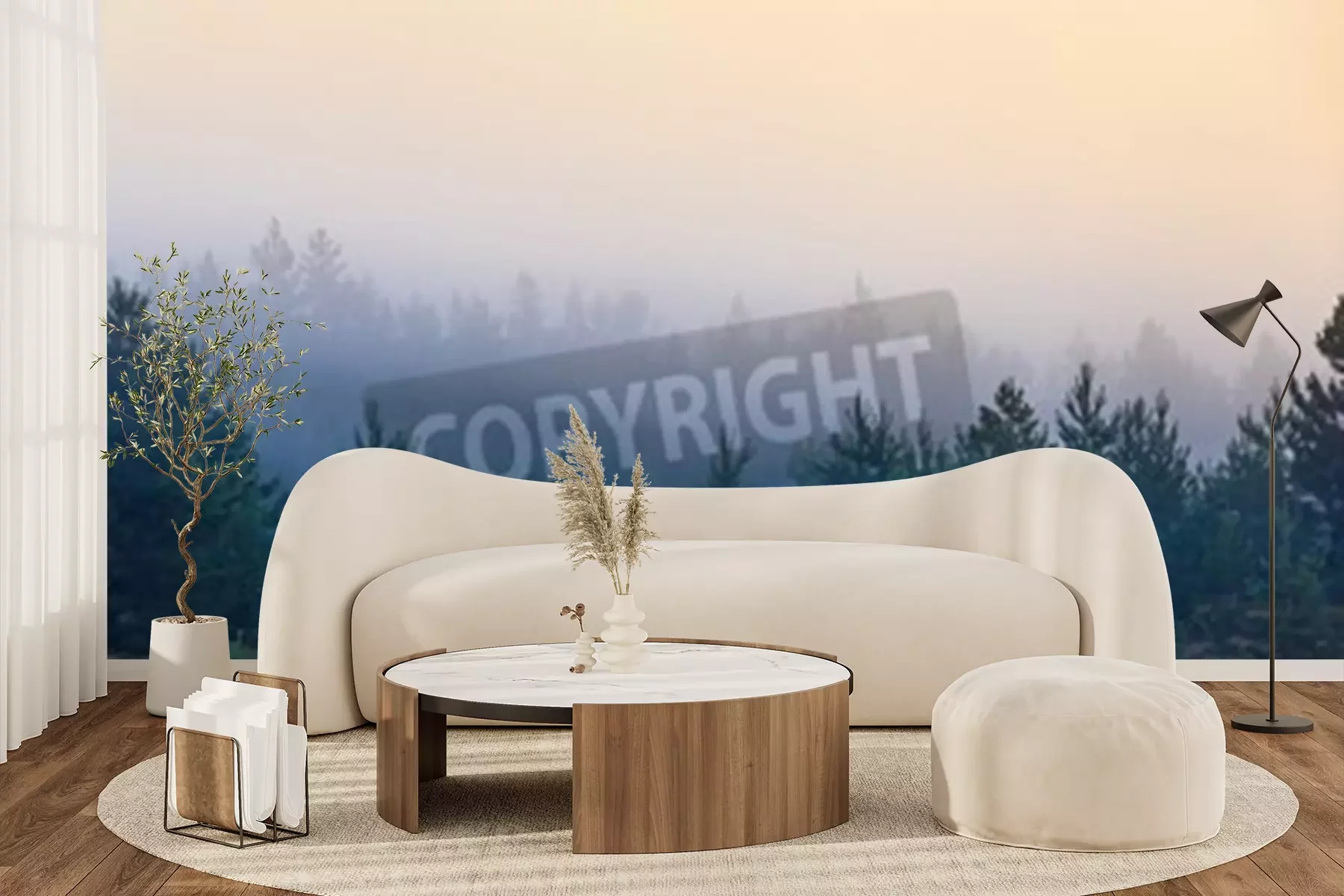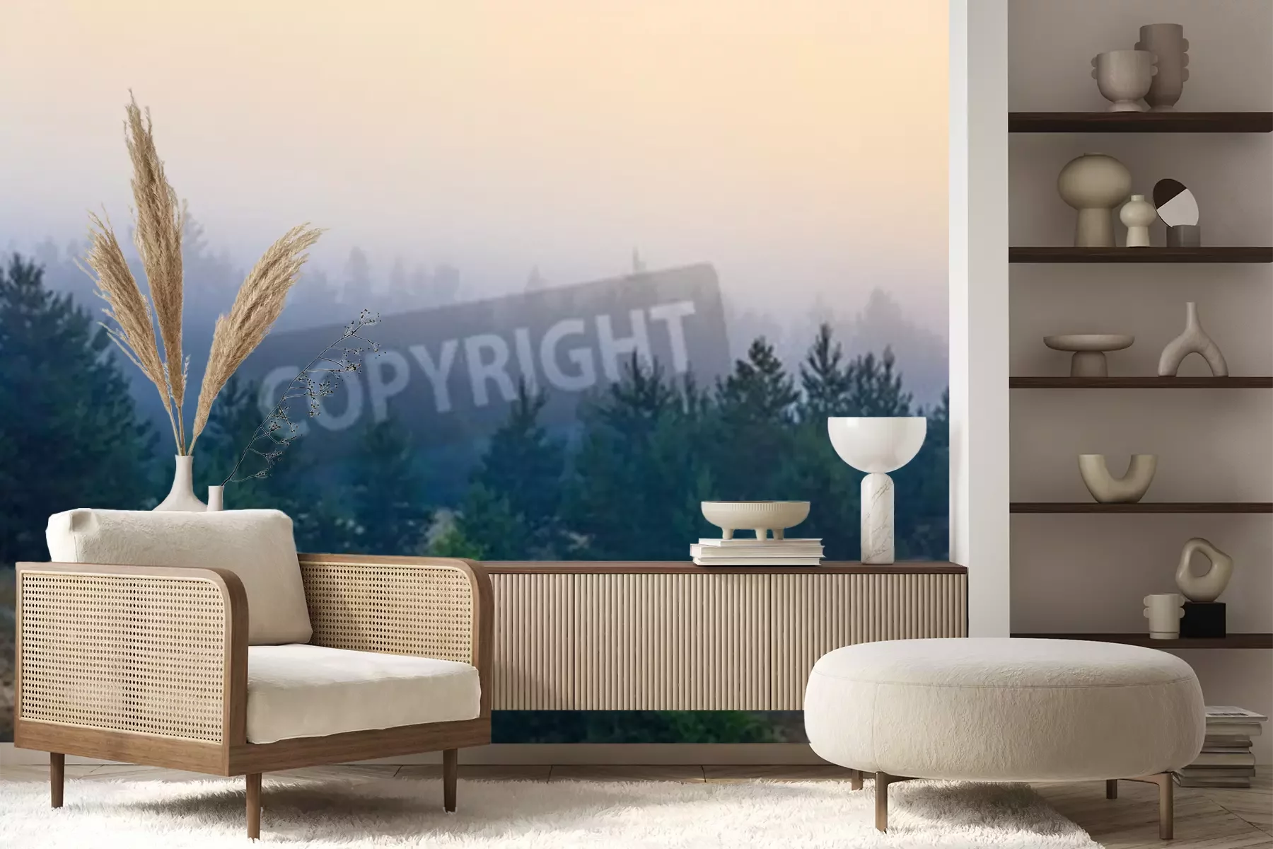 Fototapete Kleine nadelbäume vom nebel umgeben
