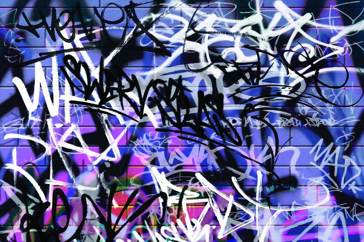 Fototapete: Künstlerische Beschriftungen an einer violetten Backsteinmauer