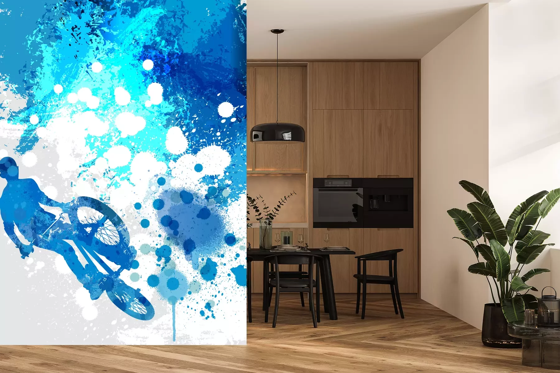 Das Material Premium+ besteht aus einer strukturierten Vinyl-Oberschicht und einem Trägermaterial (Vlies) mit einer Grammatur von 255 g/m², das kleine Unebenheiten der Wand zuverlässig kaschiert. Die feine Sandstruktur verleiht der Oberfläche eine luxuriöse Haptik, während das halbmatte Finish die Tiefe der Farben betont. Das Material ist dampfdurchlässig – so kann diese Fototapete auch in Küchen und Badezimmern eingesetzt werden. Die maximale Breite einer Tapetenbahn beträgt 100 cm. Bei größeren Abmessungen besteht die Fototapete aus mehreren gleich großen Bahnen. Der Kleber wird direkt auf die Wand aufgetragen, und die Fototapete wird auf Stoß angebracht, was für einen ästhetischen Effekt ohne sichtbare Fugen sorgt. Die Oberfläche ist pflegeleicht und kann bei Bedarf sanft mit einem feuchten Tuch abgewischt werden.