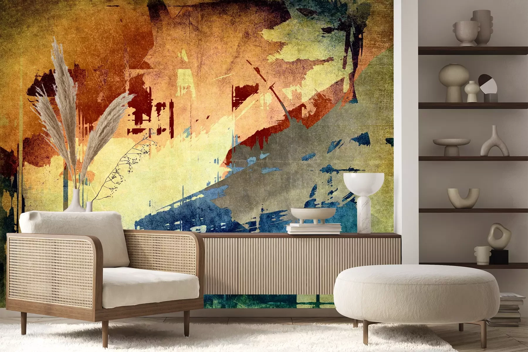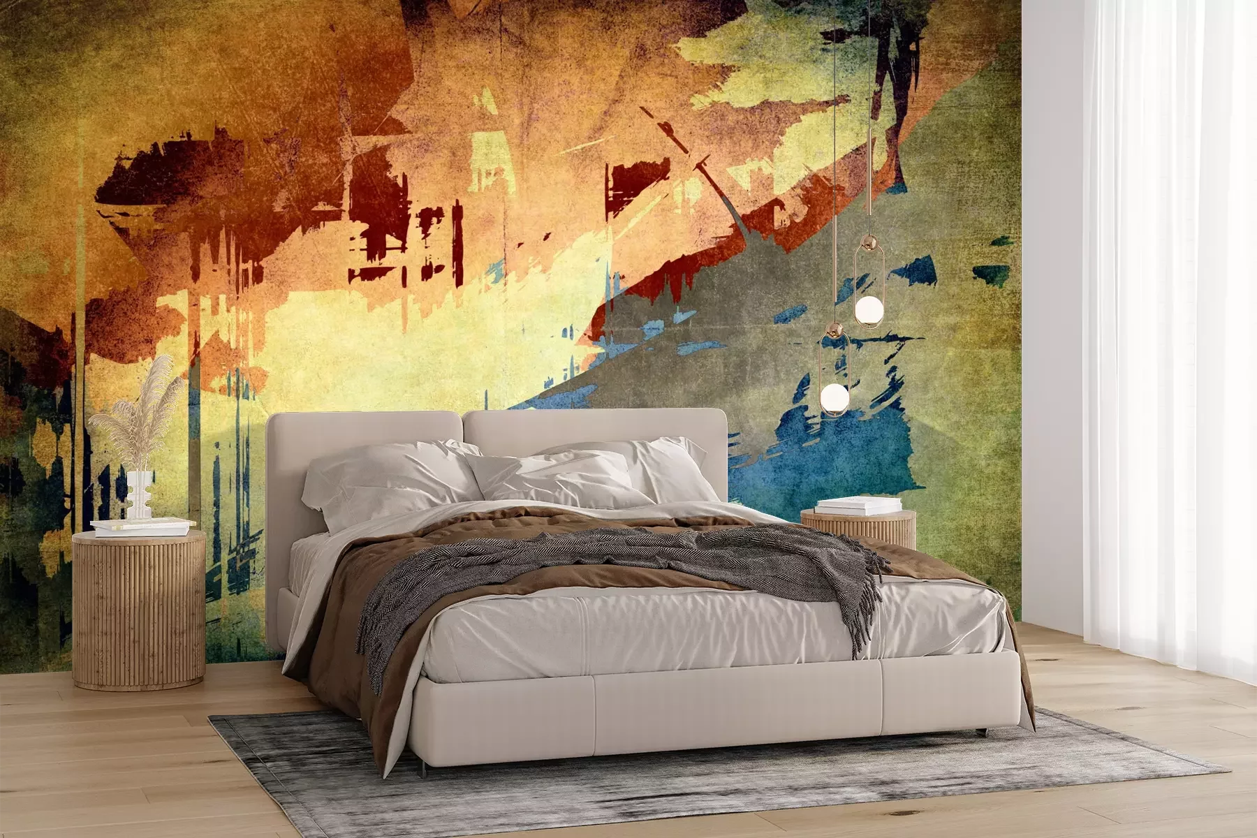 Das Material Premium+ besteht aus einer strukturierten Vinyl-Oberschicht und einem Trägermaterial (Vlies) mit einer Grammatur von 255 g/m², das kleine Unebenheiten der Wand zuverlässig kaschiert. Die feine Sandstruktur verleiht der Oberfläche eine luxuriöse Haptik, während das halbmatte Finish die Tiefe der Farben betont. Das Material ist dampfdurchlässig – so kann diese Fototapete auch in Küchen und Badezimmern eingesetzt werden. Die maximale Breite einer Tapetenbahn beträgt 100 cm. Bei größeren Abmessungen besteht die Fototapete aus mehreren gleich großen Bahnen. Der Kleber wird direkt auf die Wand aufgetragen, und die Fototapete wird auf Stoß angebracht, was für einen ästhetischen Effekt ohne sichtbare Fugen sorgt. Die Oberfläche ist pflegeleicht und kann bei Bedarf sanft mit einem feuchten Tuch abgewischt werden.
