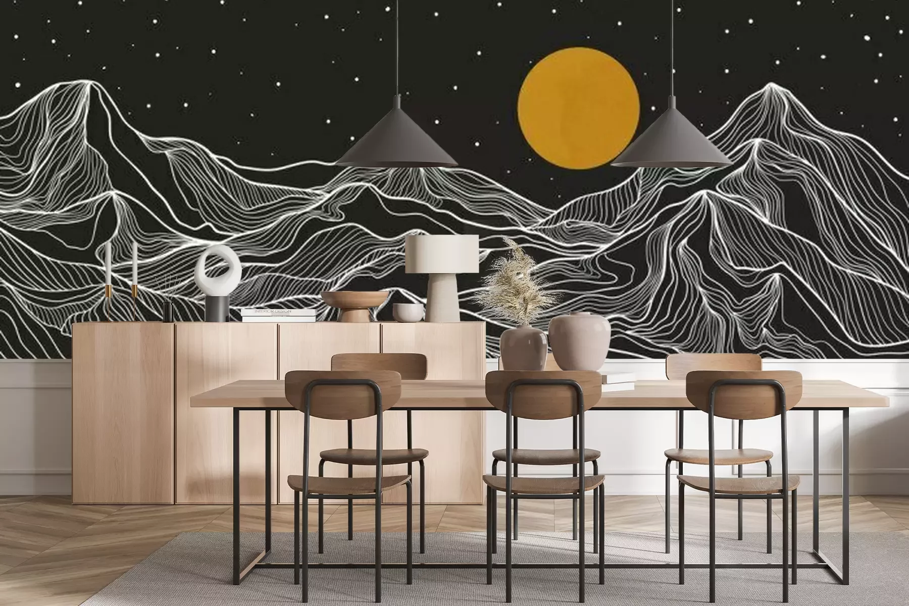 Das Material Premium+ besteht aus einer strukturierten Vinyl-Oberschicht und einem Trägermaterial (Vlies) mit einer Grammatur von 255 g/m², das kleine Unebenheiten der Wand zuverlässig kaschiert. Die feine Sandstruktur verleiht der Oberfläche eine luxuriöse Haptik, während das halbmatte Finish die Tiefe der Farben betont. Das Material ist dampfdurchlässig – so kann diese Fototapete auch in Küchen und Badezimmern eingesetzt werden. Die maximale Breite einer Tapetenbahn beträgt 100 cm. Bei größeren Abmessungen besteht die Fototapete aus mehreren gleich großen Bahnen. Der Kleber wird direkt auf die Wand aufgetragen, und die Fototapete wird auf Stoß angebracht, was für einen ästhetischen Effekt ohne sichtbare Fugen sorgt. Die Oberfläche ist pflegeleicht und kann bei Bedarf sanft mit einem feuchten Tuch abgewischt werden.