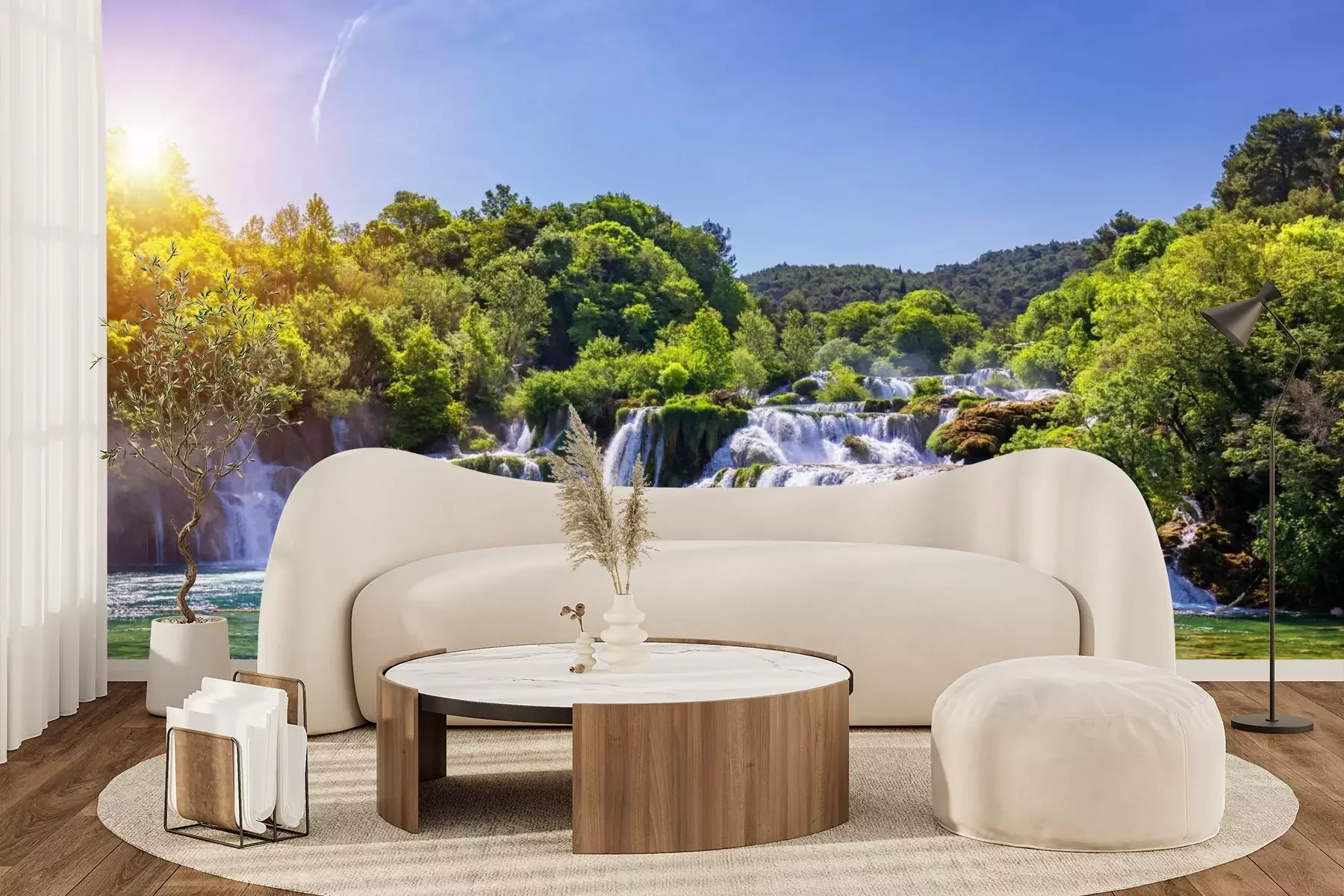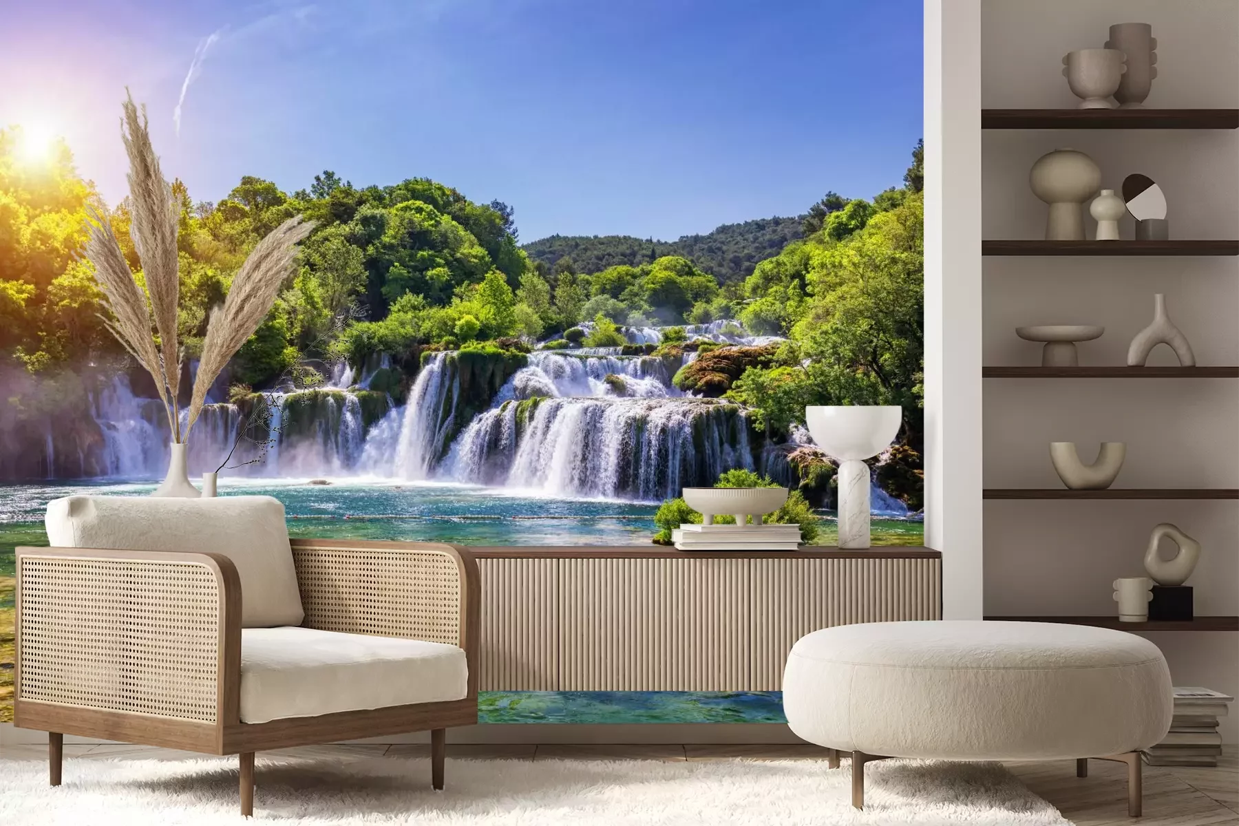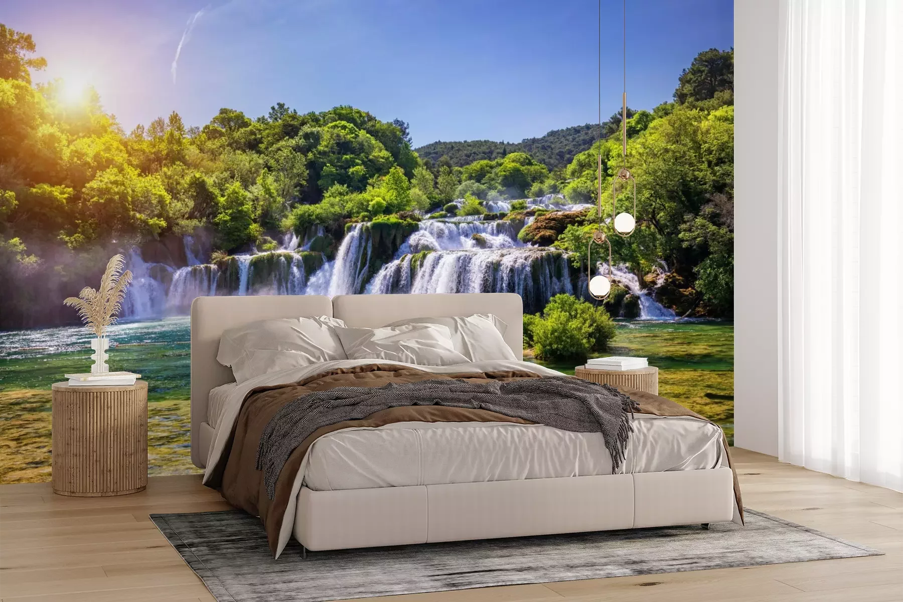Wanddekorationen mit Naturmotiven kommen nie aus der Mode und haben den unbestreitbaren Vorteil, dass sie uns ermöglichen, auch in der Stadt die Nähe zur Natur zu genießen. Ein hervorragender Beweis dafür ist die von uns ausgewählte Fototapete. Landschaft mit einem malerischen und weitläufigen Panorama hat viele Vorteile. Erstens, wenn du eine atemberaubende Aussicht in deine Einrichtung integrierst, kannst du sie in deinem eigenen Wohn- oder Schlafzimmer genießen. Zweitens vergrößerst du optisch den Raum durch das Aufhängen einer solchen Fototapete. Wasserfall, der kaskadenartig von Hügeln herabstürzt, öffnet den Raum visuell zu einer weiten Landschaft hin, was die Wahrnehmung der tatsächlichen Raumgröße völlig verändert. Dies wird durch den blauen Himmel und das kristallklare Wasser im Vordergrund noch verstärkt. Wenn sich eine solche Deko im Raum befindet, bringt die Fototapete Landschaft eine heitere und angenehme Atmosphäre mit sich. Drittens handelt es sich hierbei um ein Muster, das in den meisten Wohnräumen verwendet werden kann. Du kannst damit das Wohnzimmer oder das Schlafzimmer dekorieren und so eine perfekte Umgebung für Entspannung und Erholung schaffen. Eine Landschaft ist ein dekoratives Motiv, das zu vielen Einrichtungsstilen passt – so universell ist diese Fototapete. Natur auf der Wanddekoration harmoniert großartig mit Holzmöbeln, einer hellen Couchgarnitur sowie üppigen Pflanzen mit exotischem Flair. Da unsere Produkte von hoher Qualität und widerstandsfähig gegen schädliche Einflüsse sind, gibt es noch einen weiteren Ort für eine solche Fototapete. Wasserfall in einem malerischen Nationalpark verändert das bisherige Aussehen des Badezimmers und verleiht dem Raum eine völlig neue Ausstrahlung. Dies ist eine ausgezeichnete Lösung, um eine kleine Raumfläche optisch zu vergrößern. Der Schlüssel zum Einrichtungserfolg in diesem Raum ist die Laminierung. Welche Eigenschaften besitzt also eine laminierte Fototapete? Wasser und Feuchtigkeit können der Wanddekoration nichts mehr anhaben, da die Bahnen mit einer Schutzfolie versehen sind. Dadurch kann das Muster sogar an der Wand angebracht werden, an der sich das Waschbecken oder die Badewanne befindet.