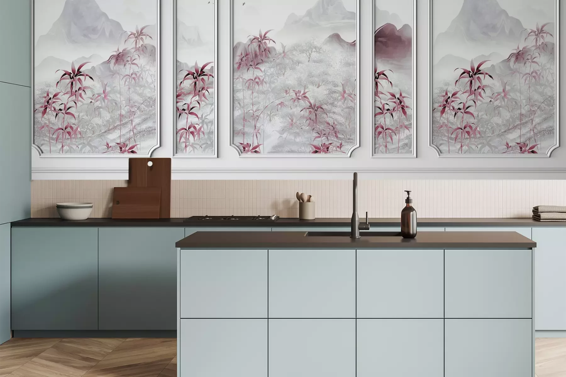Das Material Premium+ besteht aus einer strukturierten Vinyl-Oberschicht und einem Trägermaterial (Vlies) mit einer Grammatur von 255 g/m², das kleine Unebenheiten der Wand zuverlässig kaschiert. Die feine Sandstruktur verleiht der Oberfläche eine luxuriöse Haptik, während das halbmatte Finish die Tiefe der Farben betont. Das Material ist dampfdurchlässig – so kann diese Fototapete auch in Küchen und Badezimmern eingesetzt werden. Die maximale Breite einer Tapetenbahn beträgt 100 cm. Bei größeren Abmessungen besteht die Fototapete aus mehreren gleich großen Bahnen. Der Kleber wird direkt auf die Wand aufgetragen, und die Fototapete wird auf Stoß angebracht, was für einen ästhetischen Effekt ohne sichtbare Fugen sorgt. Die Oberfläche ist pflegeleicht und kann bei Bedarf sanft mit einem feuchten Tuch abgewischt werden.