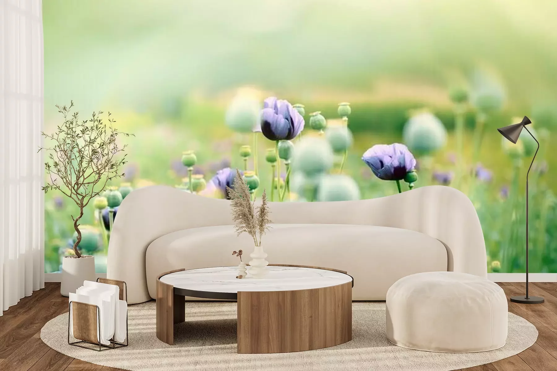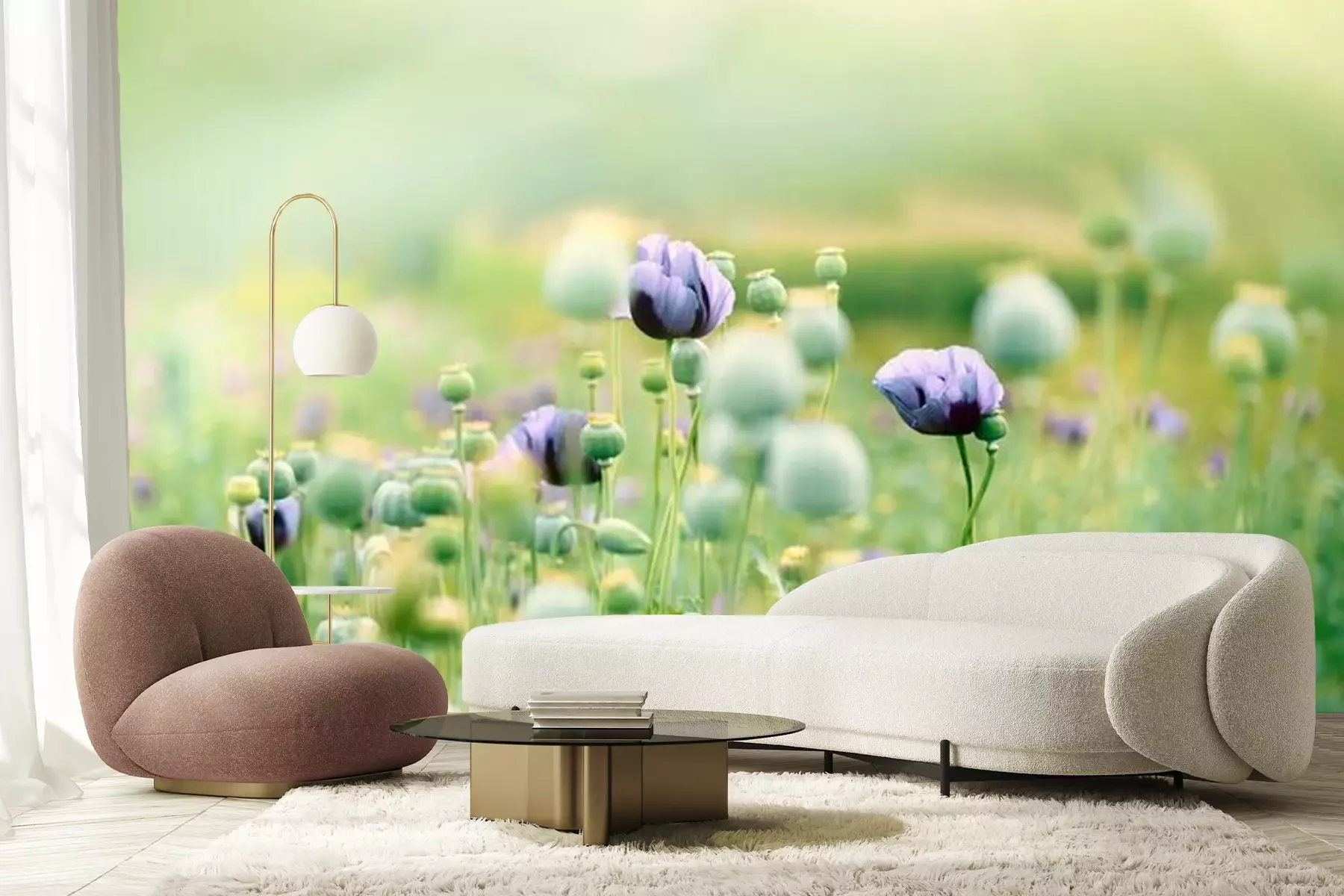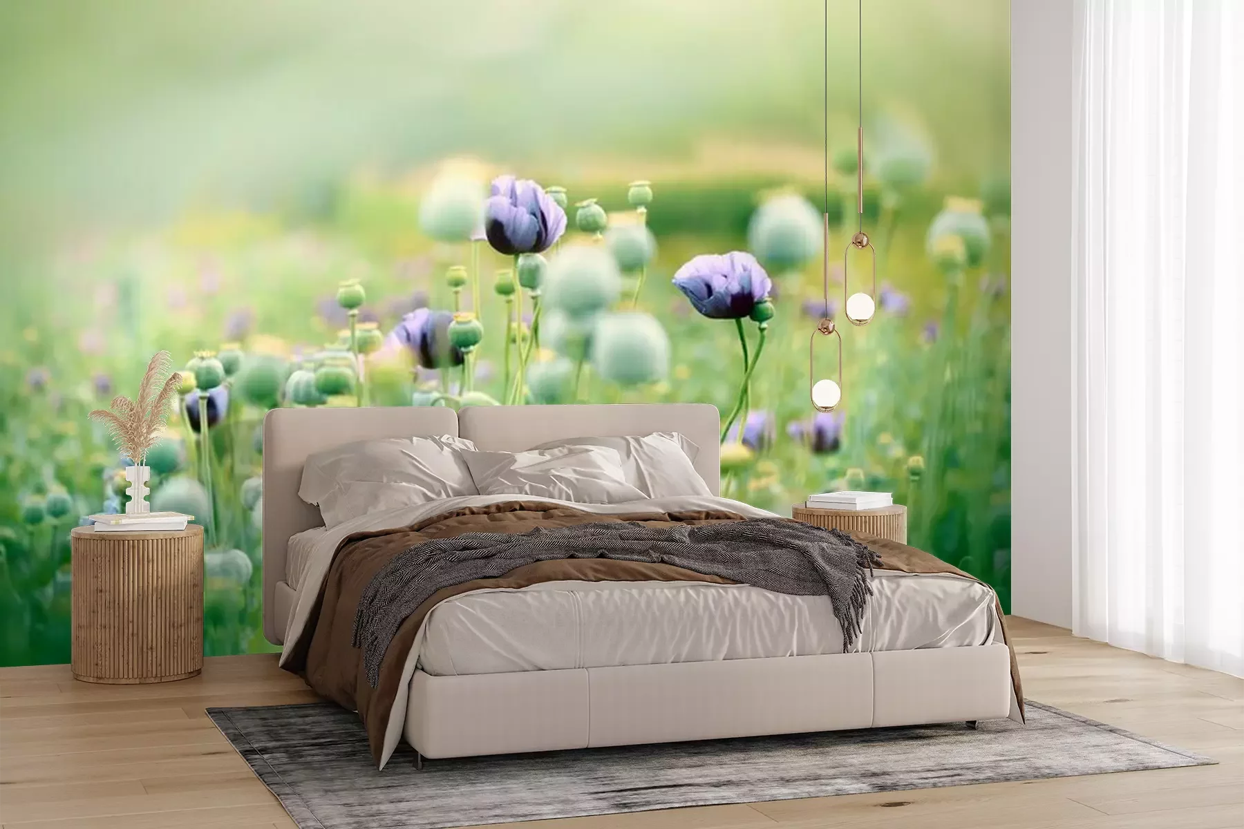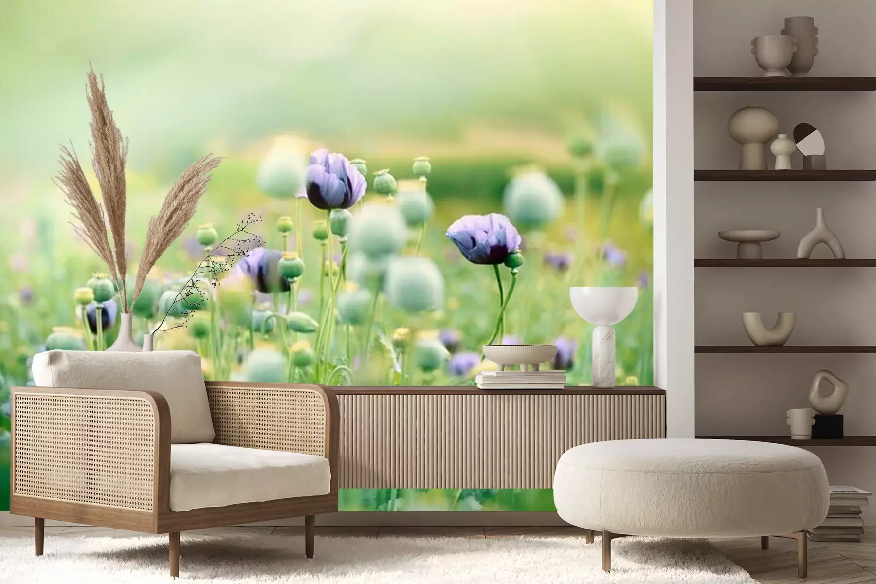 Von der Sonne verbrannte Wiese und BlumenFototapete