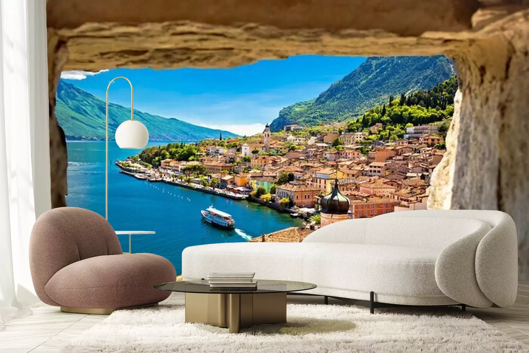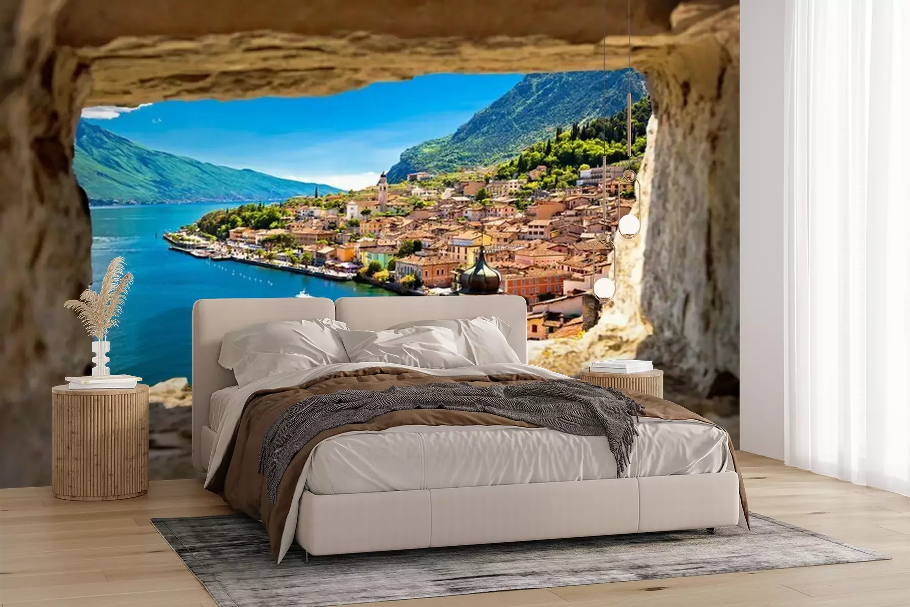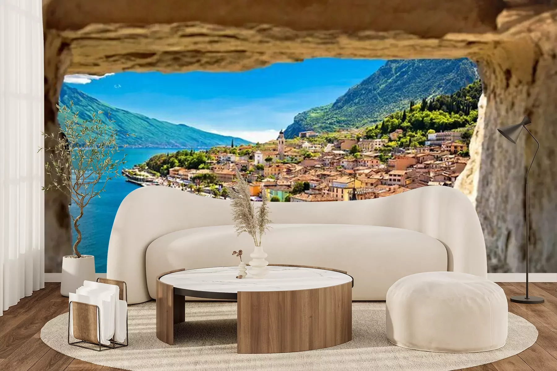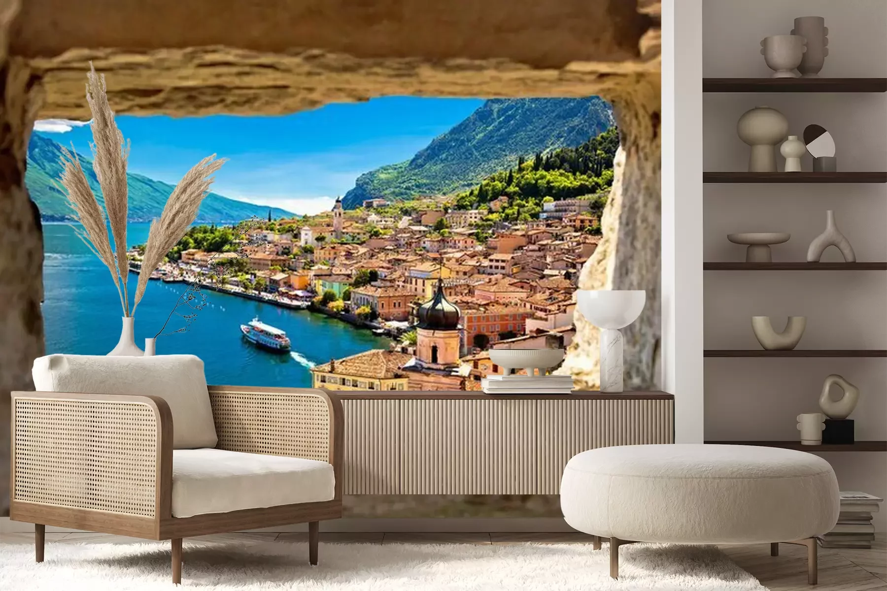 Fototapete Limone sul Garda-Blick durch Steinfenster vom Hügel
