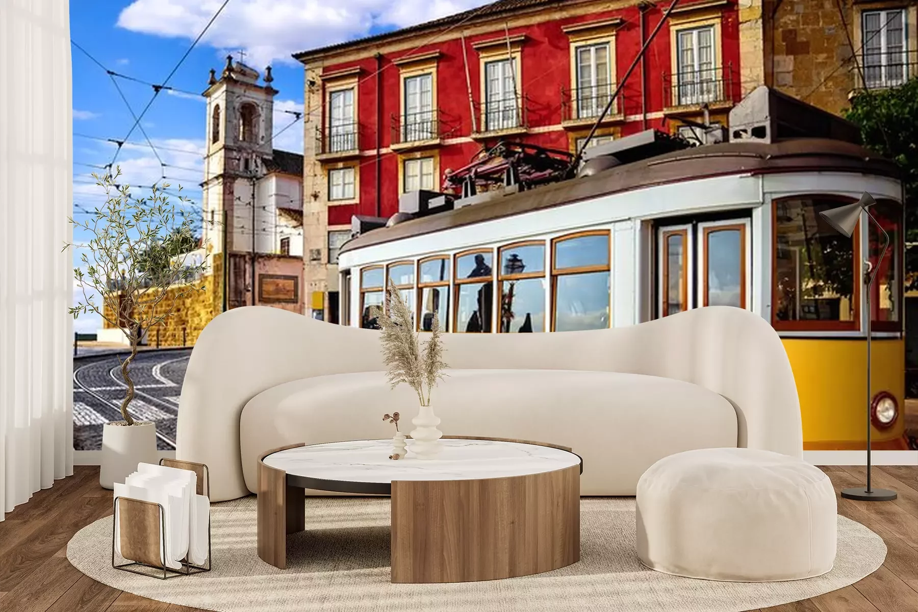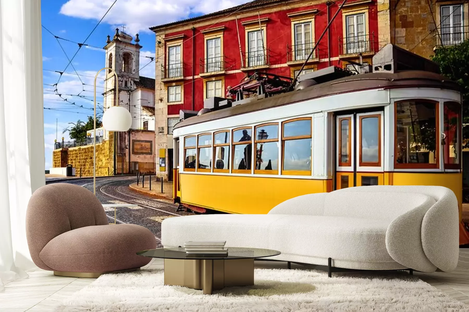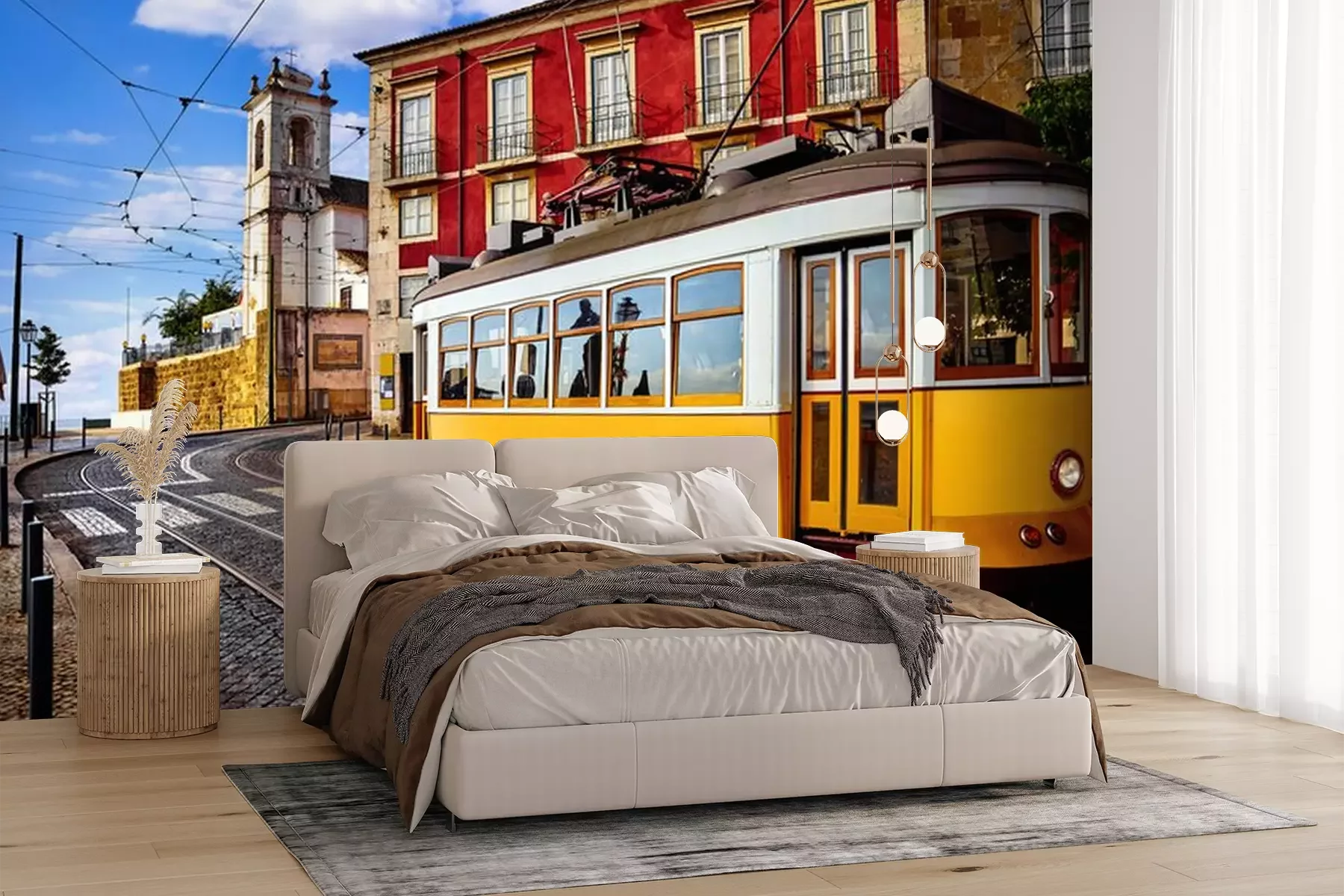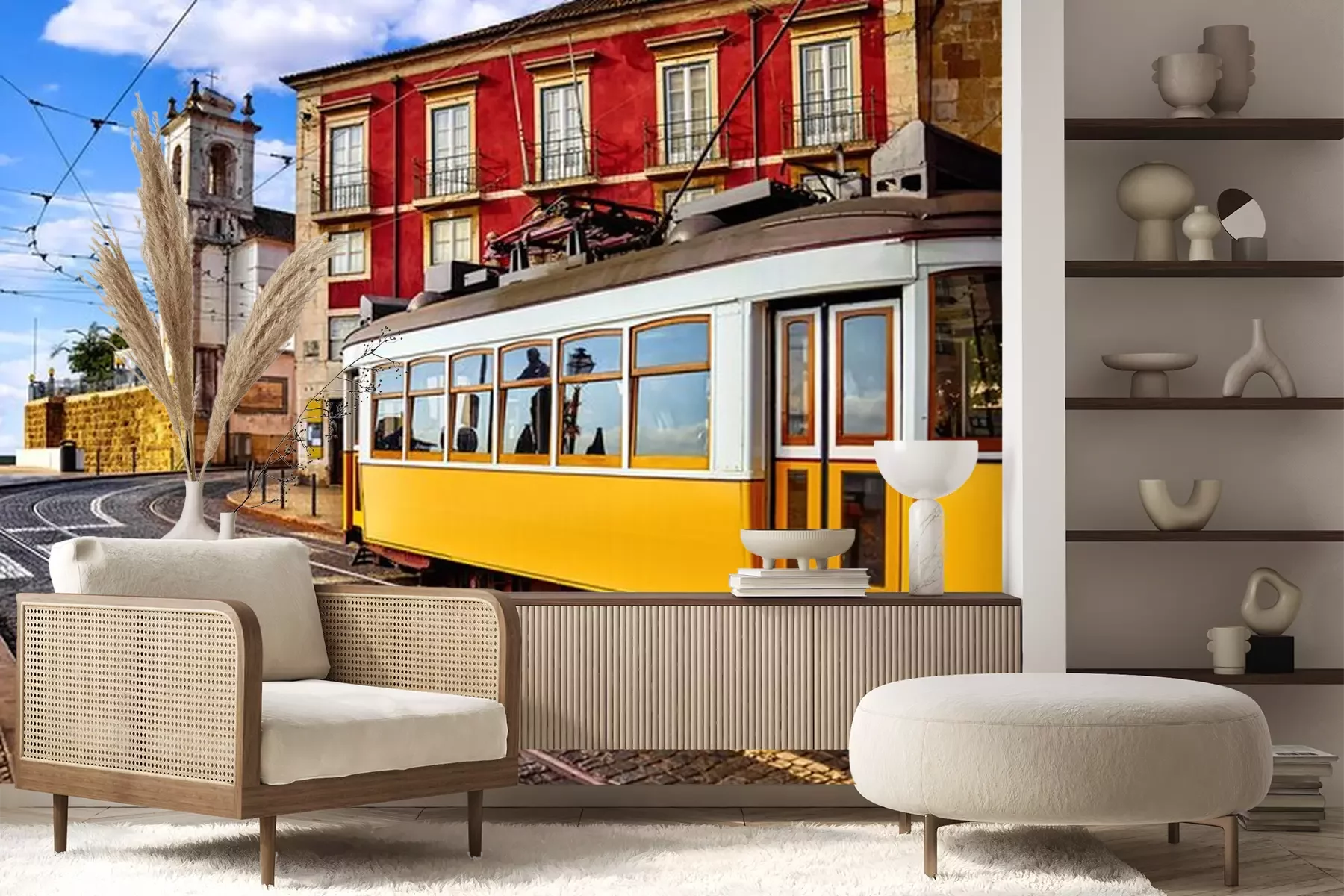 Fototapete Lissabon gelbe Straßenbahn und Gebäude