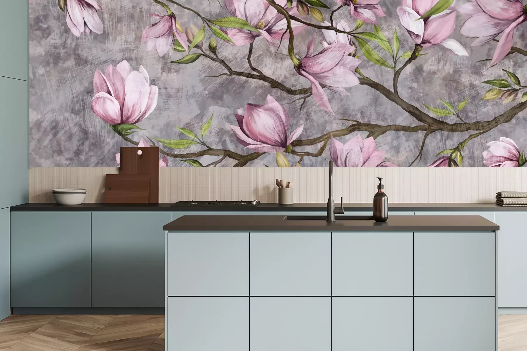 Das Material Premium+ besteht aus einer strukturierten Vinyl-Oberschicht und einem Trägermaterial (Vlies) mit einer Grammatur von 255 g/m², das kleine Unebenheiten der Wand zuverlässig kaschiert. Die feine Sandstruktur verleiht der Oberfläche eine luxuriöse Haptik, während das halbmatte Finish die Tiefe der Farben betont. Das Material ist dampfdurchlässig – so kann diese Fototapete auch in Küchen und Badezimmern eingesetzt werden. Die maximale Breite einer Tapetenbahn beträgt 100 cm. Bei größeren Abmessungen besteht die Fototapete aus mehreren gleich großen Bahnen. Der Kleber wird direkt auf die Wand aufgetragen, und die Fototapete wird auf Stoß angebracht, was für einen ästhetischen Effekt ohne sichtbare Fugen sorgt. Die Oberfläche ist pflegeleicht und kann bei Bedarf sanft mit einem feuchten Tuch abgewischt werden.