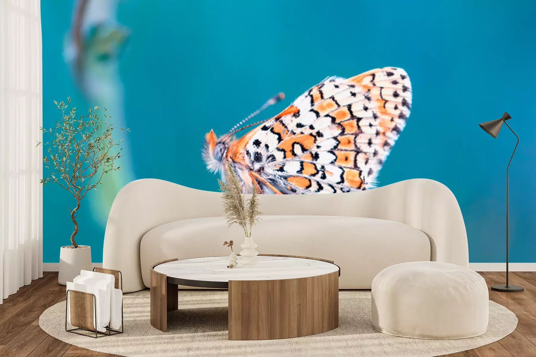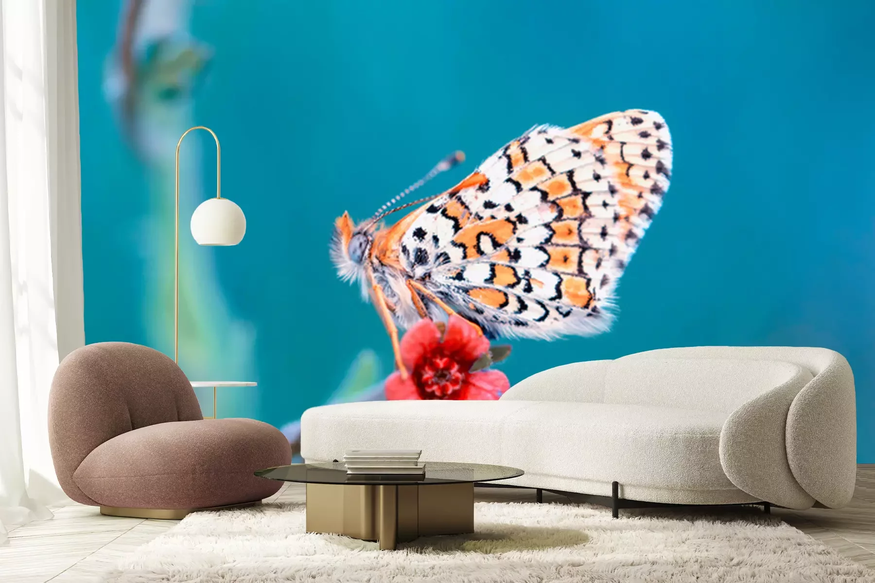 Fototapete Makroaufnahme eines Schmetterlings, der auf roten Blumen sitzt