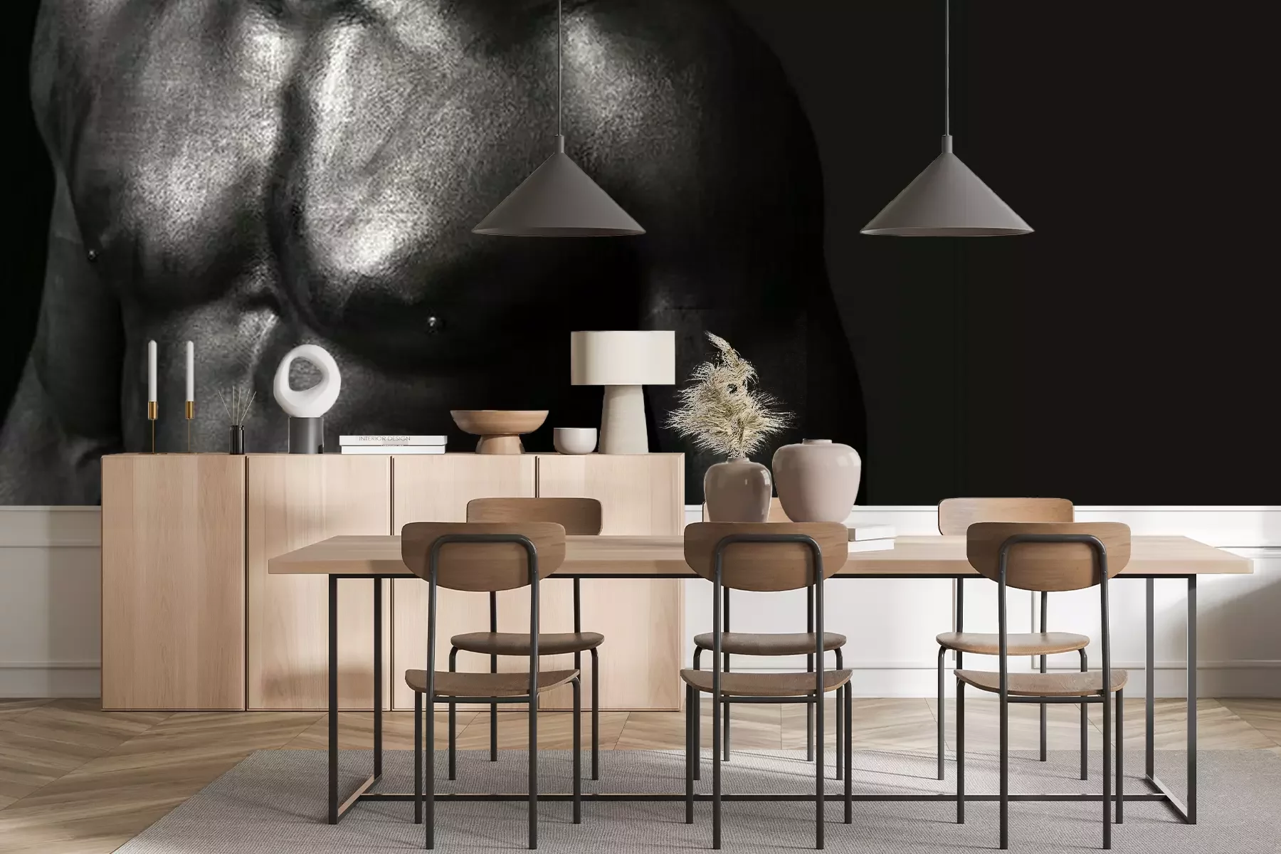 Das Material Premium+ besteht aus einer strukturierten Vinyl-Oberschicht und einem Trägermaterial (Vlies) mit einer Grammatur von 255 g/m², das kleine Unebenheiten der Wand zuverlässig kaschiert. Die feine Sandstruktur verleiht der Oberfläche eine luxuriöse Haptik, während das halbmatte Finish die Tiefe der Farben betont. Das Material ist dampfdurchlässig – so kann diese Fototapete auch in Küchen und Badezimmern eingesetzt werden. Die maximale Breite einer Tapetenbahn beträgt 100 cm. Bei größeren Abmessungen besteht die Fototapete aus mehreren gleich großen Bahnen. Der Kleber wird direkt auf die Wand aufgetragen, und die Fototapete wird auf Stoß angebracht, was für einen ästhetischen Effekt ohne sichtbare Fugen sorgt. Die Oberfläche ist pflegeleicht und kann bei Bedarf sanft mit einem feuchten Tuch abgewischt werden.