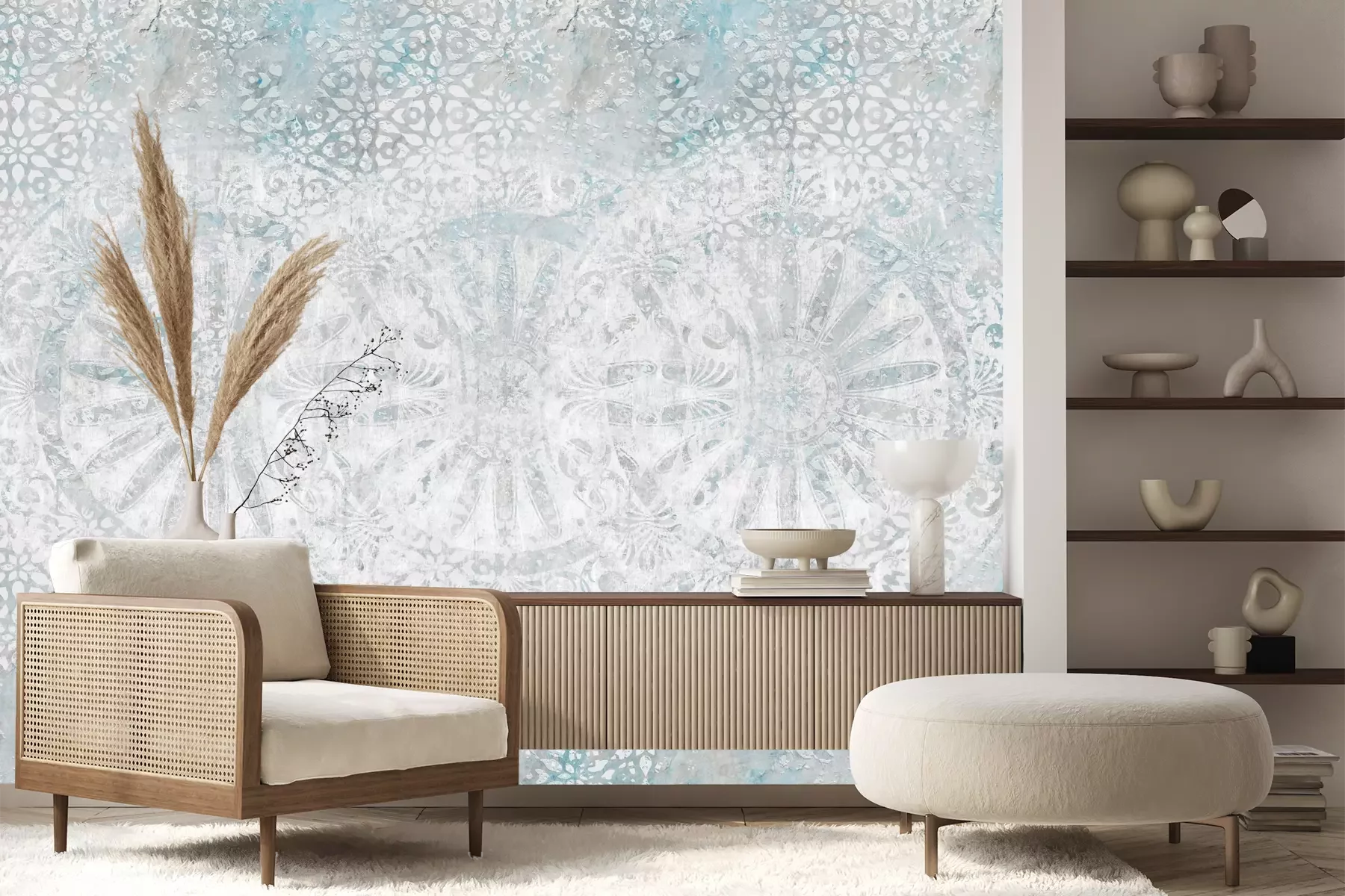 Das Material Premium+ besteht aus einer strukturierten Vinyl-Oberschicht und einem Trägermaterial (Vlies) mit einer Grammatur von 255 g/m², das kleine Unebenheiten der Wand zuverlässig kaschiert. Die feine Sandstruktur verleiht der Oberfläche eine luxuriöse Haptik, während das halbmatte Finish die Tiefe der Farben betont. Das Material ist dampfdurchlässig – so kann diese Fototapete auch in Küchen und Badezimmern eingesetzt werden. Die maximale Breite einer Tapetenbahn beträgt 100 cm. Bei größeren Abmessungen besteht die Fototapete aus mehreren gleich großen Bahnen. Der Kleber wird direkt auf die Wand aufgetragen, und die Fototapete wird auf Stoß angebracht, was für einen ästhetischen Effekt ohne sichtbare Fugen sorgt. Die Oberfläche ist pflegeleicht und kann bei Bedarf sanft mit einem feuchten Tuch abgewischt werden.