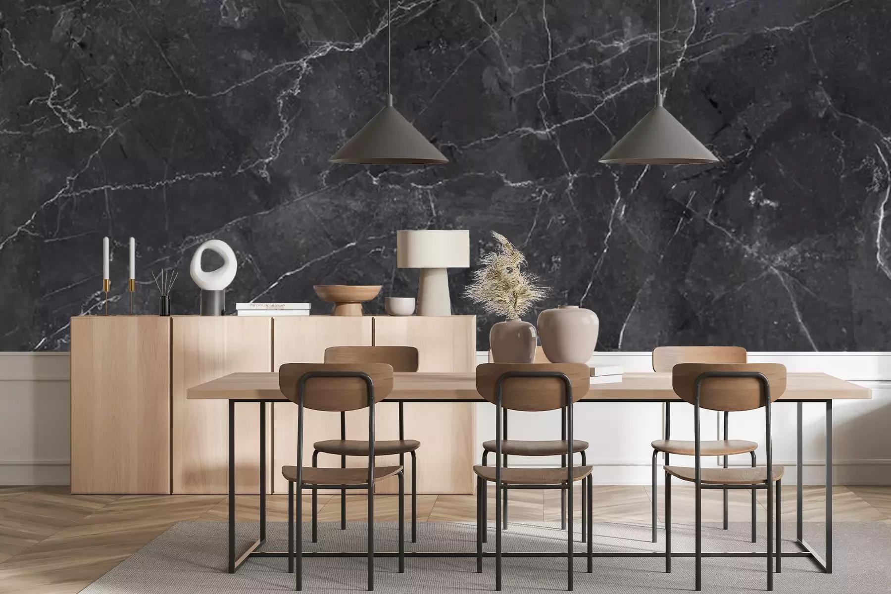 Das Material Premium+ besteht aus einer strukturierten Vinyl-Oberschicht und einem Trägermaterial (Vlies) mit einer Grammatur von 255 g/m², das kleine Unebenheiten der Wand zuverlässig kaschiert. Die feine Sandstruktur verleiht der Oberfläche eine luxuriöse Haptik, während das halbmatte Finish die Tiefe der Farben betont. Das Material ist dampfdurchlässig – so kann diese Fototapete auch in Küchen und Badezimmern eingesetzt werden. Die maximale Breite einer Tapetenbahn beträgt 100 cm. Bei größeren Abmessungen besteht die Fototapete aus mehreren gleich großen Bahnen. Der Kleber wird direkt auf die Wand aufgetragen, und die Fototapete wird auf Stoß angebracht, was für einen ästhetischen Effekt ohne sichtbare Fugen sorgt. Die Oberfläche ist pflegeleicht und kann bei Bedarf sanft mit einem feuchten Tuch abgewischt werden.