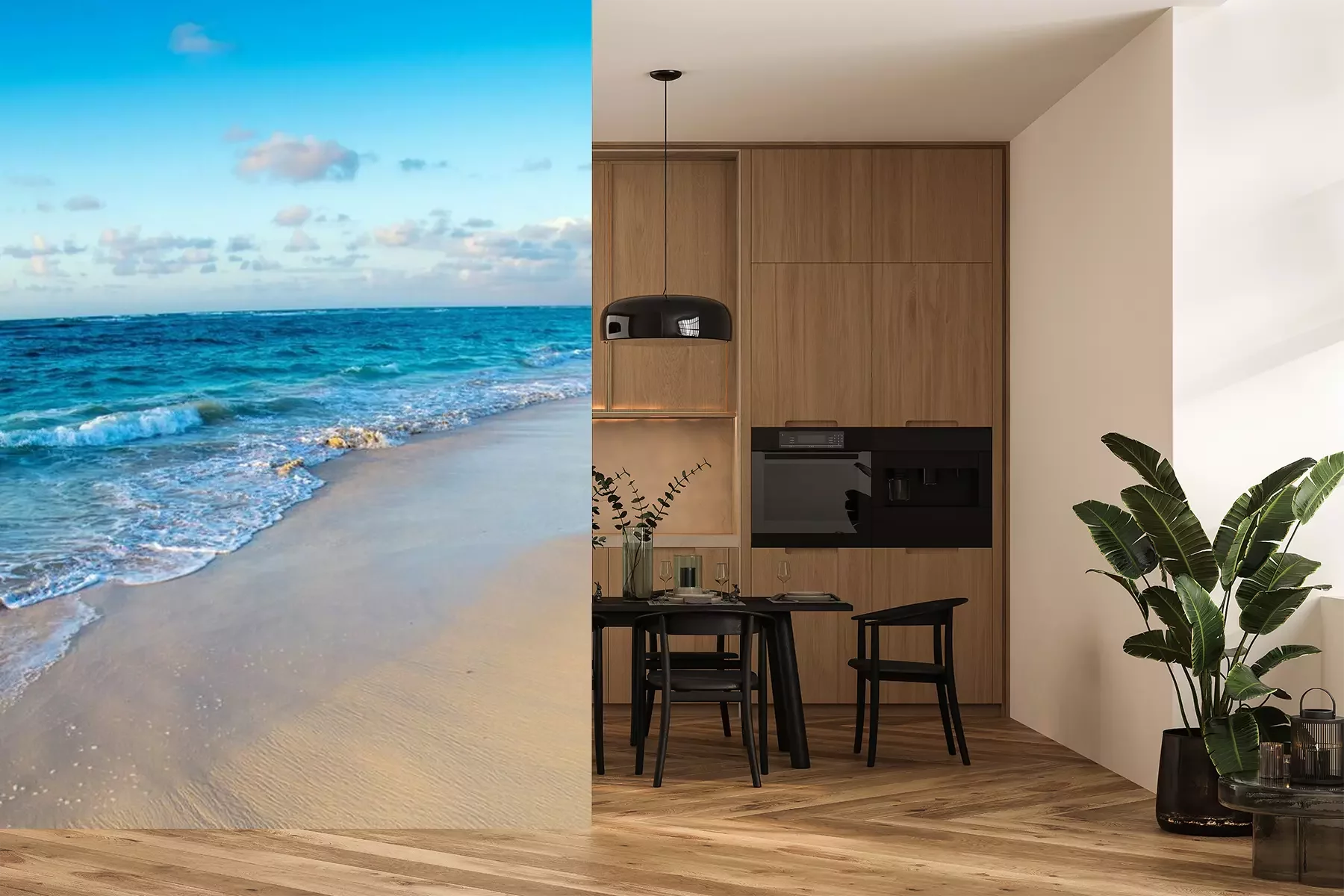 Das Material Premium+ besteht aus einer strukturierten Vinyl-Oberschicht und einem Trägermaterial (Vlies) mit einer Grammatur von 255 g/m², das kleine Unebenheiten der Wand zuverlässig kaschiert. Die feine Sandstruktur verleiht der Oberfläche eine luxuriöse Haptik, während das halbmatte Finish die Tiefe der Farben betont. Das Material ist dampfdurchlässig – so kann diese Fototapete auch in Küchen und Badezimmern eingesetzt werden. Die maximale Breite einer Tapetenbahn beträgt 100 cm. Bei größeren Abmessungen besteht die Fototapete aus mehreren gleich großen Bahnen. Der Kleber wird direkt auf die Wand aufgetragen, und die Fototapete wird auf Stoß angebracht, was für einen ästhetischen Effekt ohne sichtbare Fugen sorgt. Die Oberfläche ist pflegeleicht und kann bei Bedarf sanft mit einem feuchten Tuch abgewischt werden.
