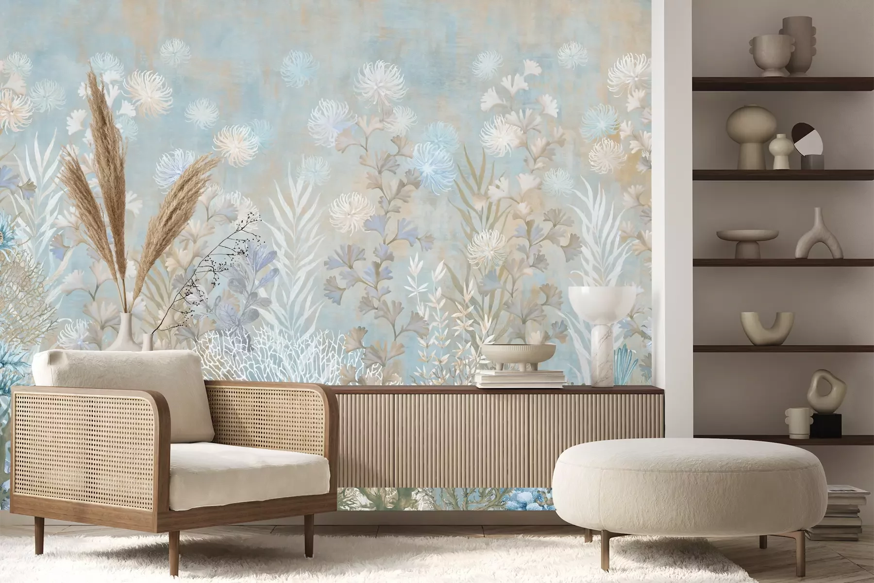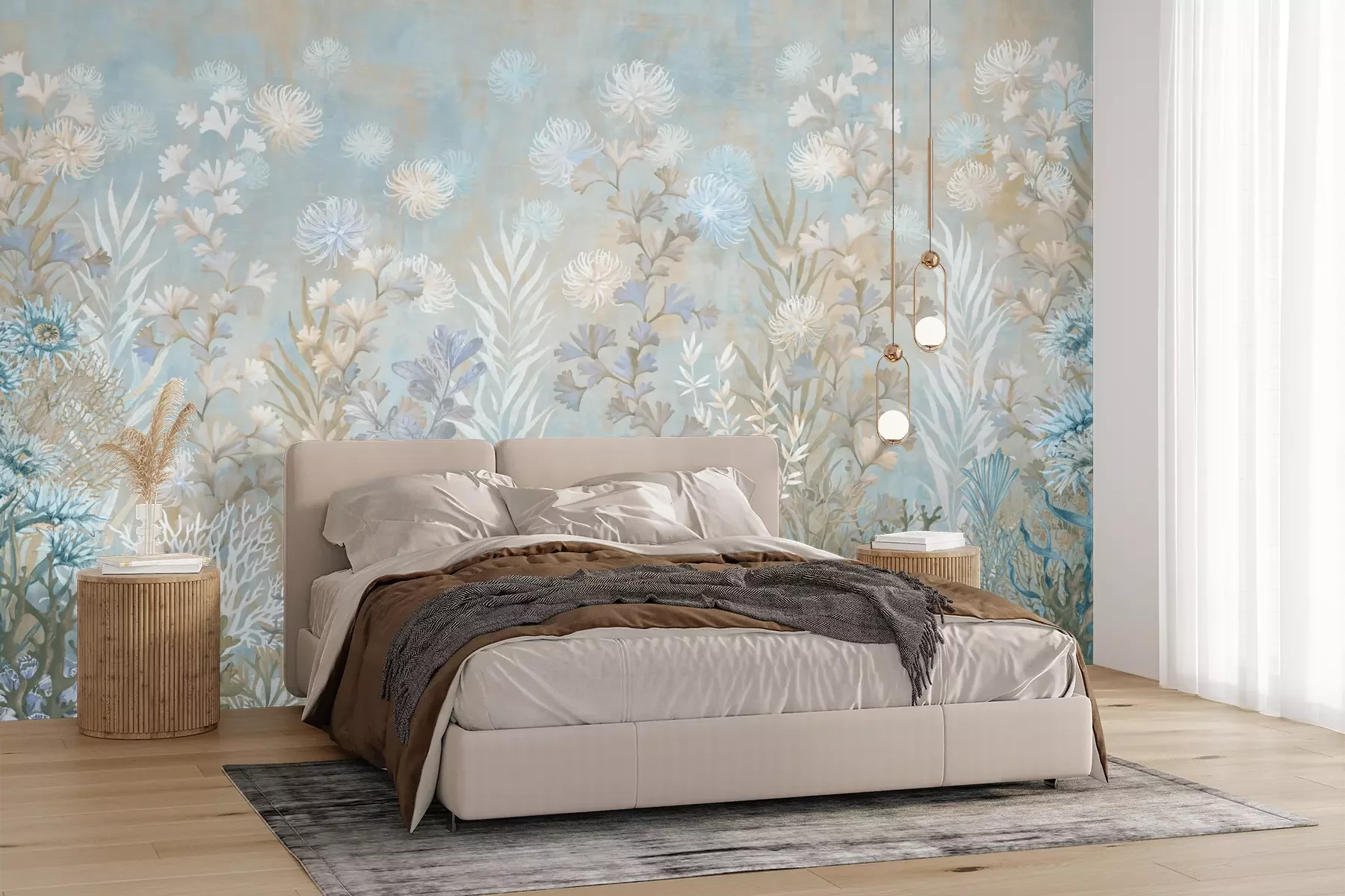 Das Material Premium+ besteht aus einer strukturierten Vinyl-Oberschicht und einem Trägermaterial (Vlies) mit einer Grammatur von 255 g/m², das kleine Unebenheiten der Wand zuverlässig kaschiert. Die feine Sandstruktur verleiht der Oberfläche eine luxuriöse Haptik, während das halbmatte Finish die Tiefe der Farben betont. Das Material ist dampfdurchlässig – so kann diese Fototapete auch in Küchen und Badezimmern eingesetzt werden. Die maximale Breite einer Tapetenbahn beträgt 100 cm. Bei größeren Abmessungen besteht die Fototapete aus mehreren gleich großen Bahnen. Der Kleber wird direkt auf die Wand aufgetragen, und die Fototapete wird auf Stoß angebracht, was für einen ästhetischen Effekt ohne sichtbare Fugen sorgt. Die Oberfläche ist pflegeleicht und kann bei Bedarf sanft mit einem feuchten Tuch abgewischt werden.