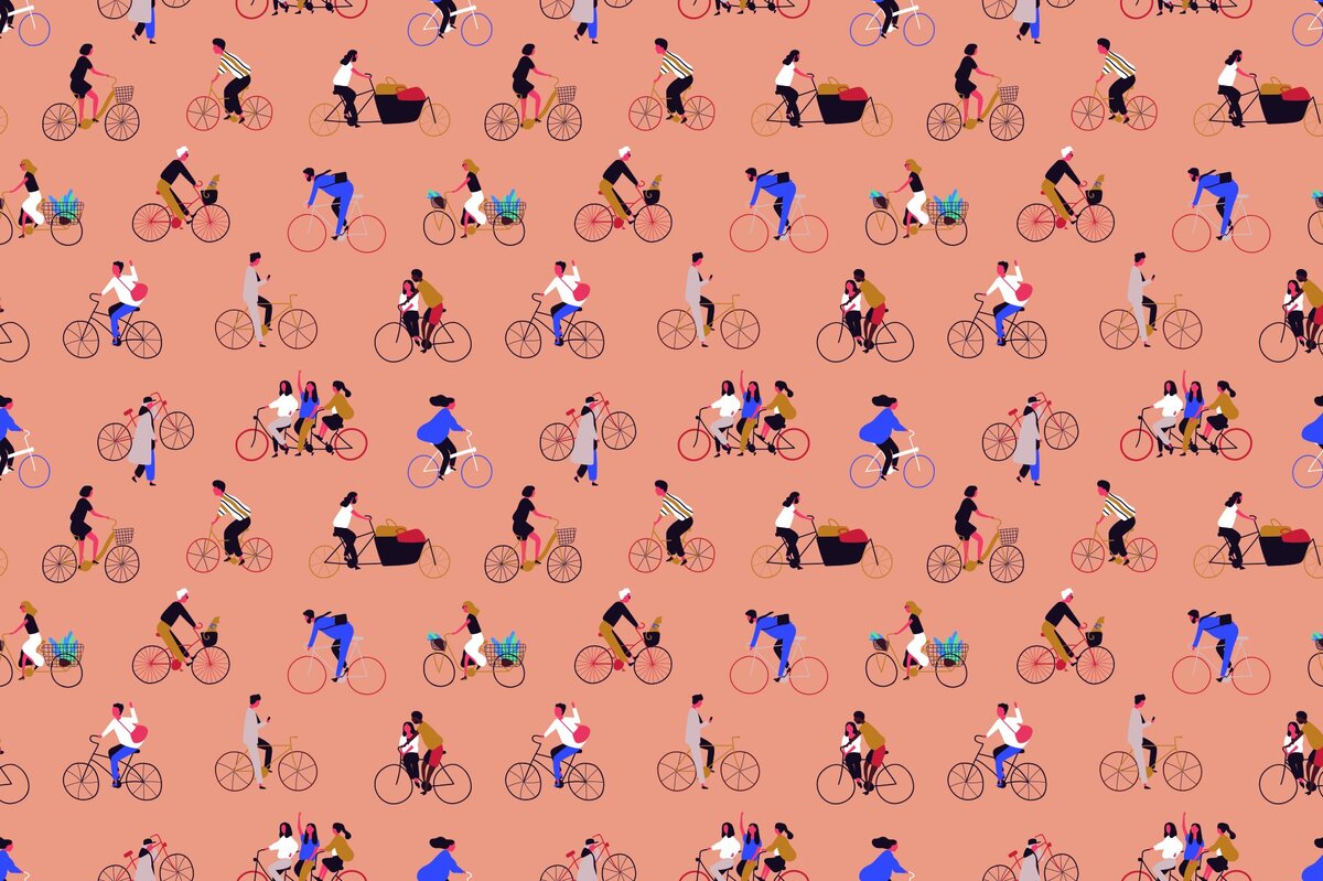 Menschen, die auf einem orangefarbenen hintergrund fahrrad fahren