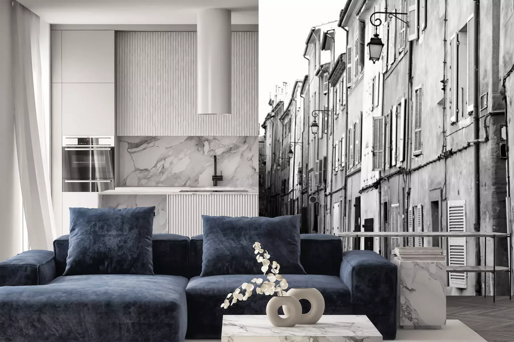Das Material Premium+ besteht aus einer strukturierten Vinyl-Oberschicht und einem Trägermaterial (Vlies) mit einer Grammatur von 255 g/m², das kleine Unebenheiten der Wand zuverlässig kaschiert. Die feine Sandstruktur verleiht der Oberfläche eine luxuriöse Haptik, während das halbmatte Finish die Tiefe der Farben betont. Das Material ist dampfdurchlässig – so kann diese Fototapete auch in Küchen und Badezimmern eingesetzt werden. Die maximale Breite einer Tapetenbahn beträgt 100 cm. Bei größeren Abmessungen besteht die Fototapete aus mehreren gleich großen Bahnen. Der Kleber wird direkt auf die Wand aufgetragen, und die Fototapete wird auf Stoß angebracht, was für einen ästhetischen Effekt ohne sichtbare Fugen sorgt. Die Oberfläche ist pflegeleicht und kann bei Bedarf sanft mit einem feuchten Tuch abgewischt werden.