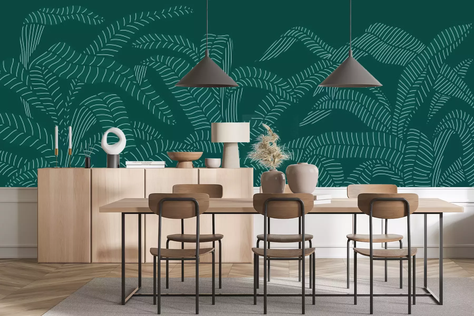 Fototapete Minimalistische Skizze von Blättern auf dunkelgrünem Hintergrund