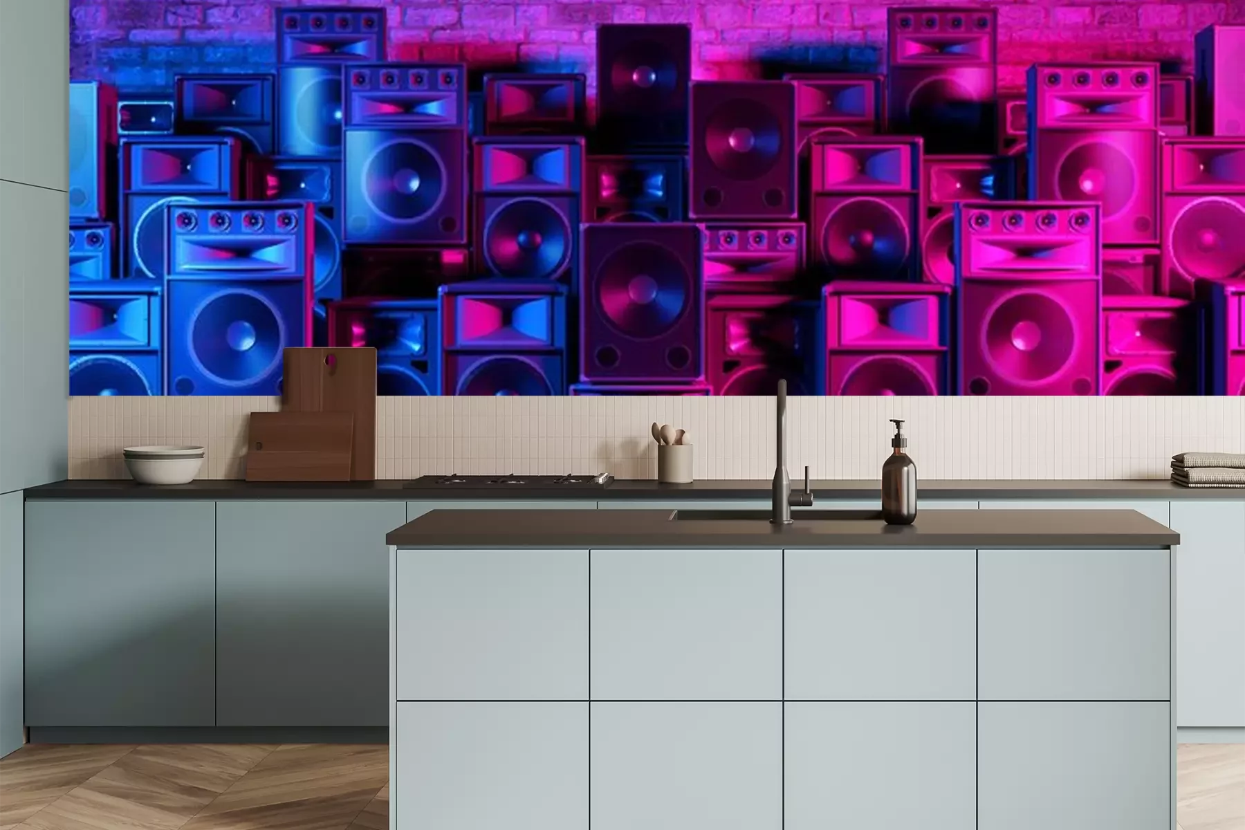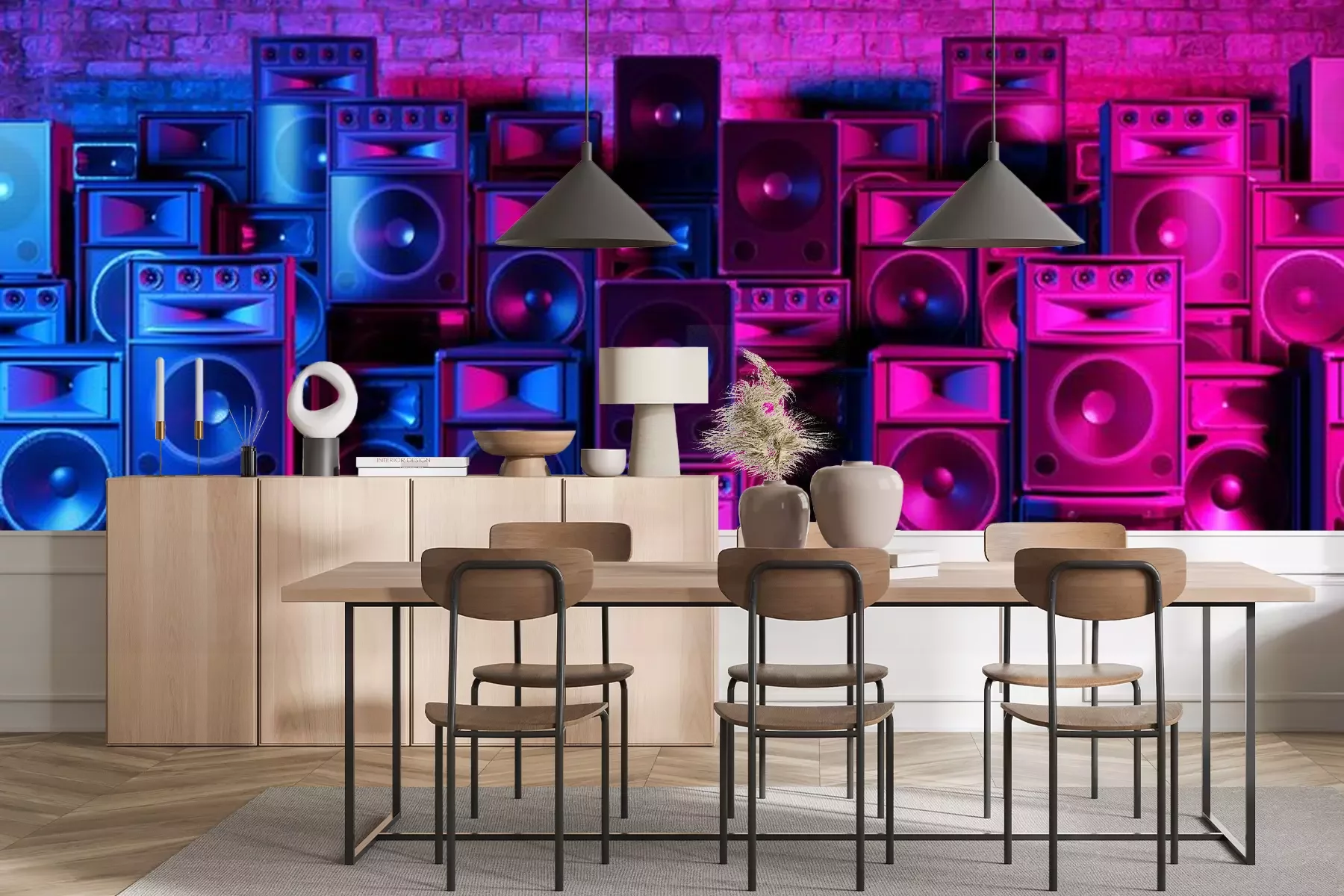 Fototapete Mit Neonlichtern beleuchtete Lautsprecher