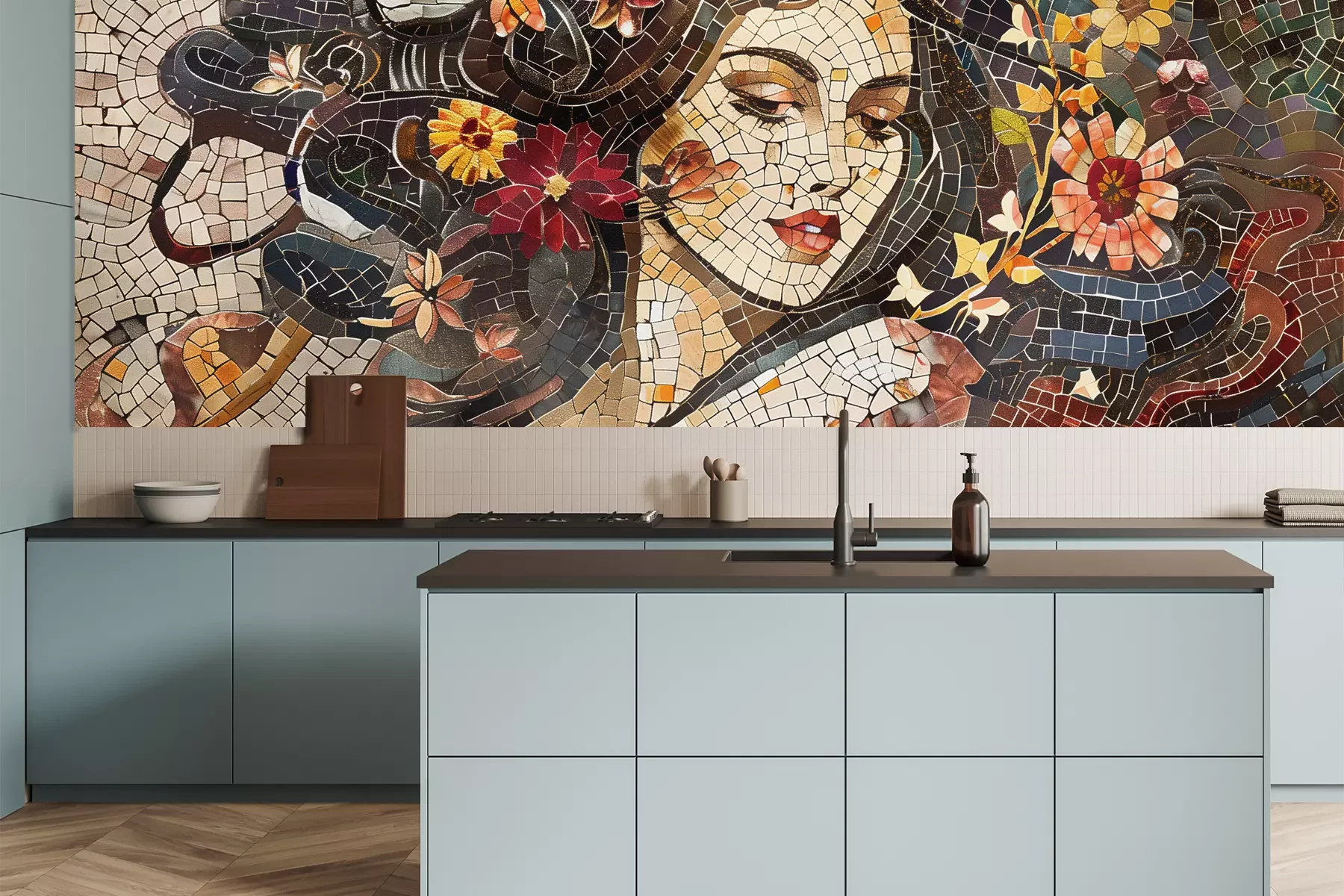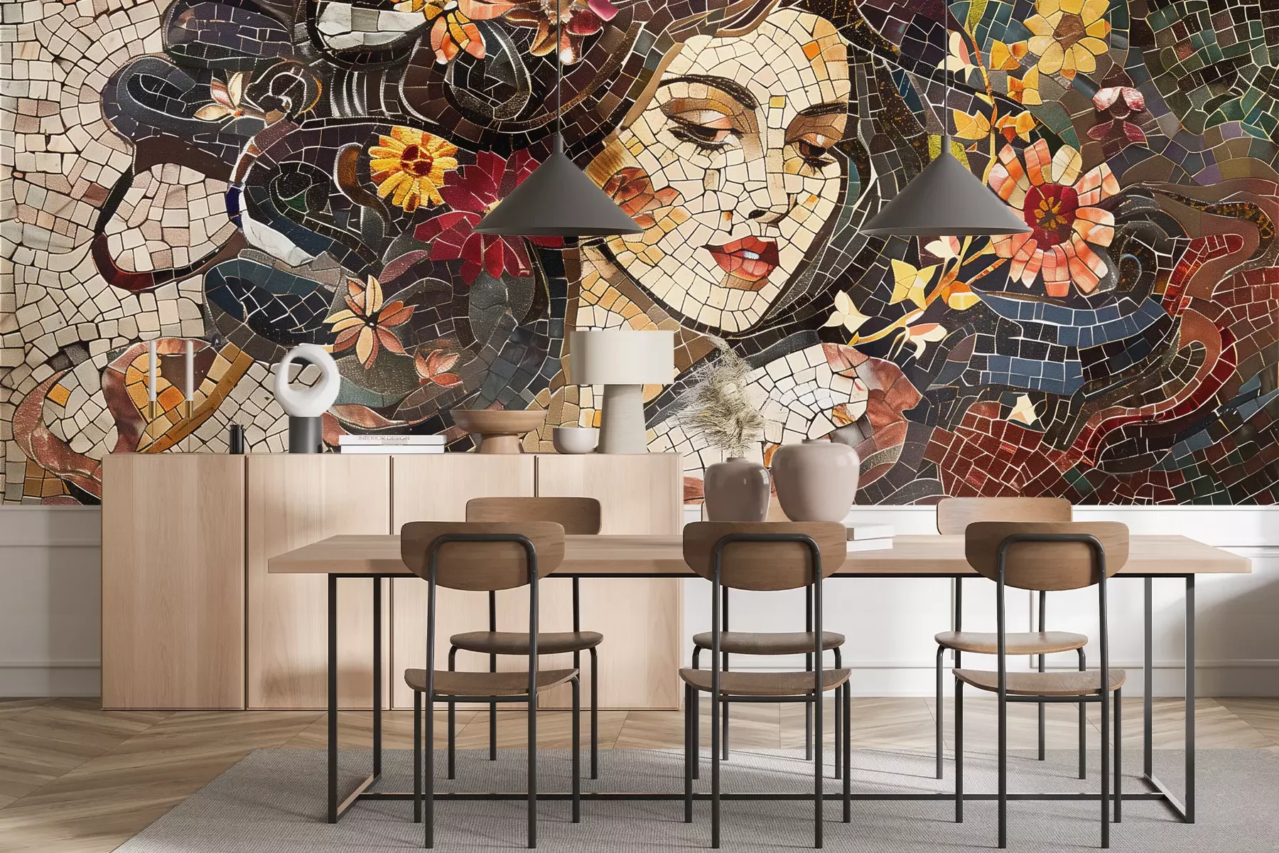 Das Material Premium+ besteht aus einer strukturierten Vinyl-Oberschicht und einem Trägermaterial (Vlies) mit einer Grammatur von 255 g/m², das kleine Unebenheiten der Wand zuverlässig kaschiert. Die feine Sandstruktur verleiht der Oberfläche eine luxuriöse Haptik, während das halbmatte Finish die Tiefe der Farben betont. Das Material ist dampfdurchlässig – so kann diese Fototapete auch in Küchen und Badezimmern eingesetzt werden. Die maximale Breite einer Tapetenbahn beträgt 100 cm. Bei größeren Abmessungen besteht die Fototapete aus mehreren gleich großen Bahnen. Der Kleber wird direkt auf die Wand aufgetragen, und die Fototapete wird auf Stoß angebracht, was für einen ästhetischen Effekt ohne sichtbare Fugen sorgt. Die Oberfläche ist pflegeleicht und kann bei Bedarf sanft mit einem feuchten Tuch abgewischt werden.