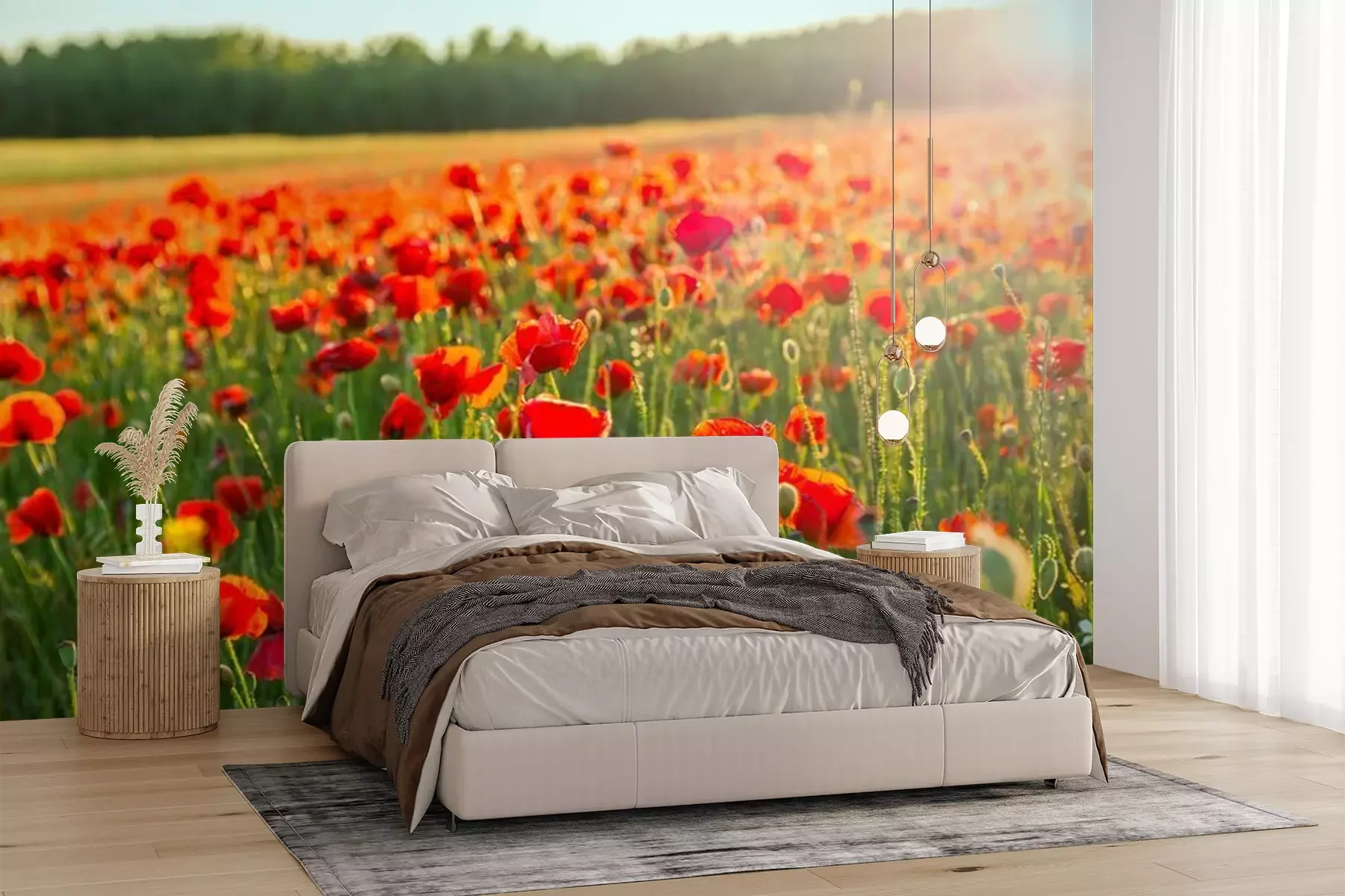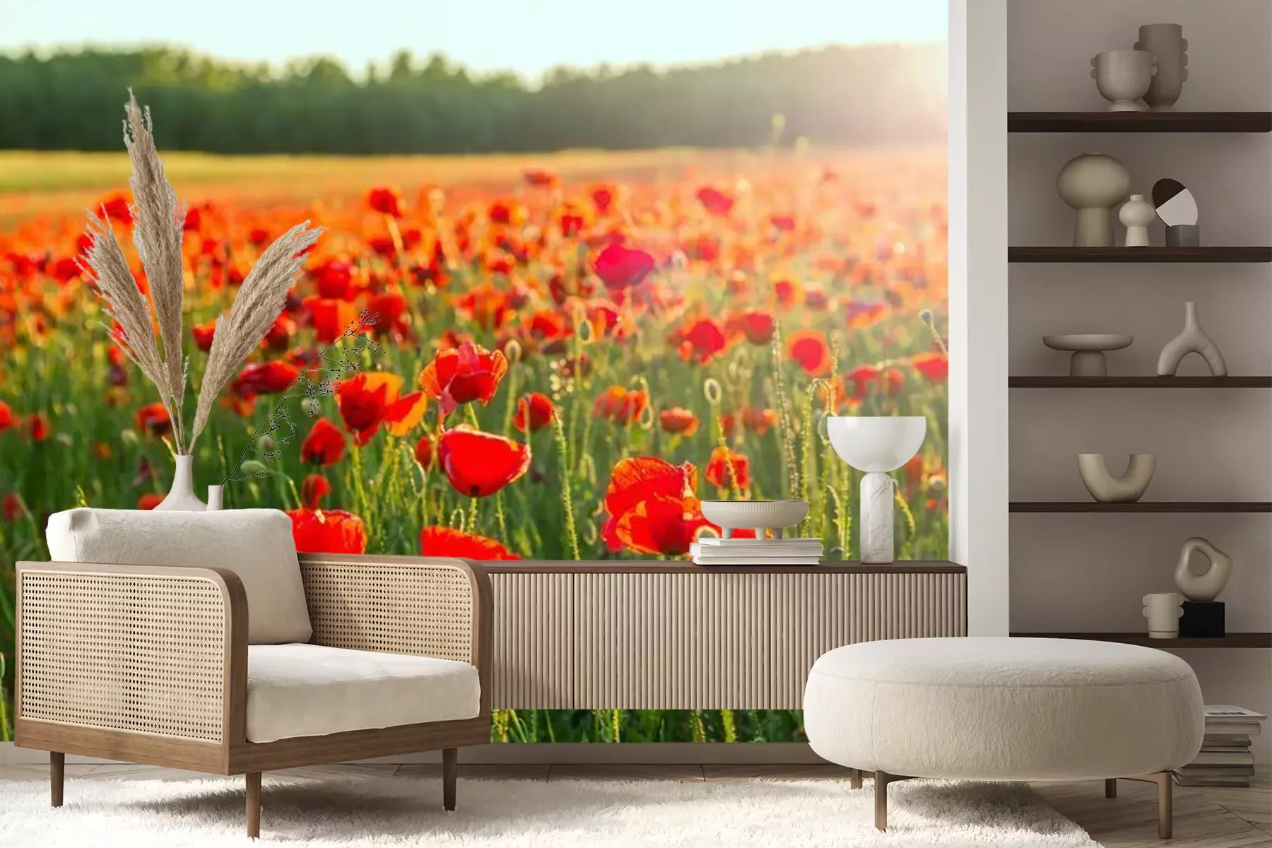Fototapete Mohnblumenfeld bei Sonnenaufgang